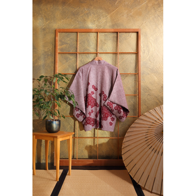 Viininpunainen solmuvärjätty haori luumunkukilla #210
