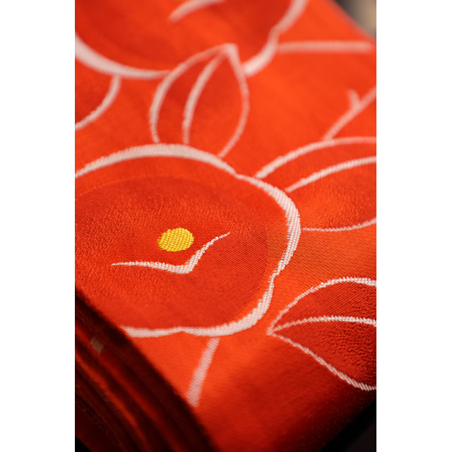 Tumman oranssi hanhaba-obi kameliakuviolla #616