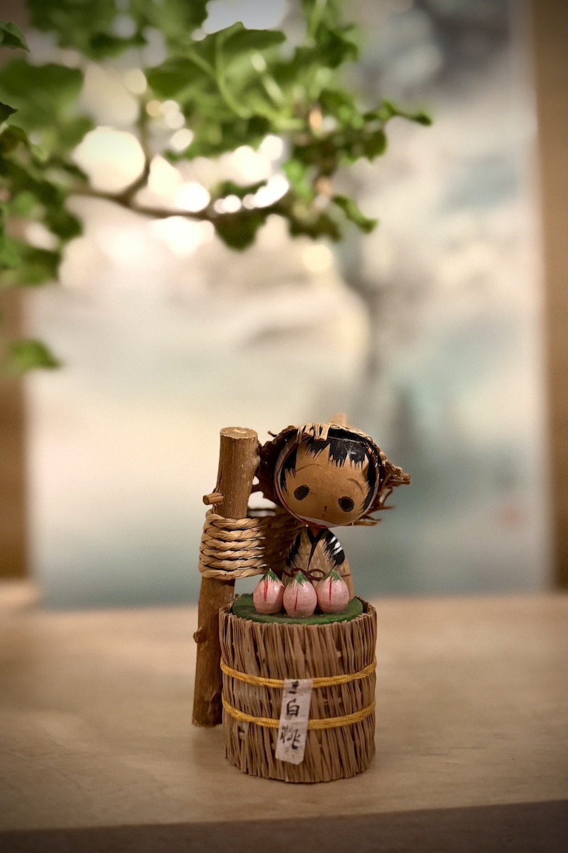 Tämä hurmaava pieni kokeshi kauppaa persikoita.
