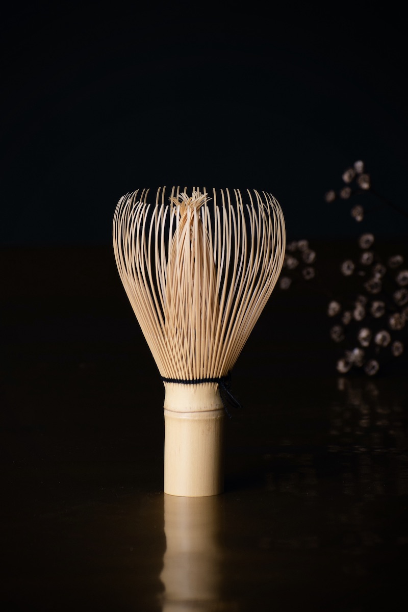 Yhdestä bambusta käsin vuoltu bambuvispilä, jossa on 80 erillistä ”varpua” täydellistä matchaa varten.