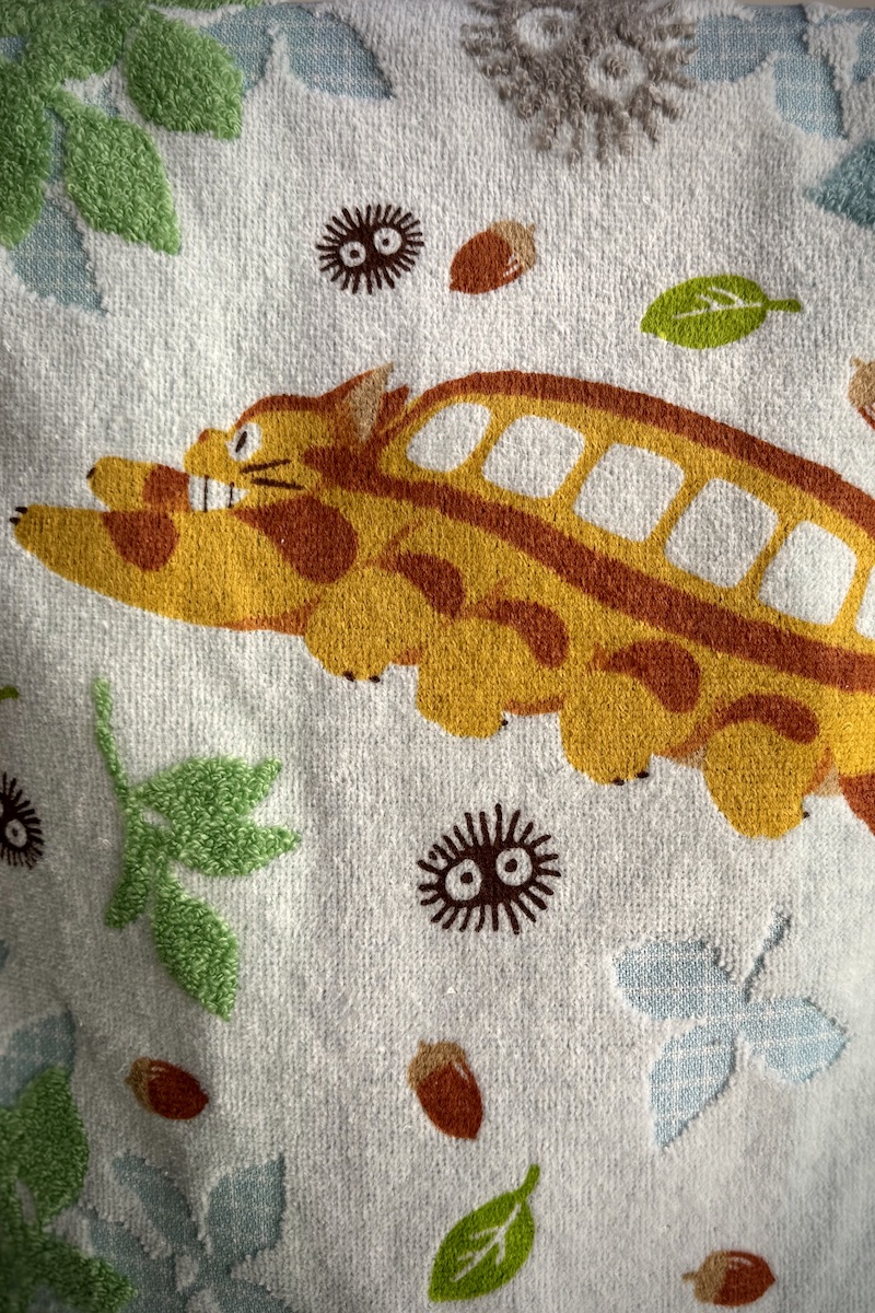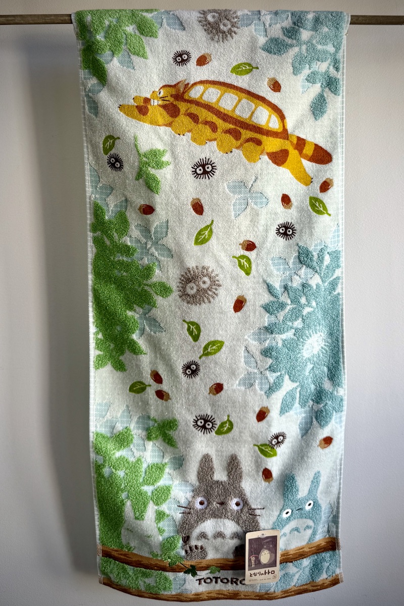 Ihanan pehmeä froteepyyhe Totoro-brodeerauksella ja sini-vihreällä puun lehvistöllä. Mukana myös kissabussi!