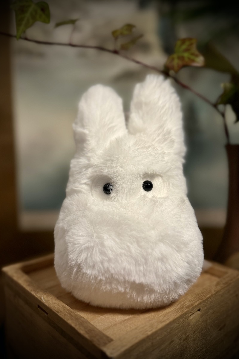 Hyvin kainaloon mahtuva valkoinen ja pehmeä Chibitotoro-pehmolelu.