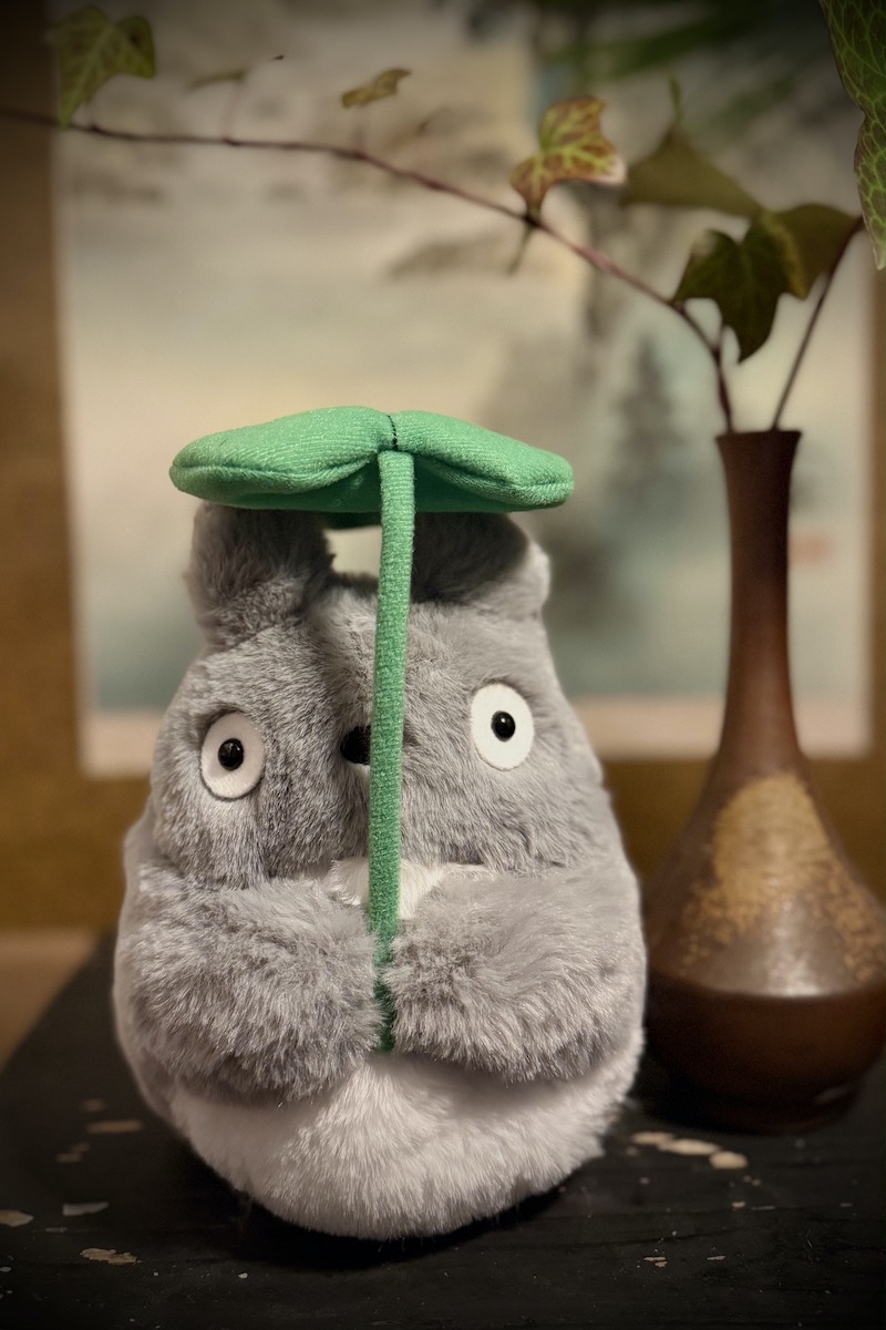 Hyvin kainaloon mahtuva harmaa ja pehmeä Oototoro-pehmolelu. Sillä on käsissään vihreä lehti.