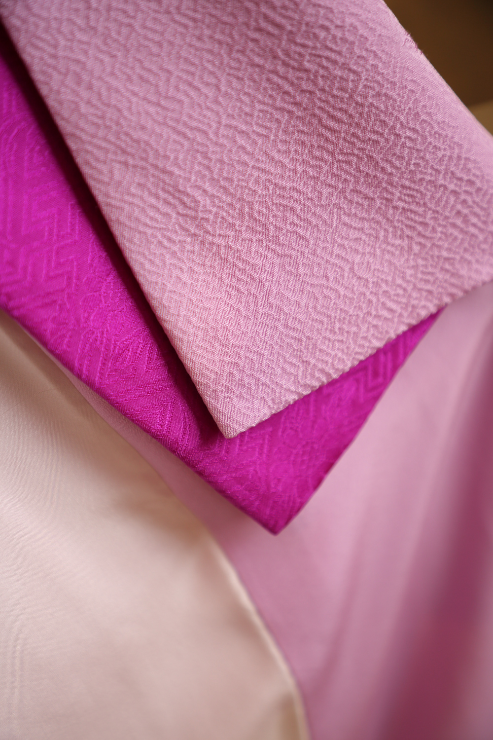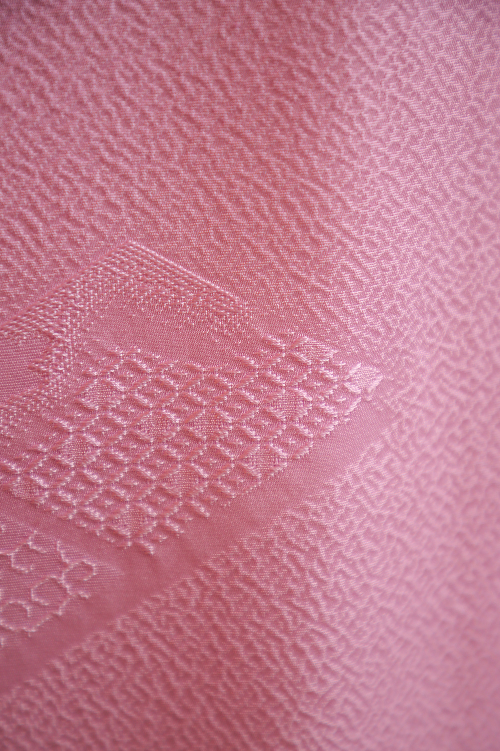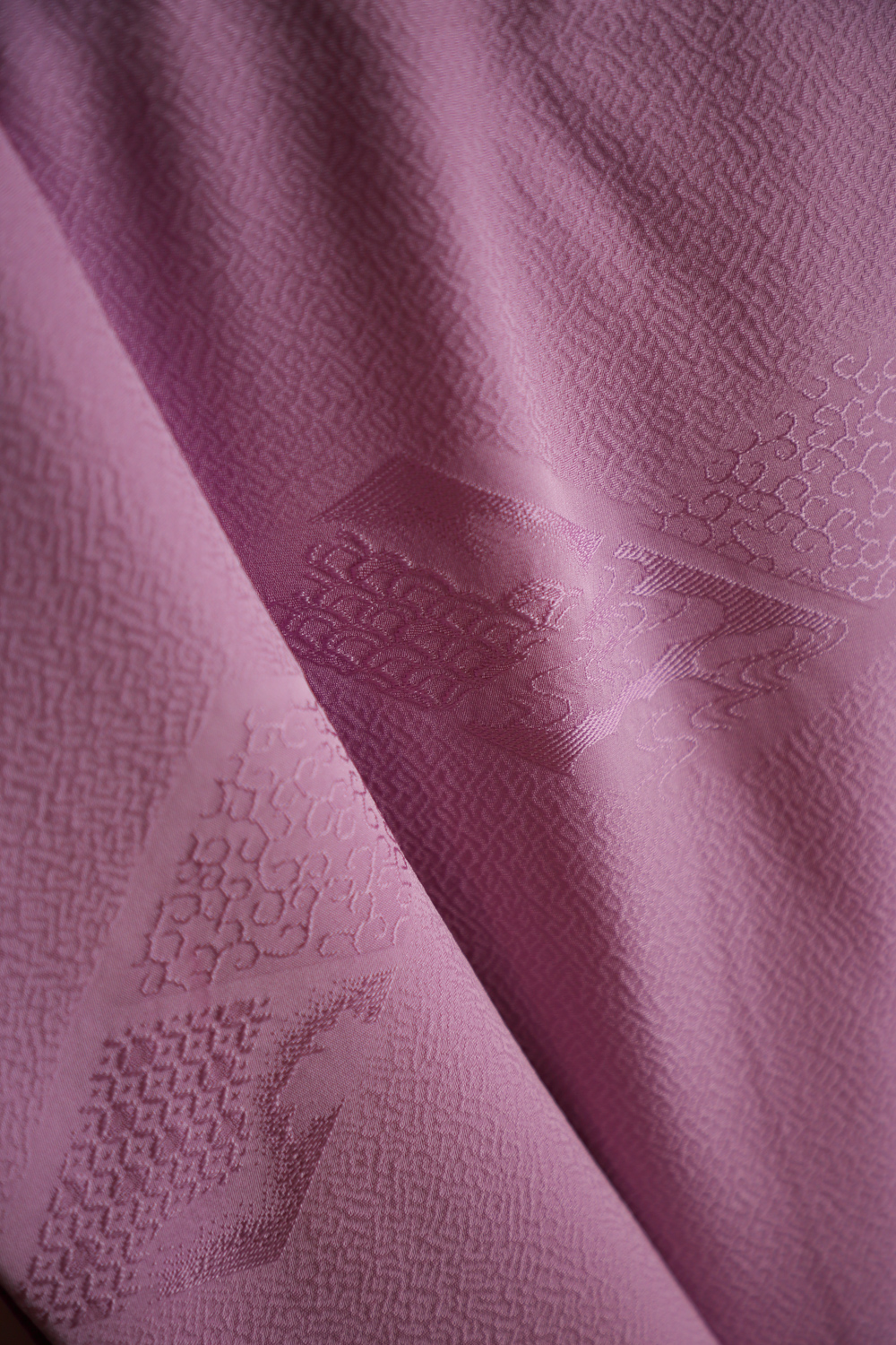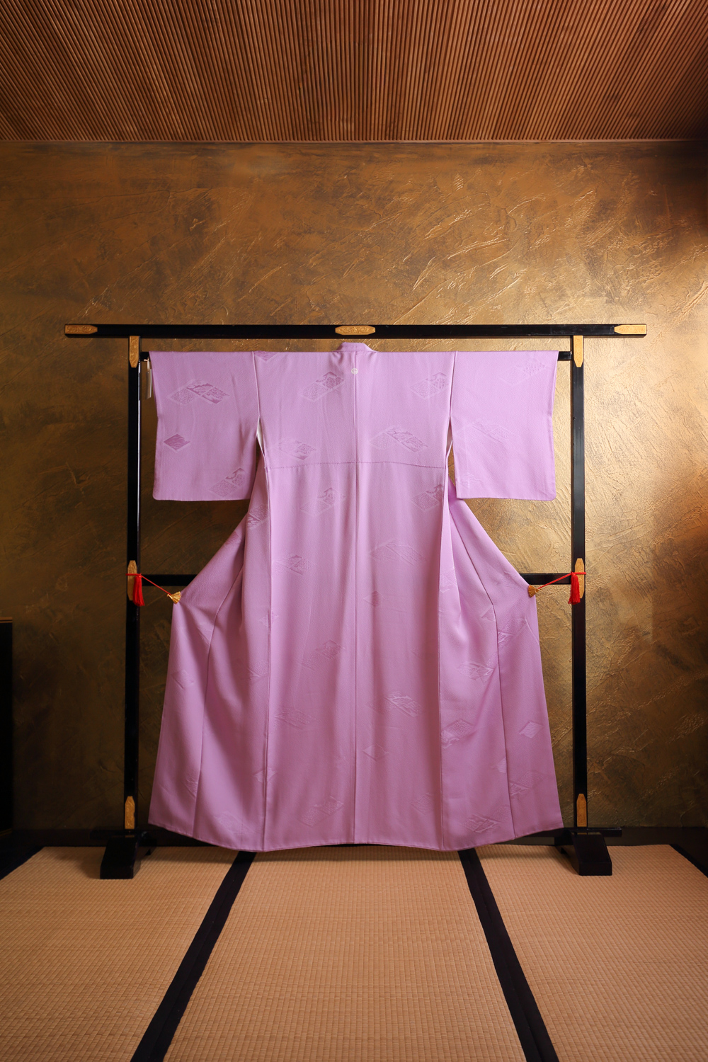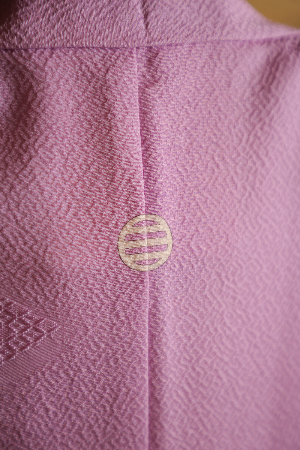Kirkas vaalean violetti iromuji-kimono, jonka kankaaseen on kudottu koristeellisia vinoneliöitä. Kangas on ihanan sileää, pehmeää ja painavaa. Kimonossa on tumman violetti koristekaulus. Kimonossa on valkoinen vuorikangas, jonka alareuna on violettia silkkiä.
