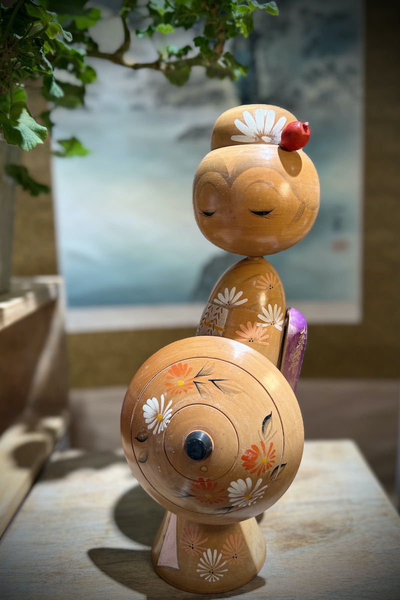 Tämä upeasi koristeltu kokeshi pitää käsissään varjoa ja on perinteistä japanilaista tanssia muistuttavassa asennossa.