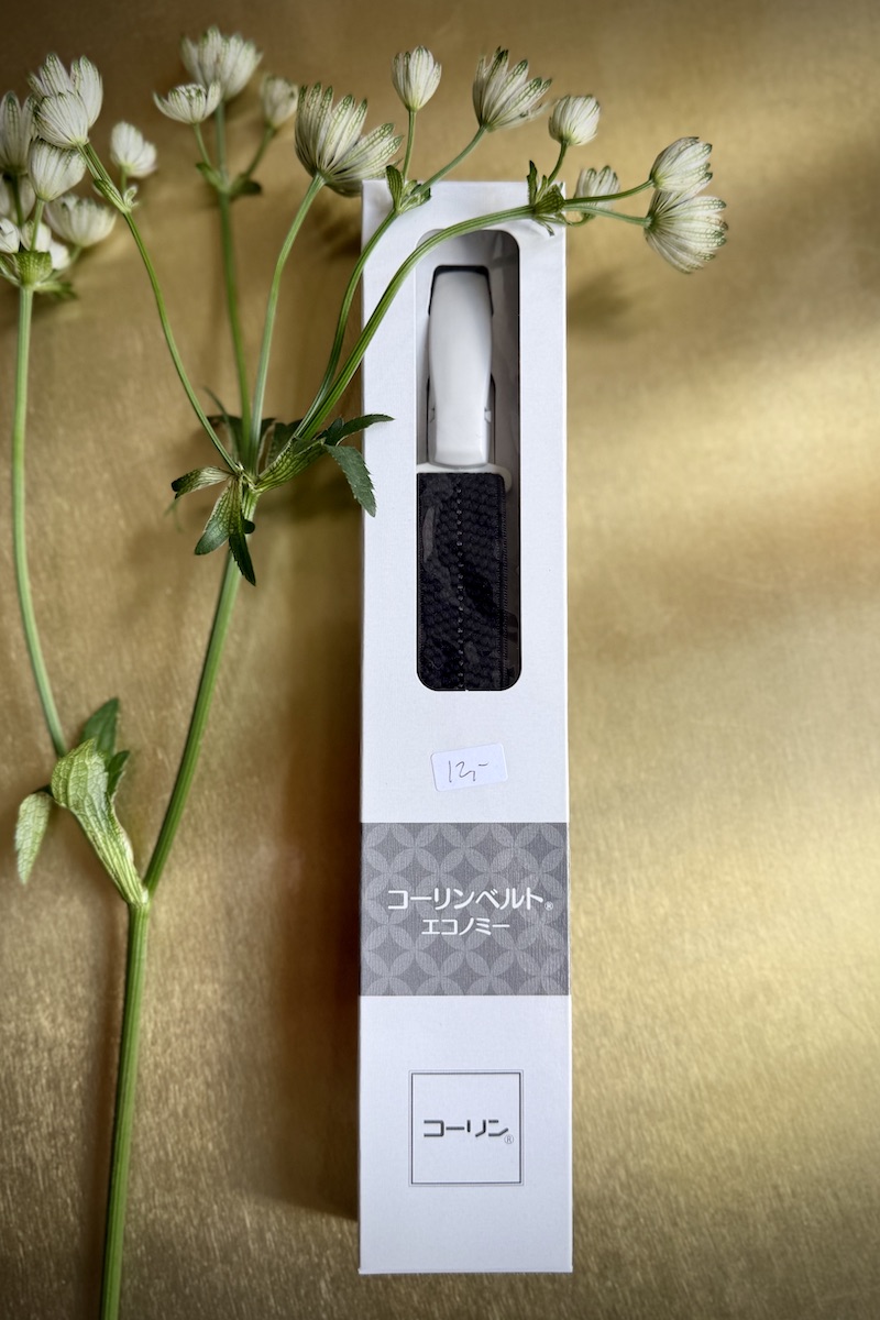 Korin-vyö on kimonon pukemiseen tarkoitettu elastinen vyö, jonka molemmissa päissä on klipsit. Tässä korin-vyössä klipsit ovat muovia, ja pakkauksessa on kuvallinen käyttöohje. Vyön pituuden voi säätää omaan vyötärönympärykseen sopivaksi. Vyön mitta venyttämättä on 30-56 cm.