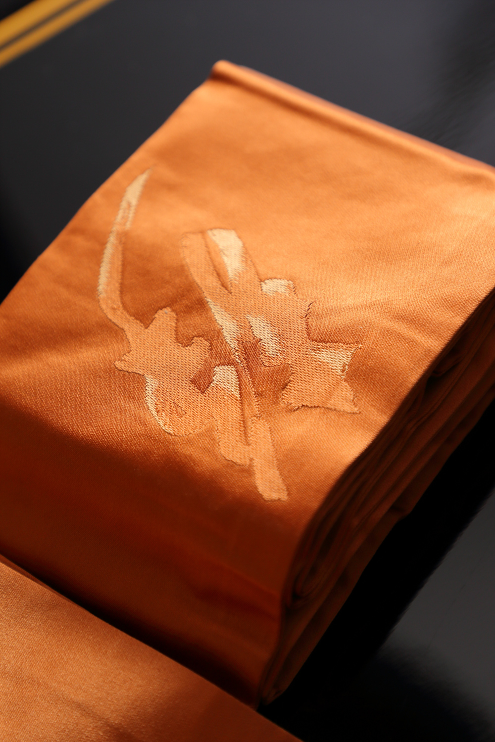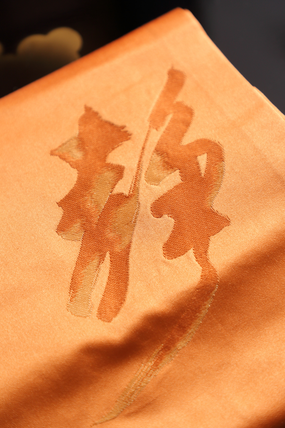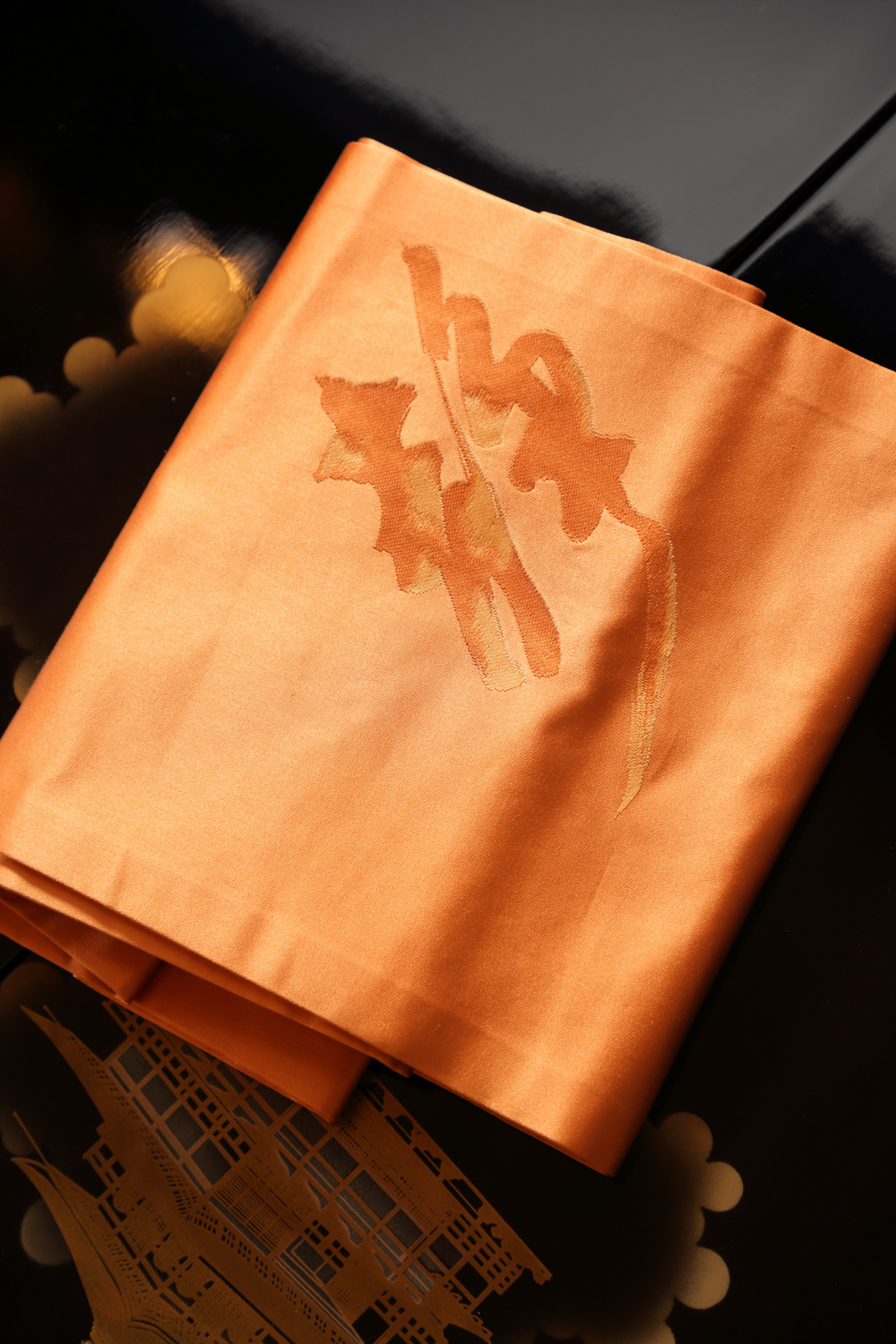 Lämpimän kullanoranssi nagoya obi, johon on kuvattu hiljaisuutta (shizuka) tarkoittava kirjoitusmerkki eli kanji. Kuvio on kohdennettu leveään osaan (otaiko) ja vyötärölle. Obi on molemmin puolin samaa, yksiväristä kangasta.