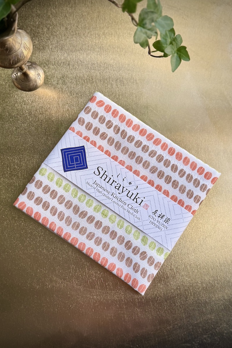 Mitat 30x40cm. Materiaali 85% viskoosia, 15% puuvillaa. Valmistusmaa Japani. Kahvipapukuvio.