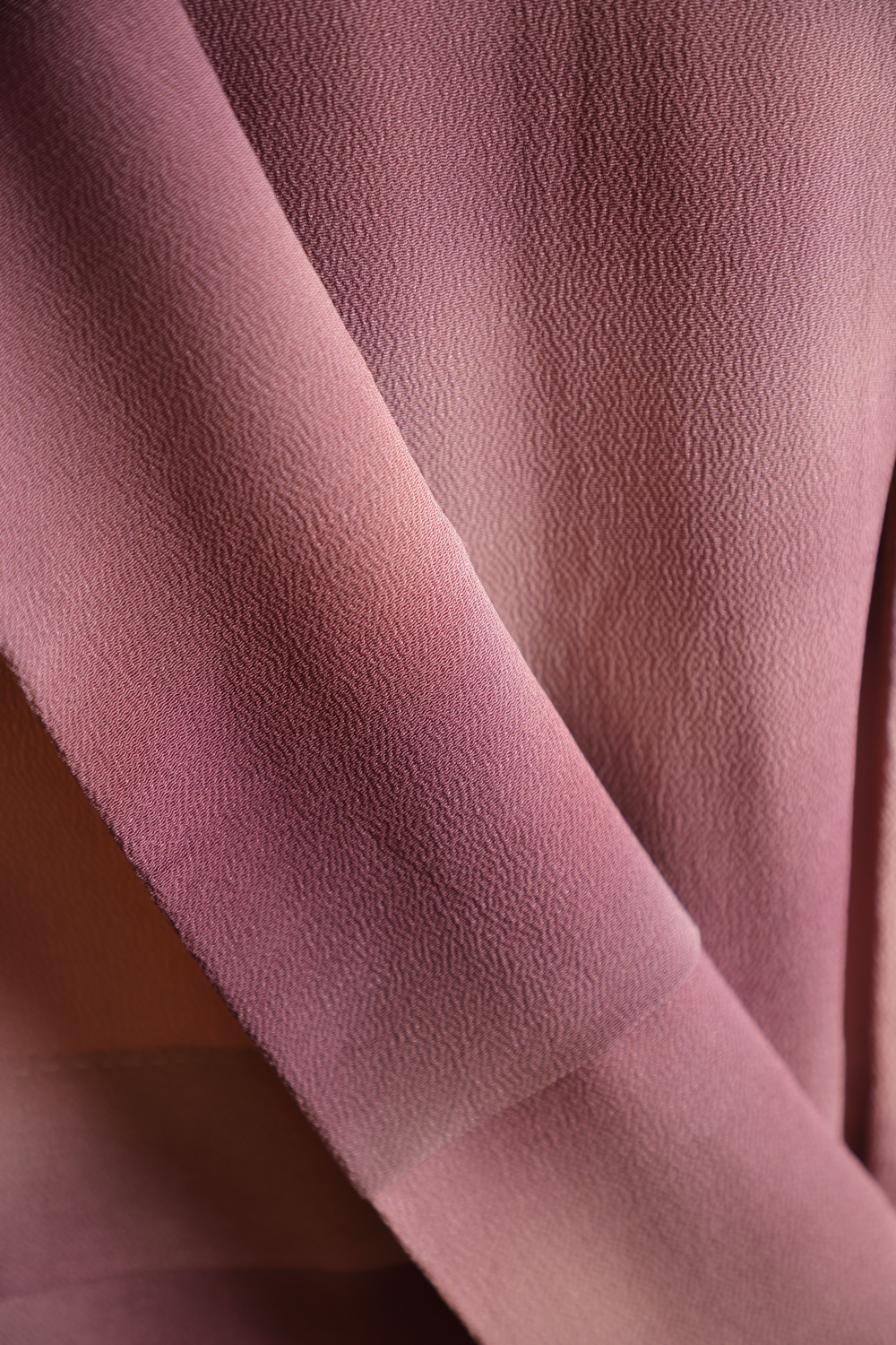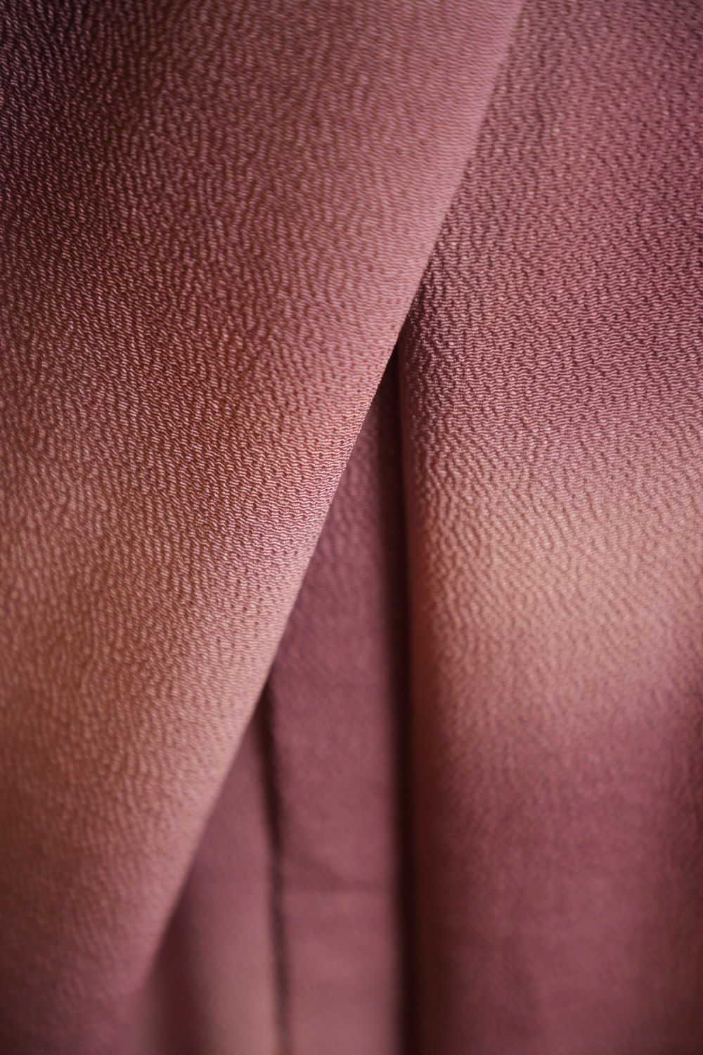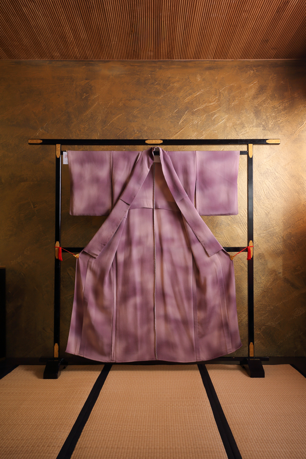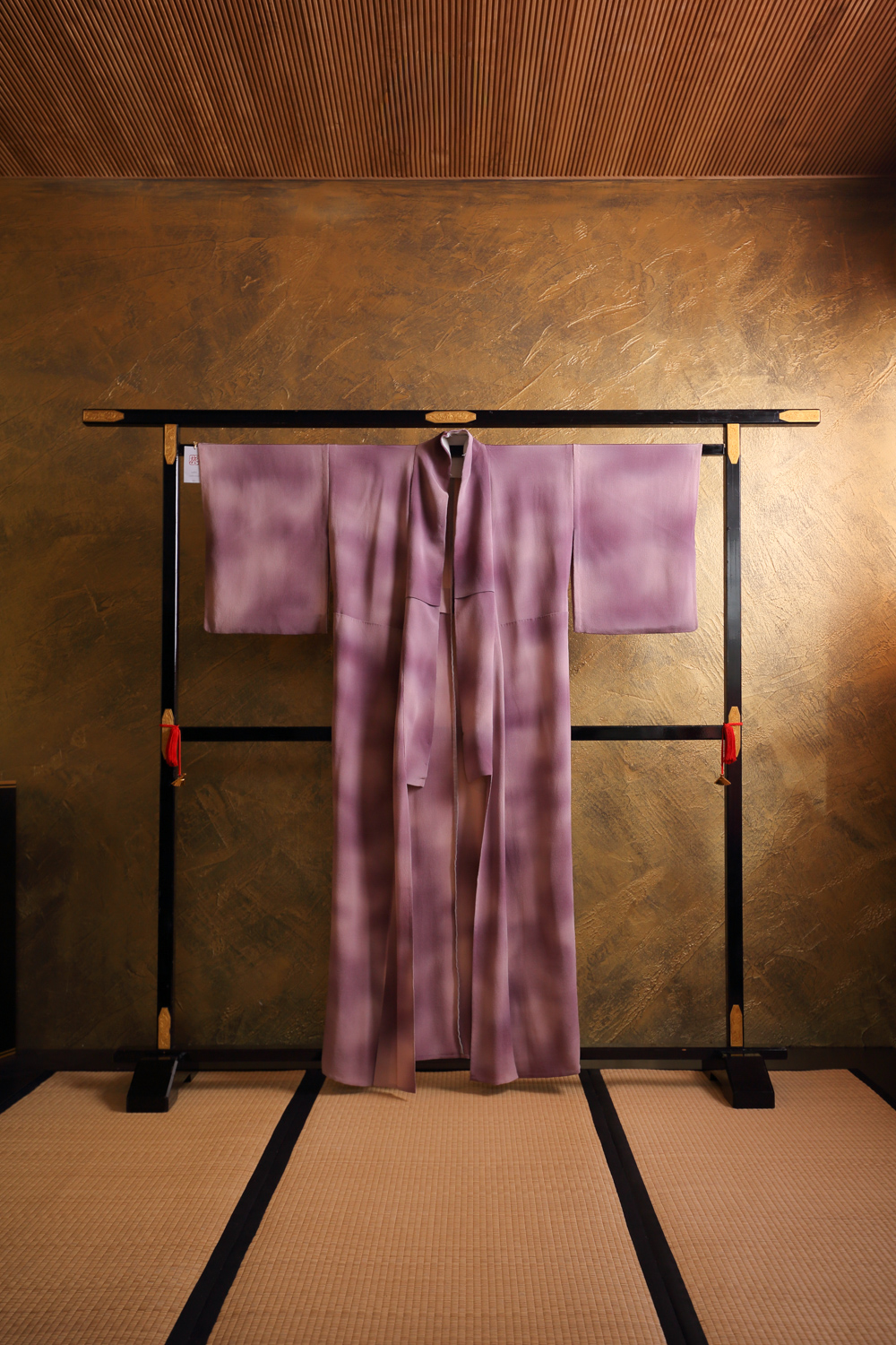 Violetti iromuji-kimono, jonka väri läikehtii vaaleasta tummaan. Kangas on pehmeää, painavaa ja kevyesti kiiltävää. Kimonon kauluksessa on valkoinen vuorikangas, mutta kimono on muuten vuoraamaton.