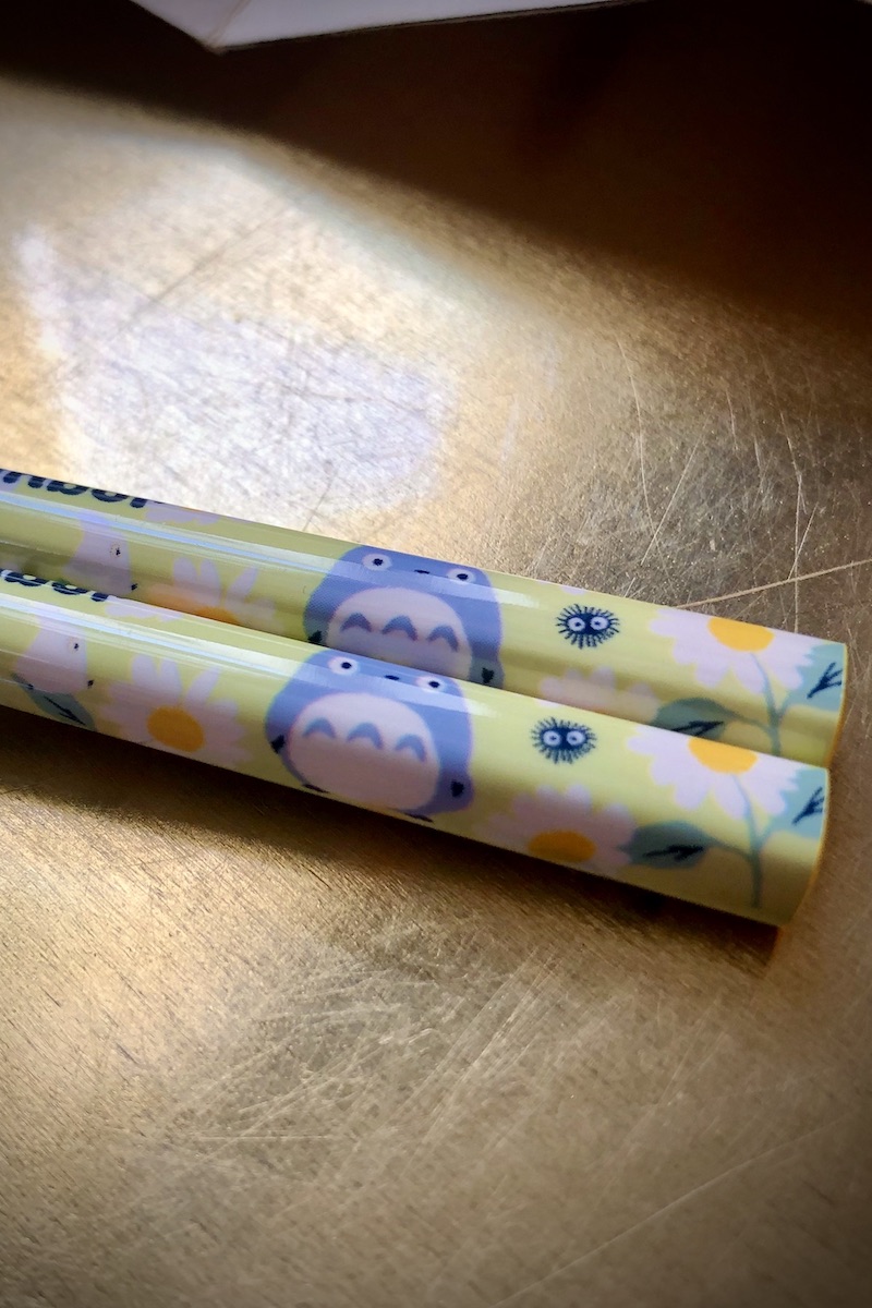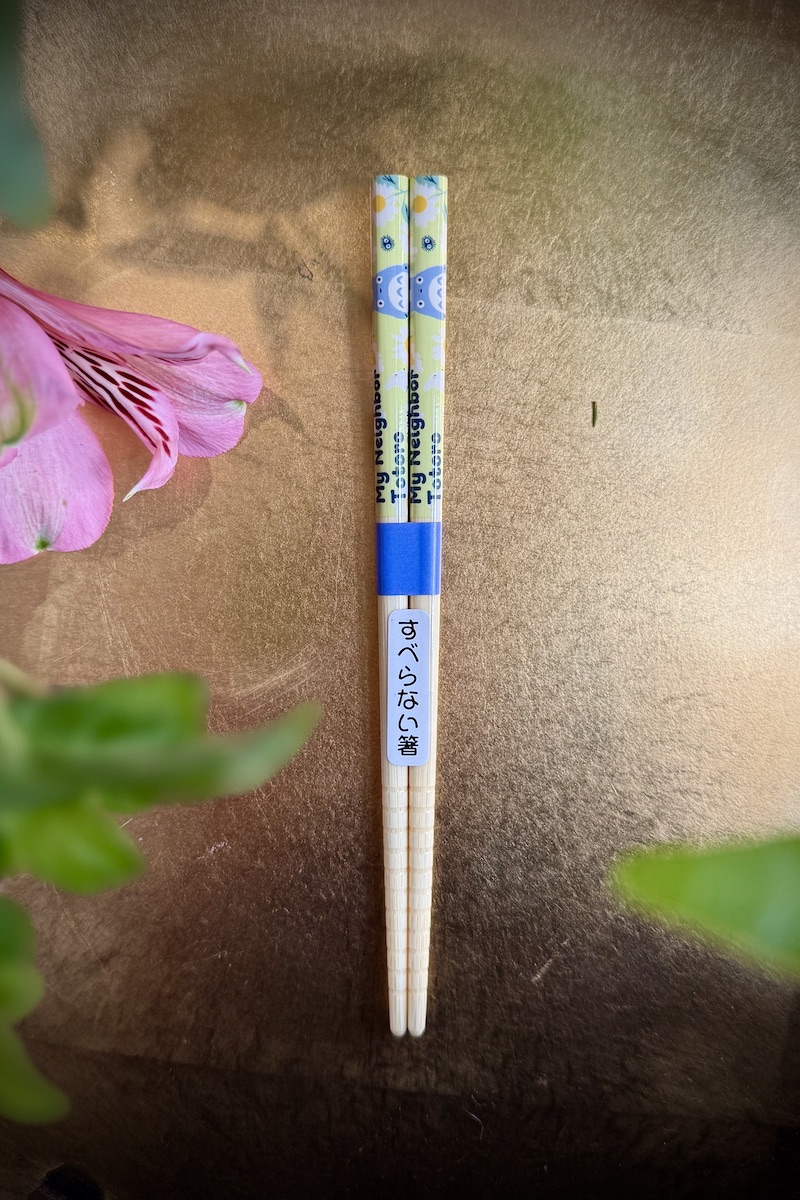 Pienille käsille sopivat bambuiset syömäpuikot, joissa kukkien keskellä seikkailevat niin Oototoro, Chibitotoro kuin pikkuinen Susuwatari-nokipallerokin.