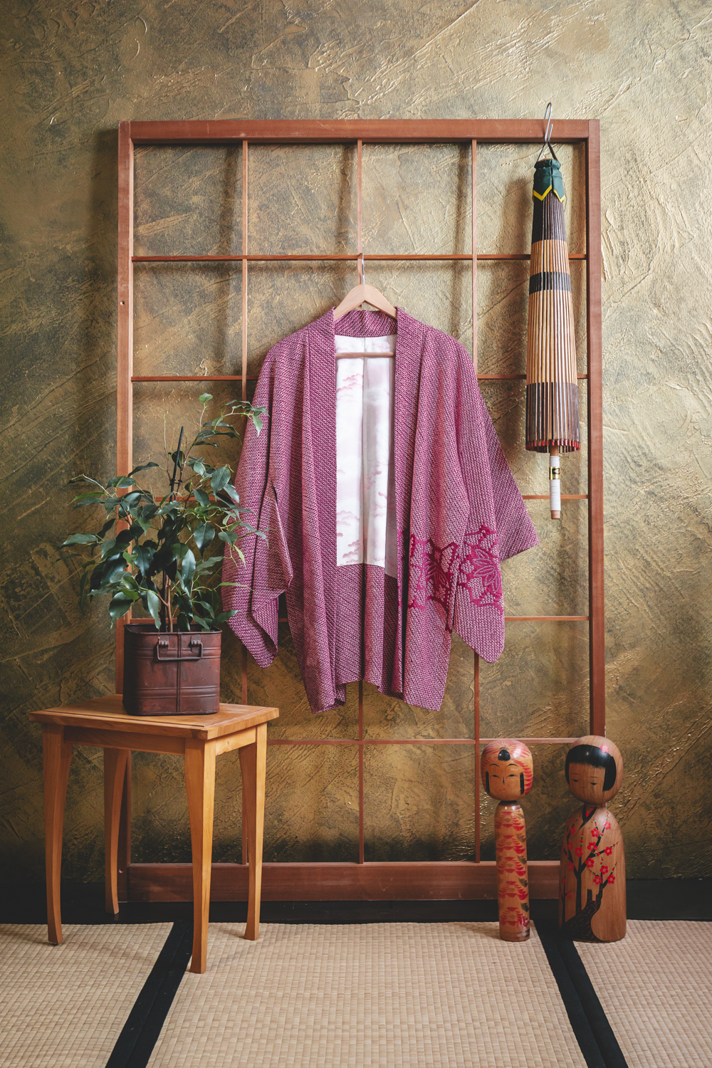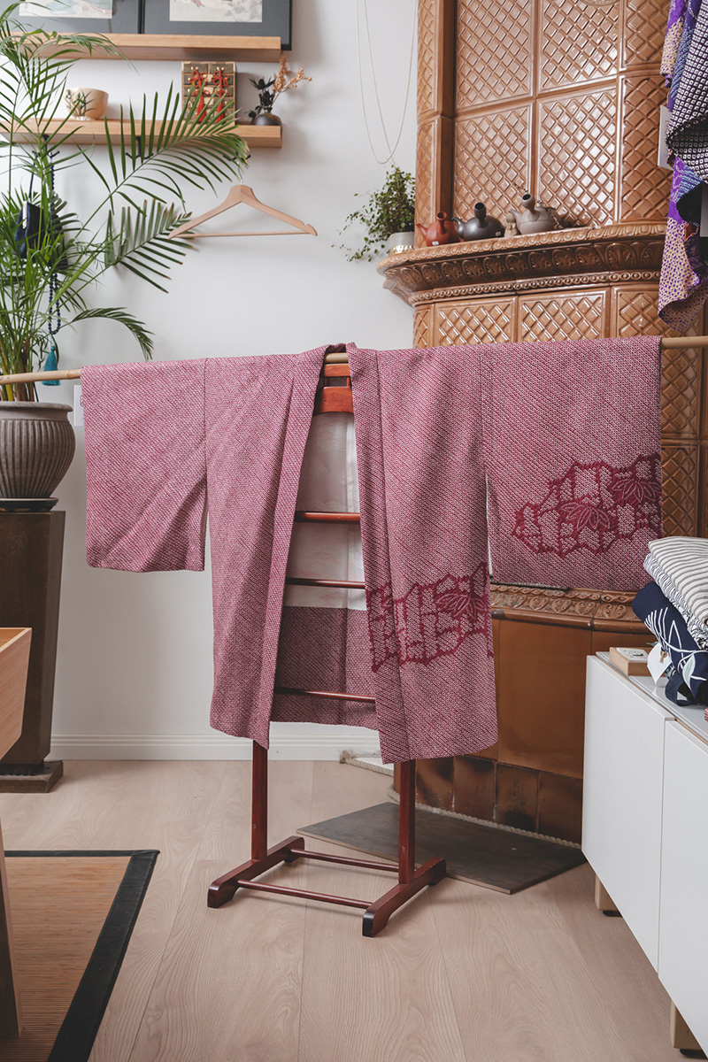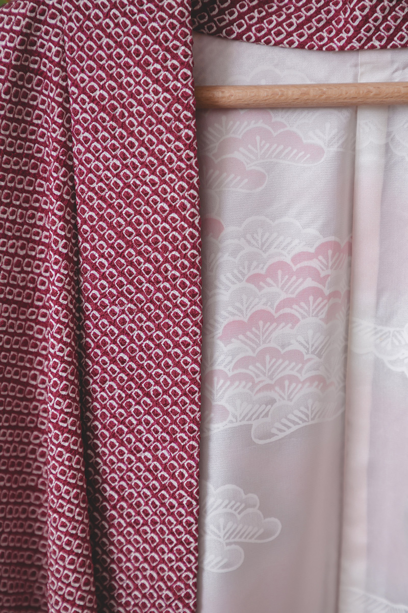 Luumunpunainen solmuvärjätty haori, johon on kuvatu bambunlehtiä geometrisen aiheen (kenties bambumetsän?) eteen. Kangas tuntuu pehmeältä ja kuohkealta. Valkoiseen vuorikankaaseen on kuvattu männyn havuja valkoisen ja vaaleanpunaisen sävyissä.