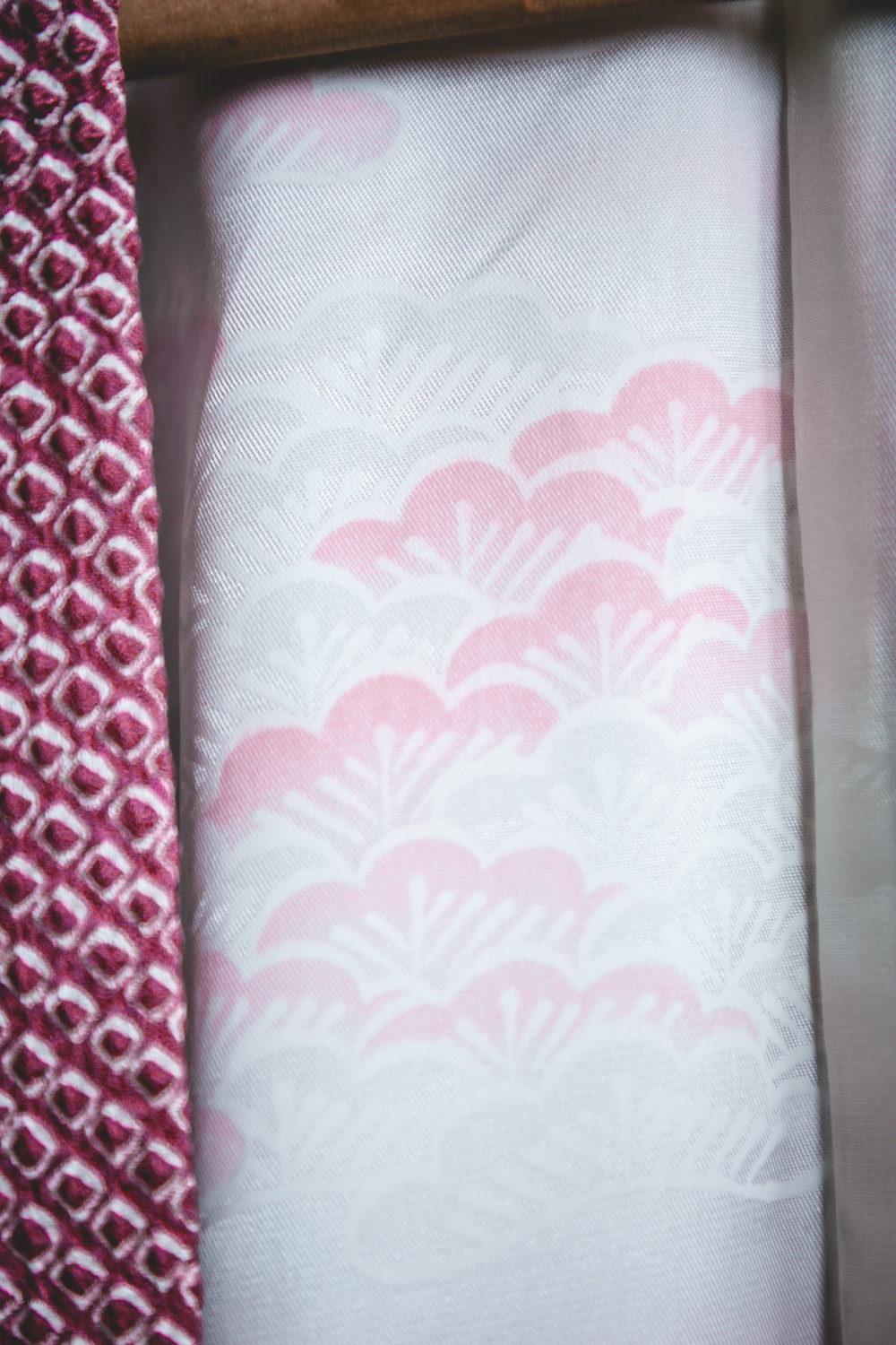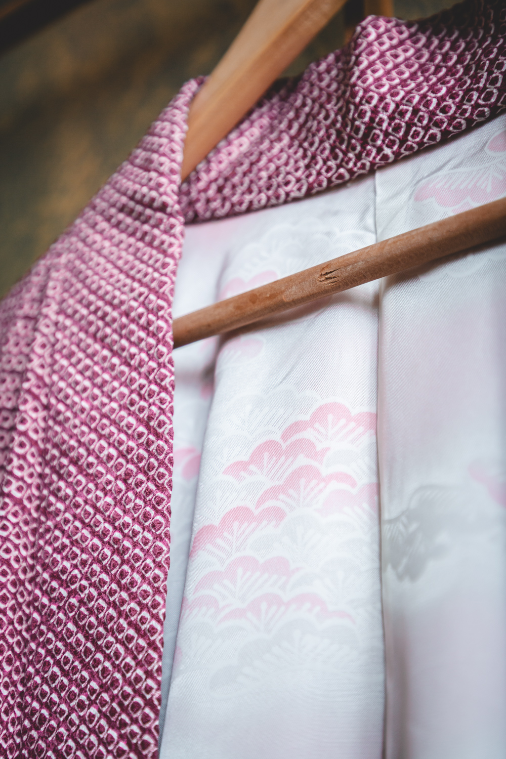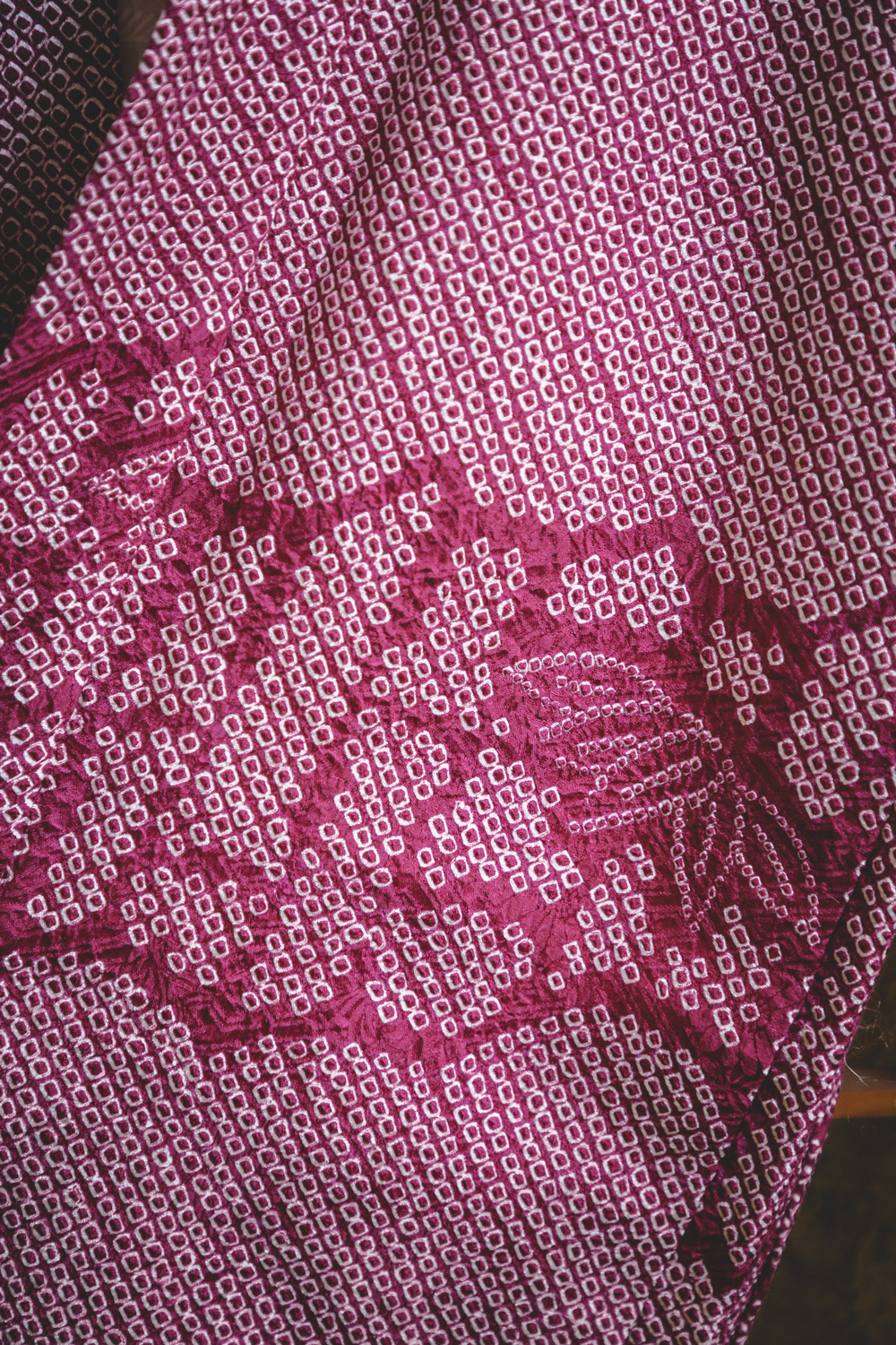 Luumunpunainen solmuvärjätty haori, johon on kuvatu bambunlehtiä geometrisen aiheen (kenties bambumetsän?) eteen. Kangas tuntuu pehmeältä ja kuohkealta. Valkoiseen vuorikankaaseen on kuvattu männyn havuja valkoisen ja vaaleanpunaisen sävyissä.