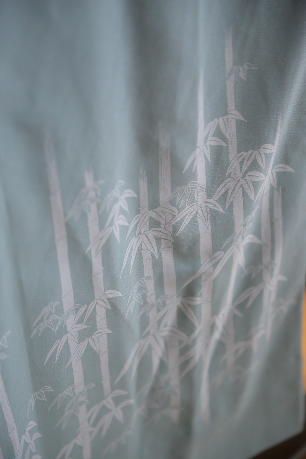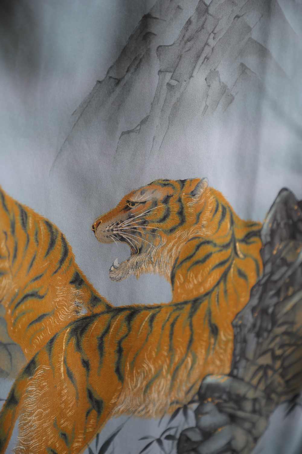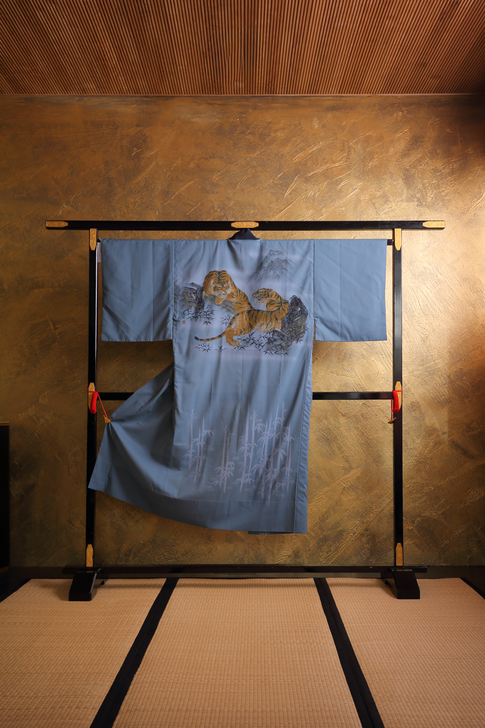Petroolinsininen miesten aluskimono eli juban, jonka selkään on kuvattu kaksi tiikeriä. Kuvioon on maalattu käsin kultaisia yksityiskohtia. Kimonon helmassa on bambukuvio. Kimonossa on tummansininen koristekaulus. Kangas on sileää, pehmeää ja kevyttä. Kimono on vuoraamaton.