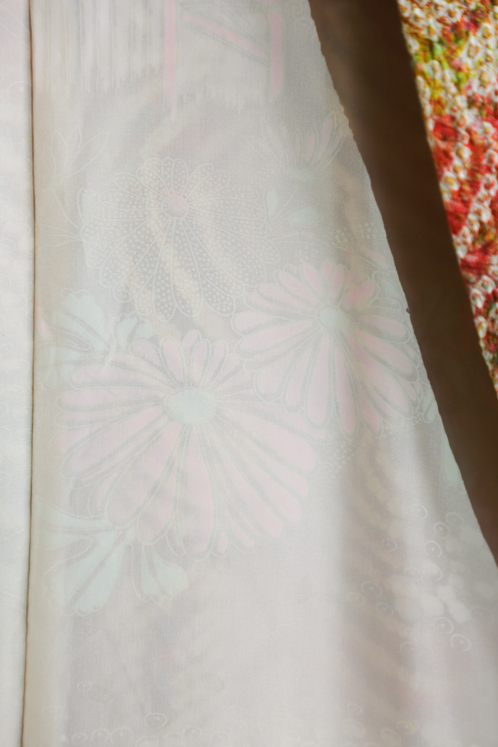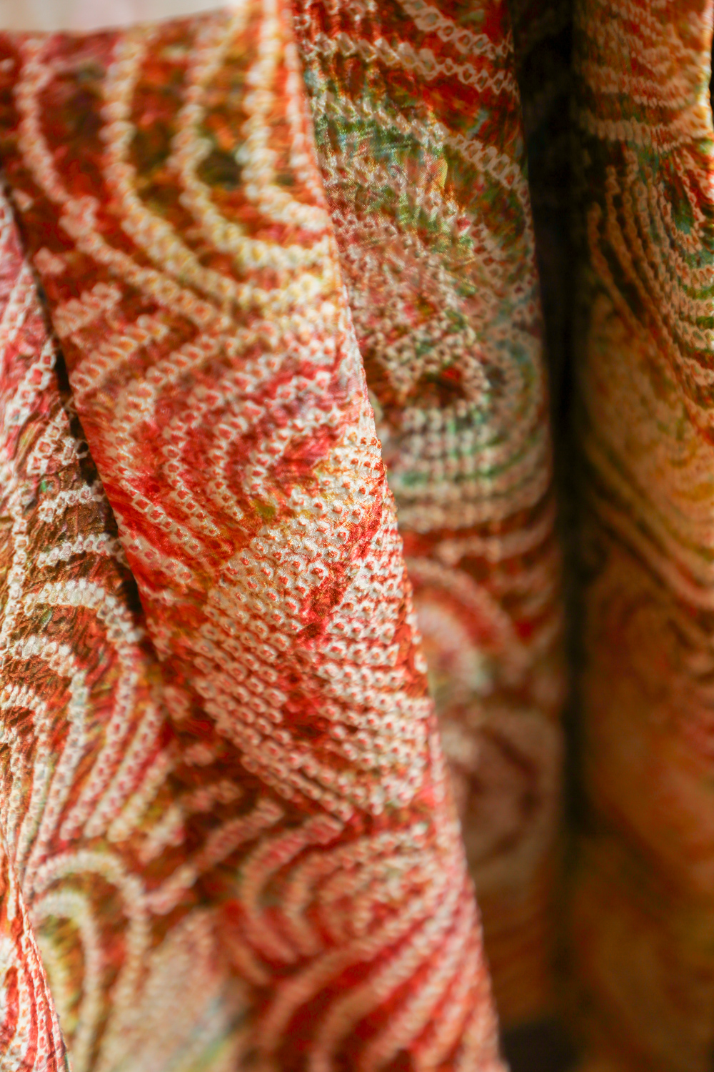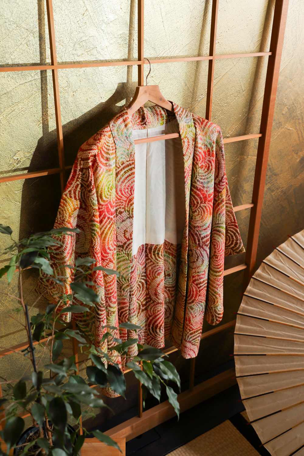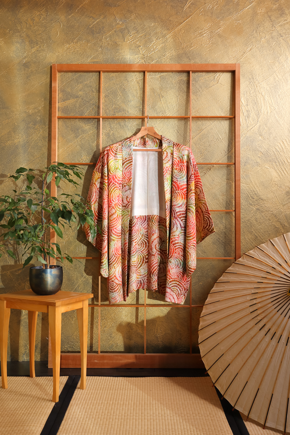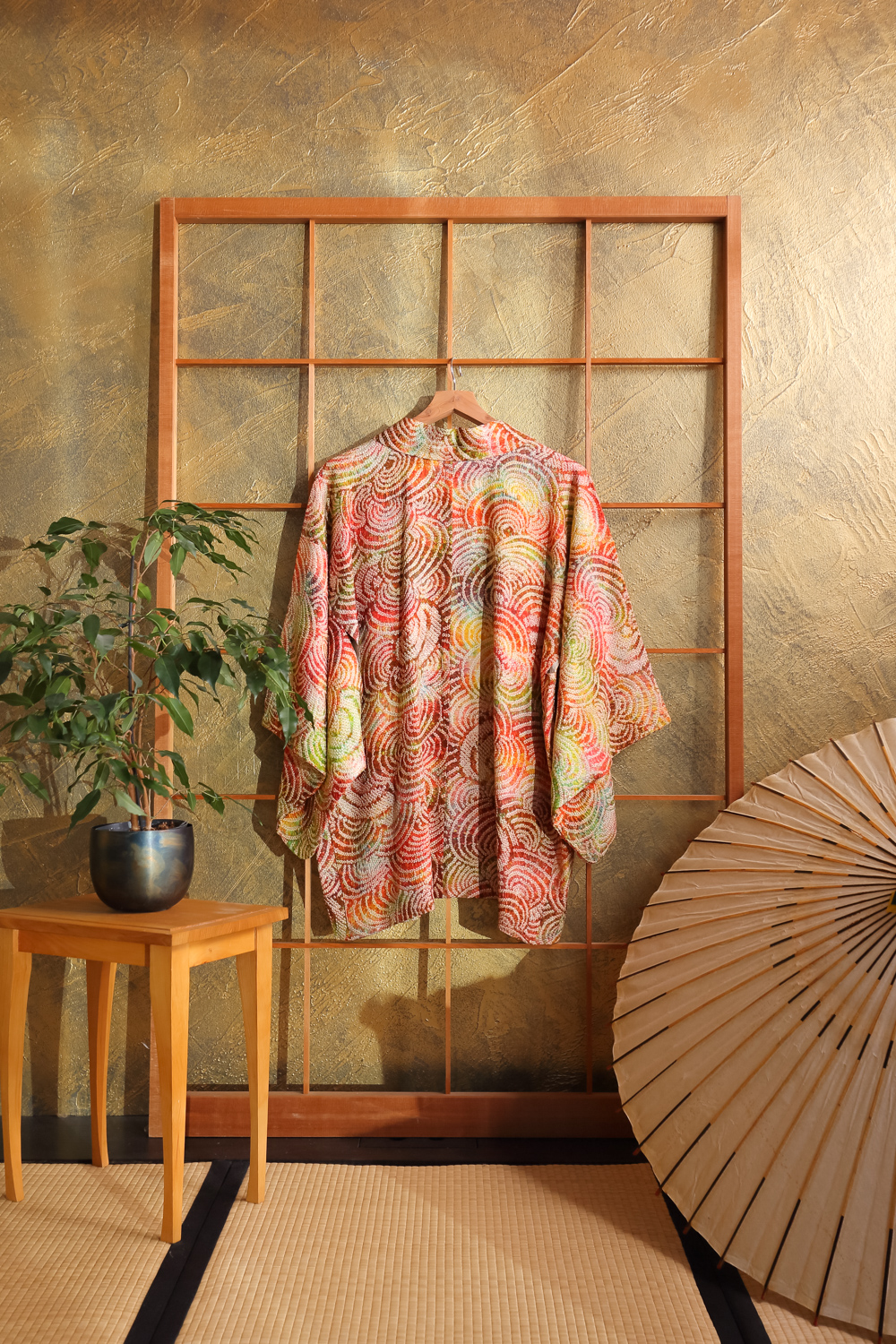 Upea, loimuava solmuvärjätty haori, jossa on abstrakti pyöreä kuviointi. Kangas on värjätty erilaisilla keltaisen, punaisen, vihreän ja sinisen sävyillä. Kangas tuntuu pehmeältä ja miellyttävältä. Valkoisessa vuorikankaassa on vaaleanpunainen himmeä kukkakuvio.