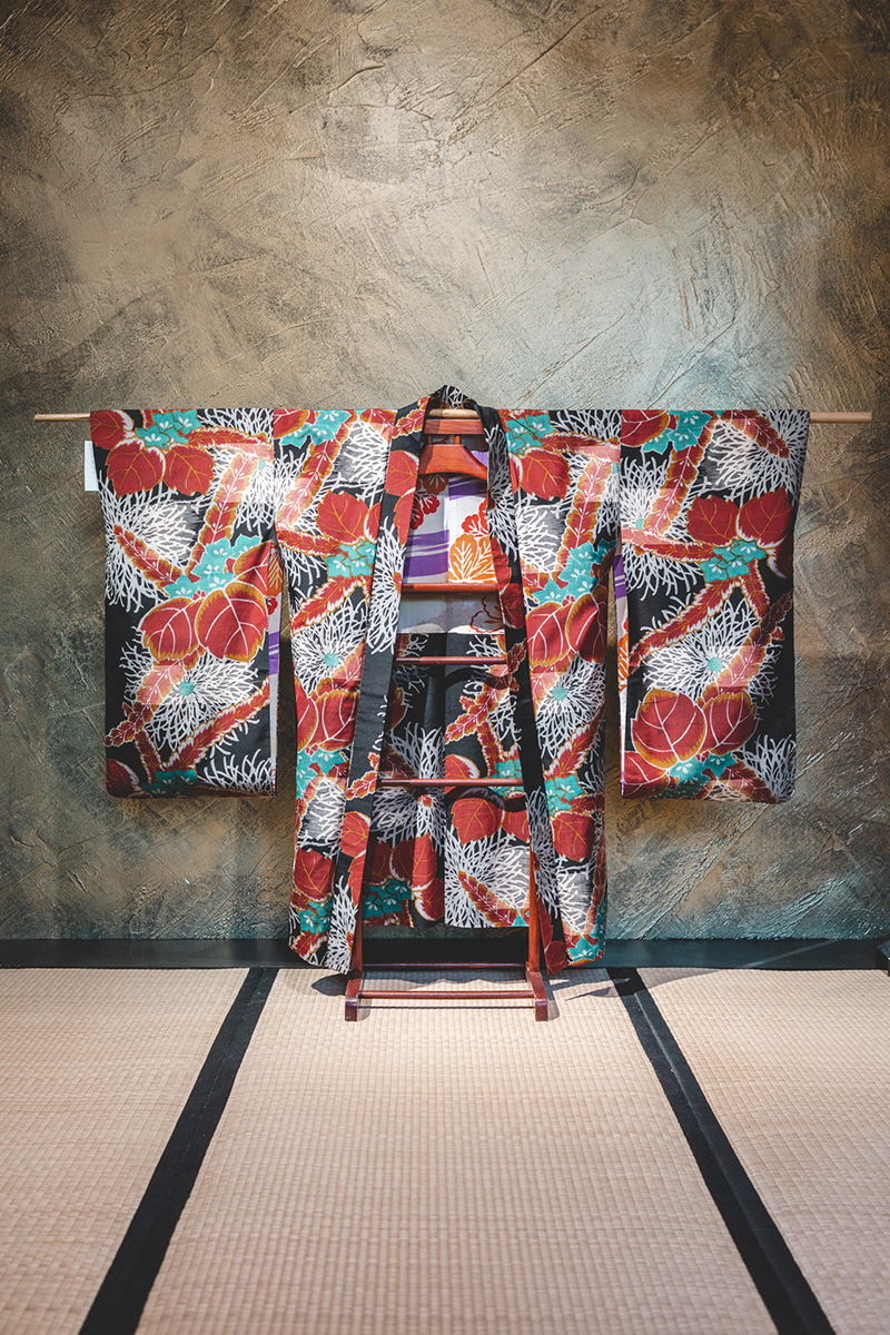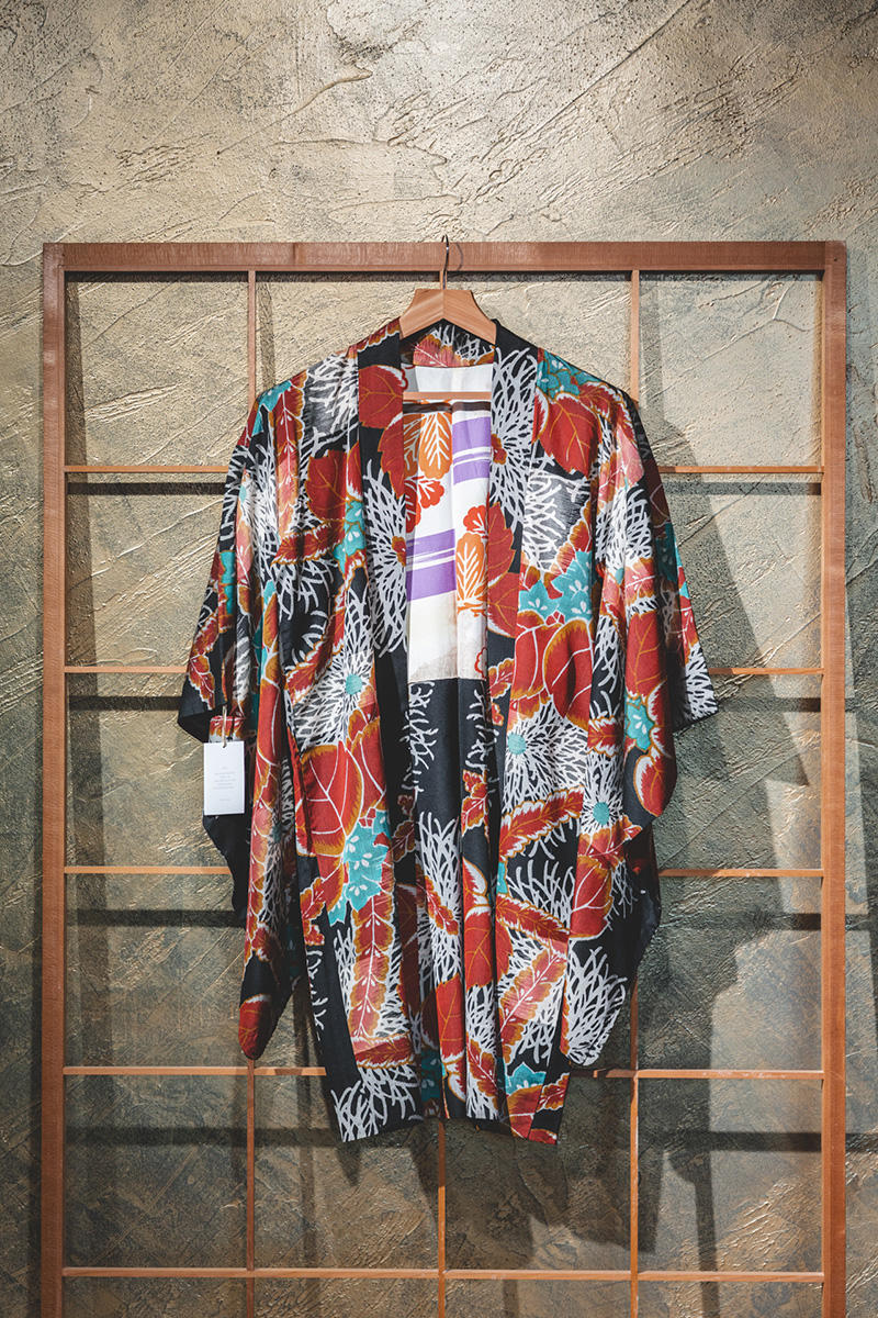 Huomaathan, että haori on tarkoitettu jäämään edestä hieman auki. Haoria voi käyttää myös kääntötakkina, jolloin sisävuorin kuvioitu kangas tulee näkyviin. Voimme lisätä haoriin suloiset solmimisnauhat (8€), joilla haorin saa sidottua edestä väljästi.