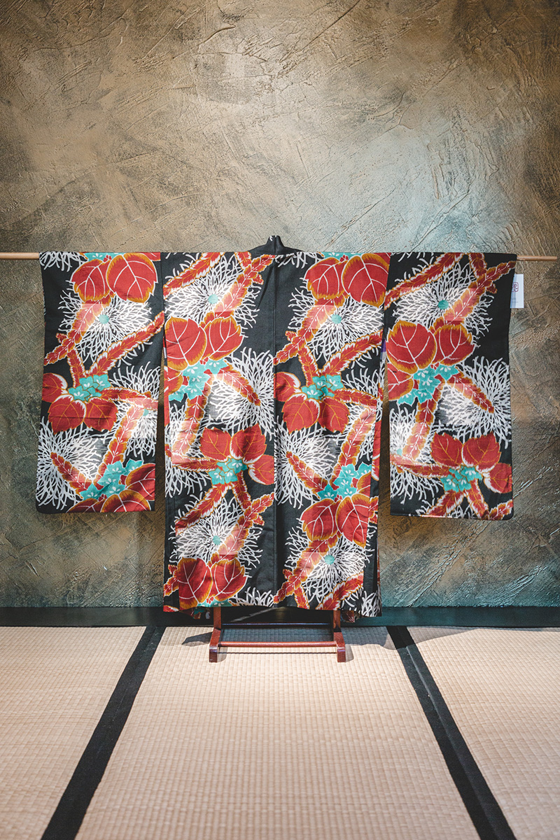 Musta antiikkihaori, johon on kuvattu sinisiä kukkia ja punertavia lehtiä. Kangas on värjätty meisen-tekniikalla, jossa langat sapluunavärjätään ennen kankaan kutomista. Kangas on sileää ja hieman jäykkää. Haorissa on valkoinen vuorikangas, jossa on punaisia kasveja ja violetteja sumupilviä.