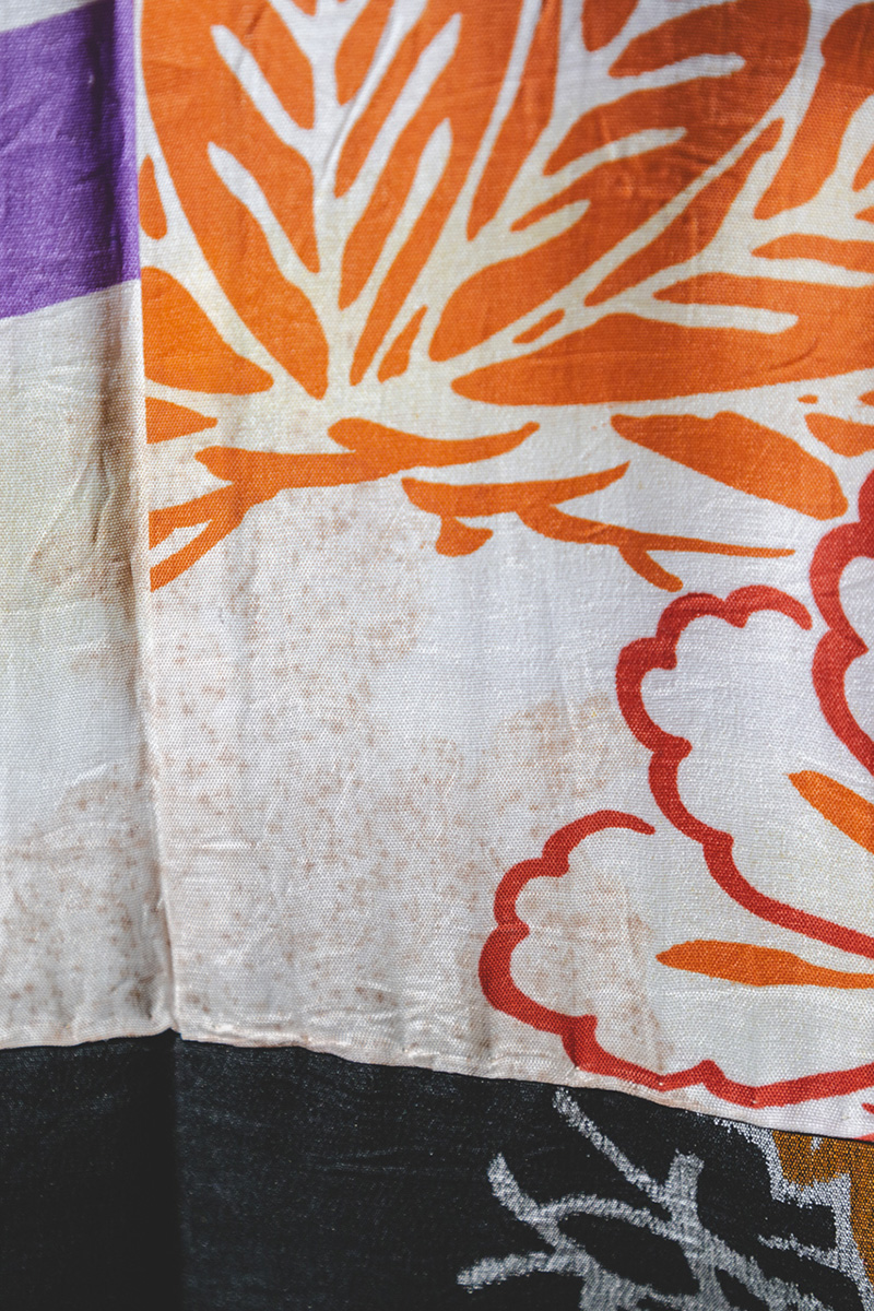 Materiaaliarvio: päällikangas silkkiä ja vuori tekosilkkiä. Käsintehdyt vintagevaatteet saapuvat liikkeeseen ilman tuotetietoja, ja materiaaliarvio tehdään aistinvaraisesti ja erilaisin testein.