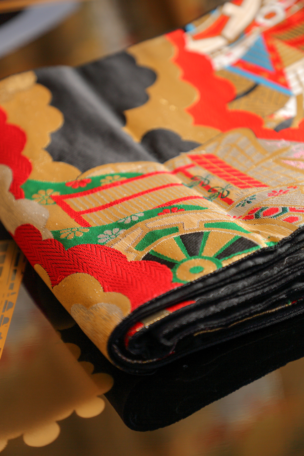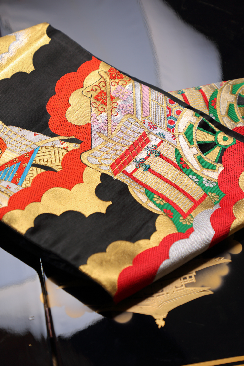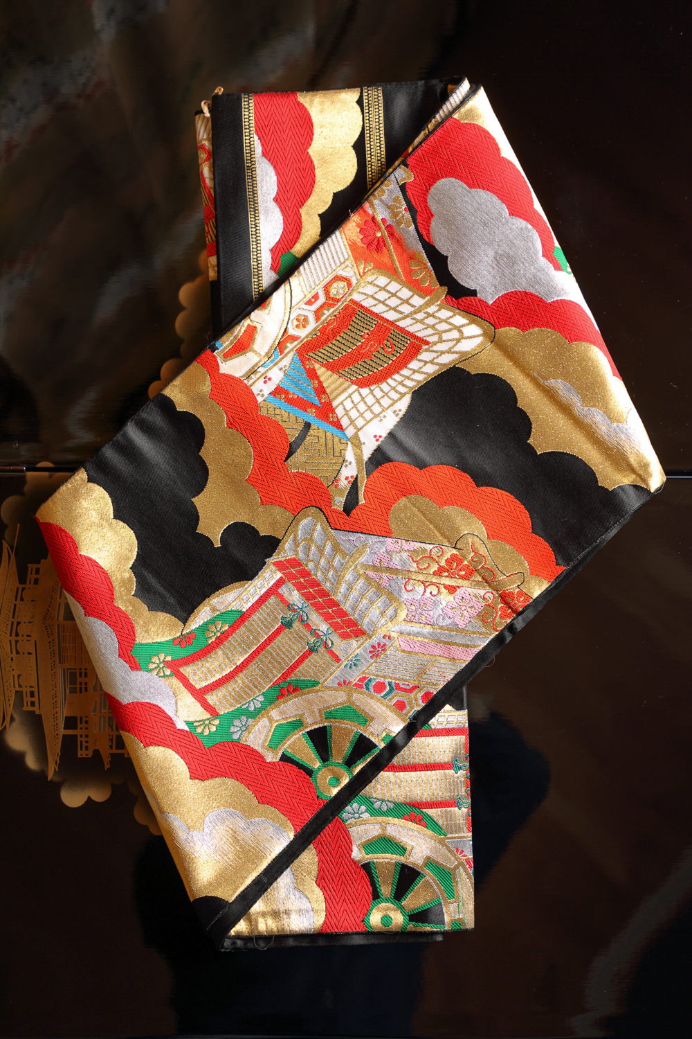 Musta fukuro-obi, johon on kuvattu hovivaunuja pilvien lomassa. Kuvio on kudottu kankaaseen kultaisella, hopeisella ja punaisella ompeleella, ja joukossa on myös vihreää, vaaleanpunaista ja sinistä. Obissa on fukuro-obeille tyypillinen kuvioimaton osuus, joka jää puettaessa näkymättömiin. Obin kääntöpuoli on mustaa, yksiväristä kangasta.