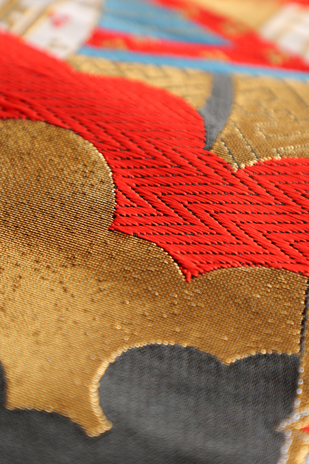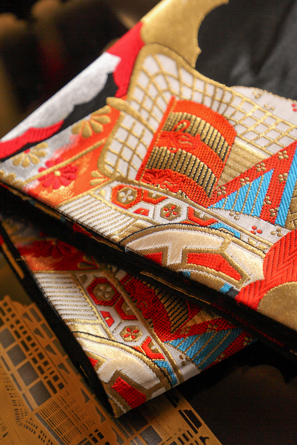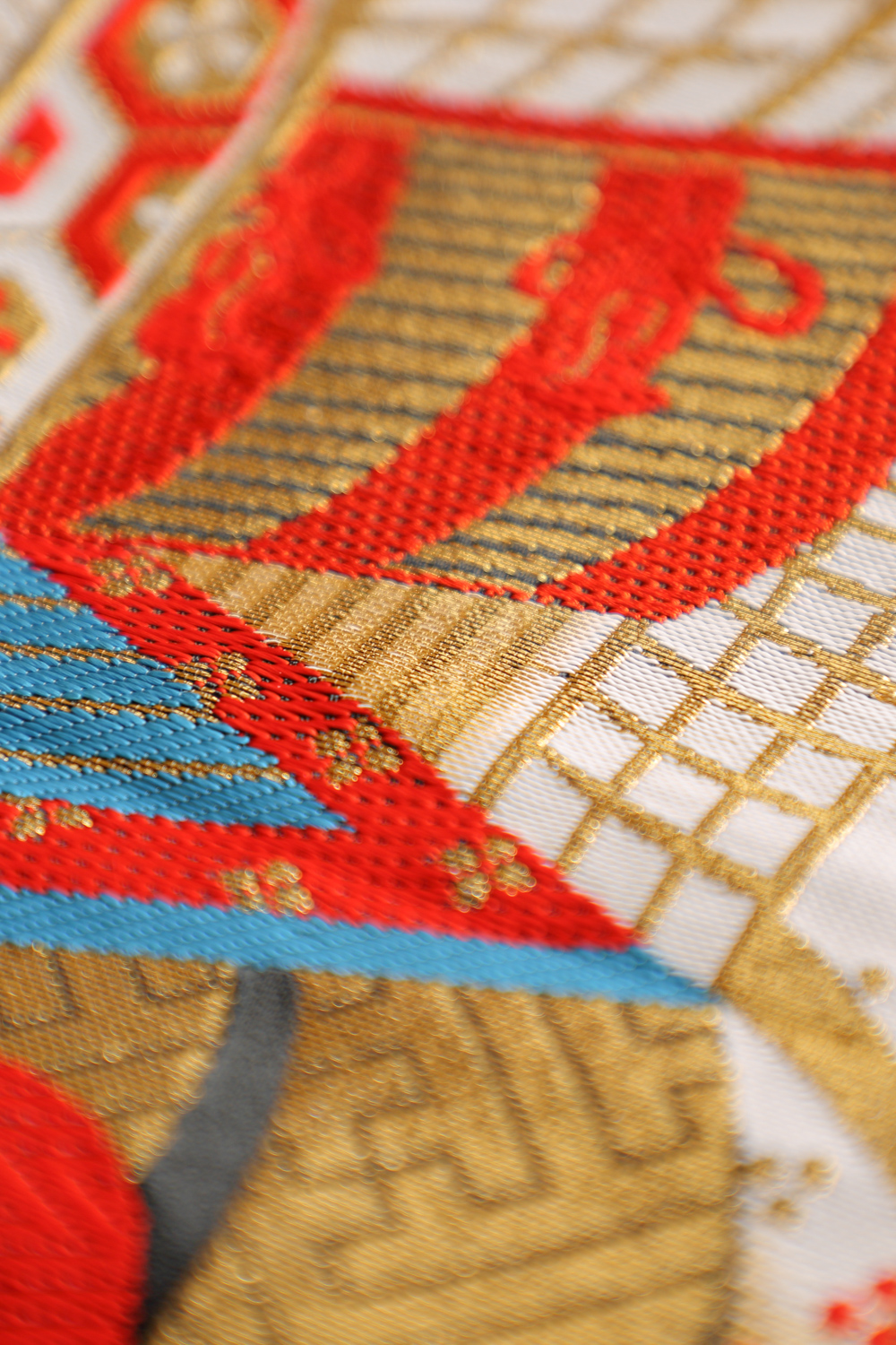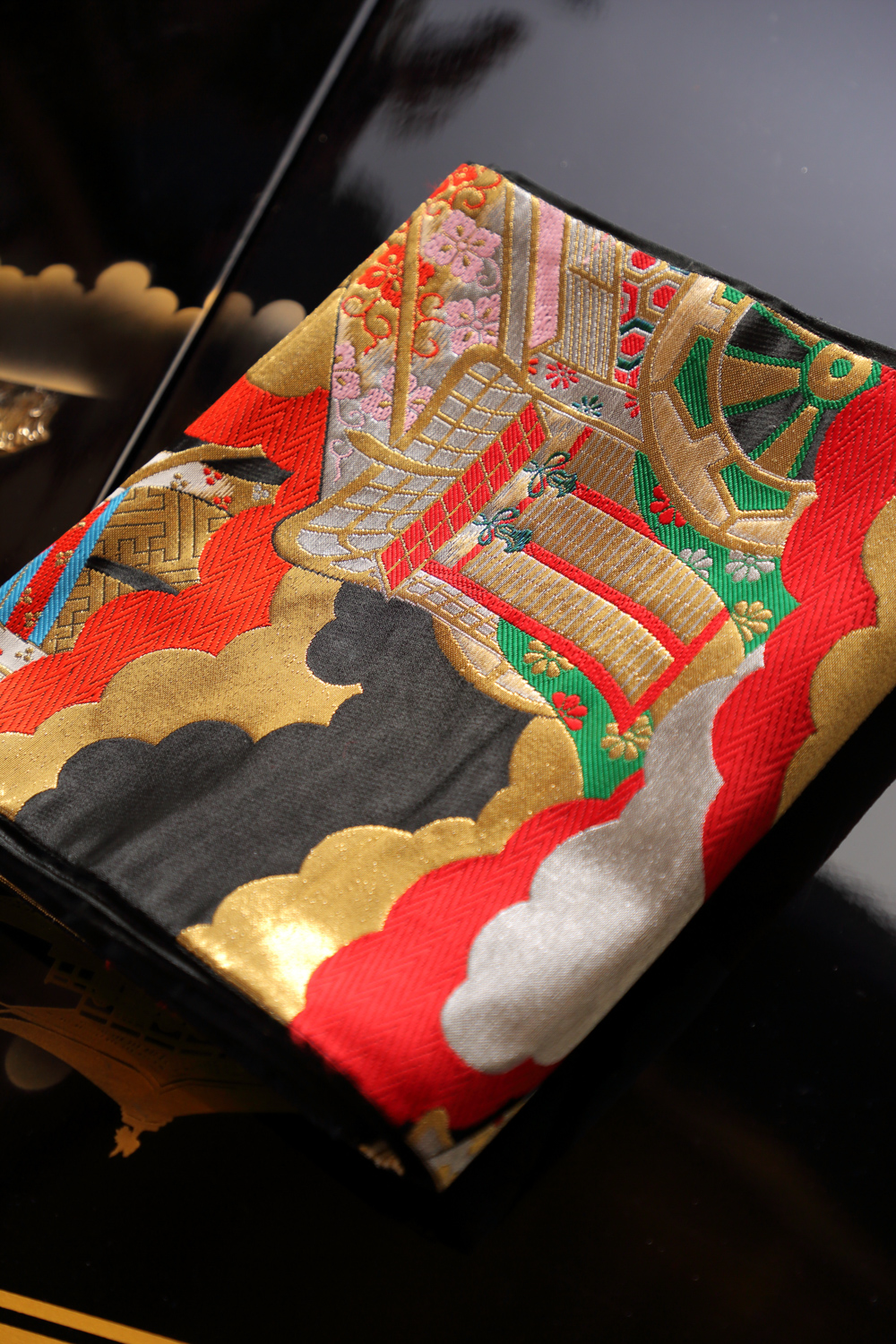 Musta fukuro-obi, johon on kuvattu hovivaunuja pilvien lomassa. Kuvio on kudottu kankaaseen kultaisella, hopeisella ja punaisella ompeleella, ja joukossa on myös vihreää, vaaleanpunaista ja sinistä. Obissa on fukuro-obeille tyypillinen kuvioimaton osuus, joka jää puettaessa näkymättömiin. Obin kääntöpuoli on mustaa, yksiväristä kangasta.