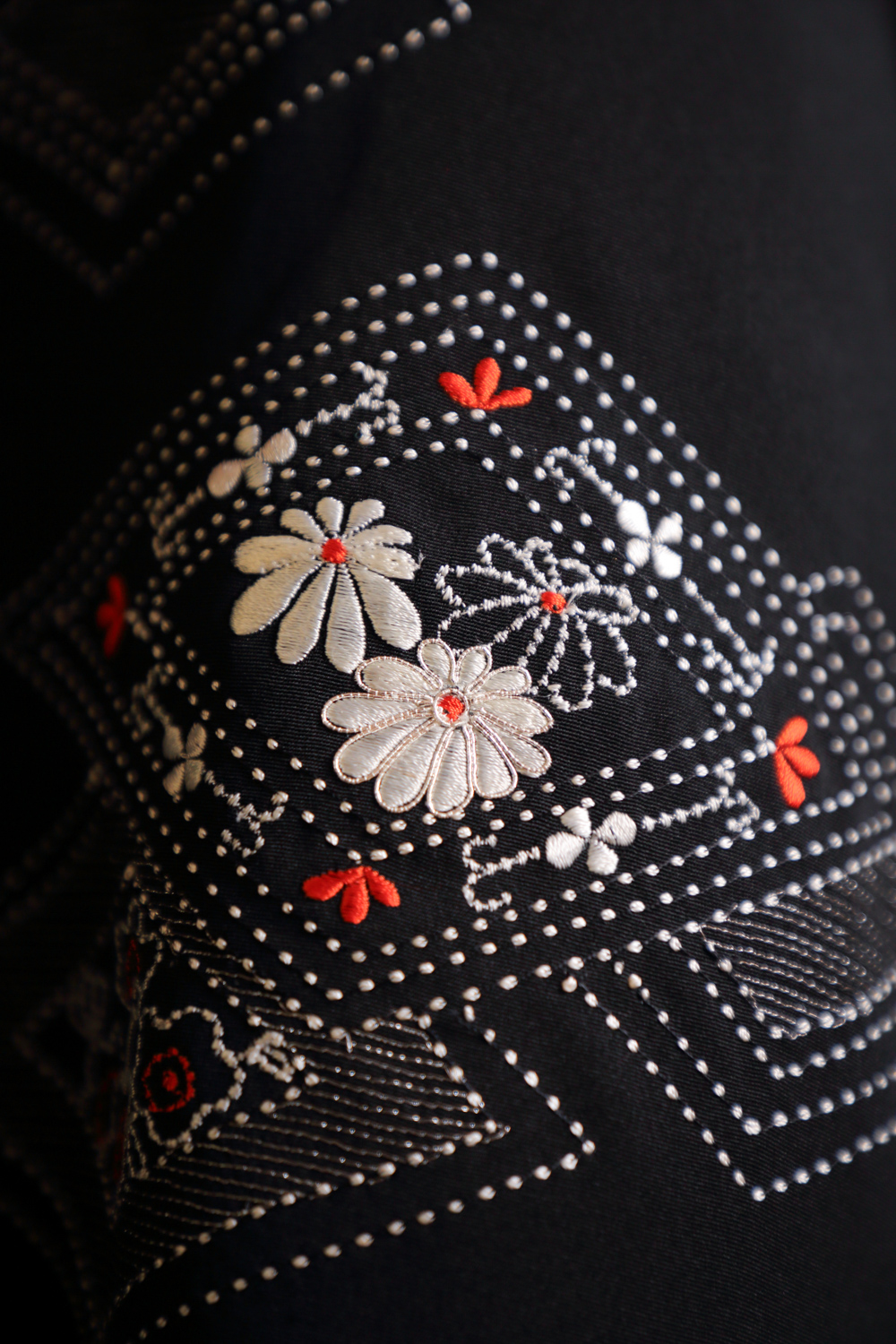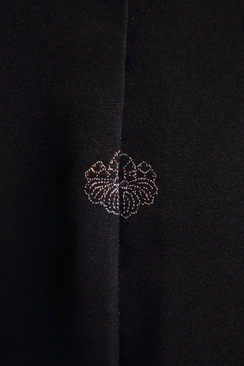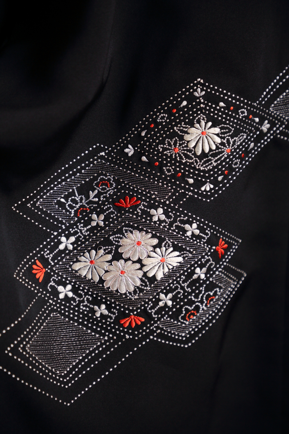 Musta haori, jossa on kirjailtu vinoneliökuviointi valkoisilla ja punaisilla kukilla ja hopealangalla. Kangas on sileää ja hieman painavaa. Haorin niskassa on yksi kirjailtu sukuvaakuna (kamon). Haorissa on valkoinen vuorikangas, johon on kuvattu koristeellisia rasioita.