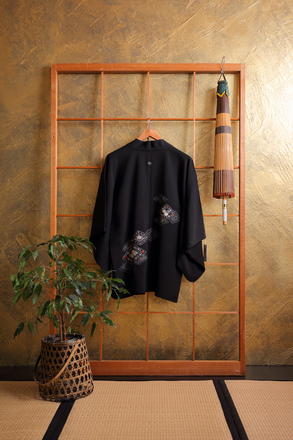 Musta haori kirjailluilla vinoneliöillä #201