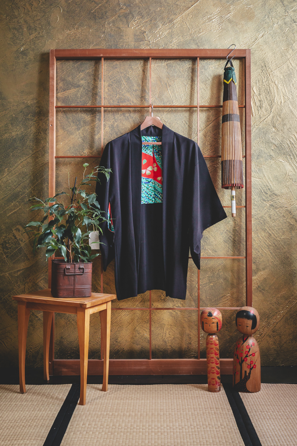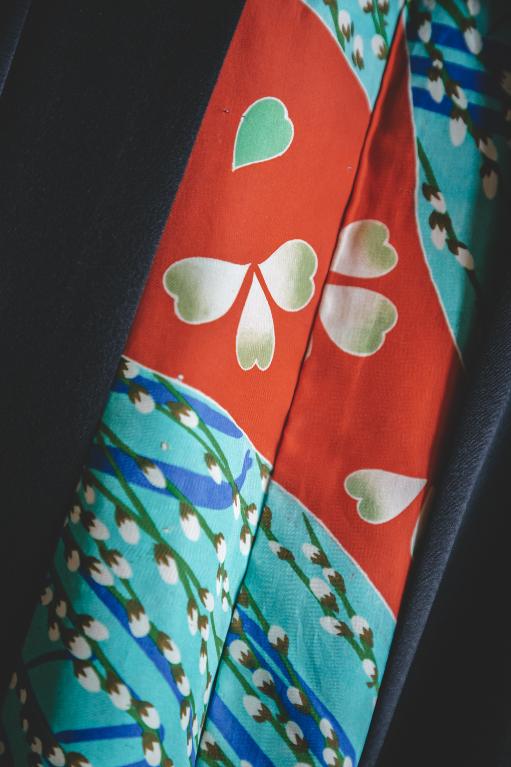 Huomaathan, että haori on tarkoitettu jäämään edestä hieman auki. Haoria voi käyttää myös kääntötakkina, jolloin sisävuorin kuvioitu kangas tulee näkyviin. Tässä haorissa on valmiina suloiset solmimisnauhat, joilla haorin saa sidottua edestä väljästi.