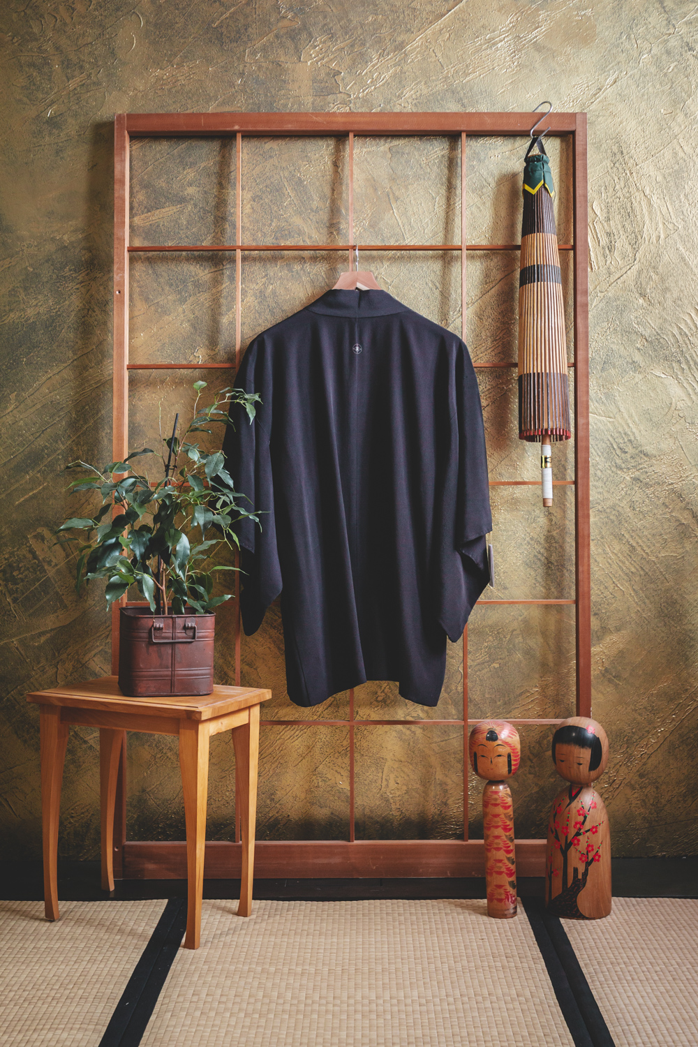 Musta kuvioimaton haori, jonka vuorikankaassa on raikkaan keväinen pajunkissakuviointi. Kangas on ihanan pehmeää ja sileää. Haorin niskassa on yksi kirjailtu sukuvaakuna (kamon).