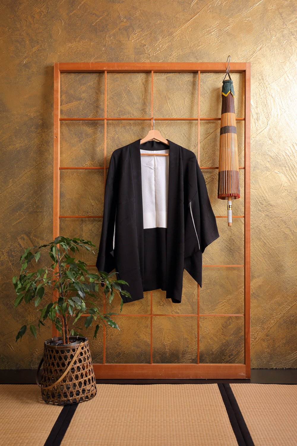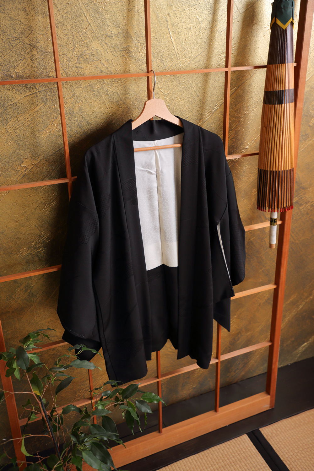 Musta haori, jossa on kankaaseen kudottu pilvi- ja kaislakuviointi. Kangas on pehmeää ja sileää. Haorin niskassa on yksi värjätty sukuvaakuna (kamon). Haorissa on valkoinen vuorikangas, jossa on kukkakuviointi.