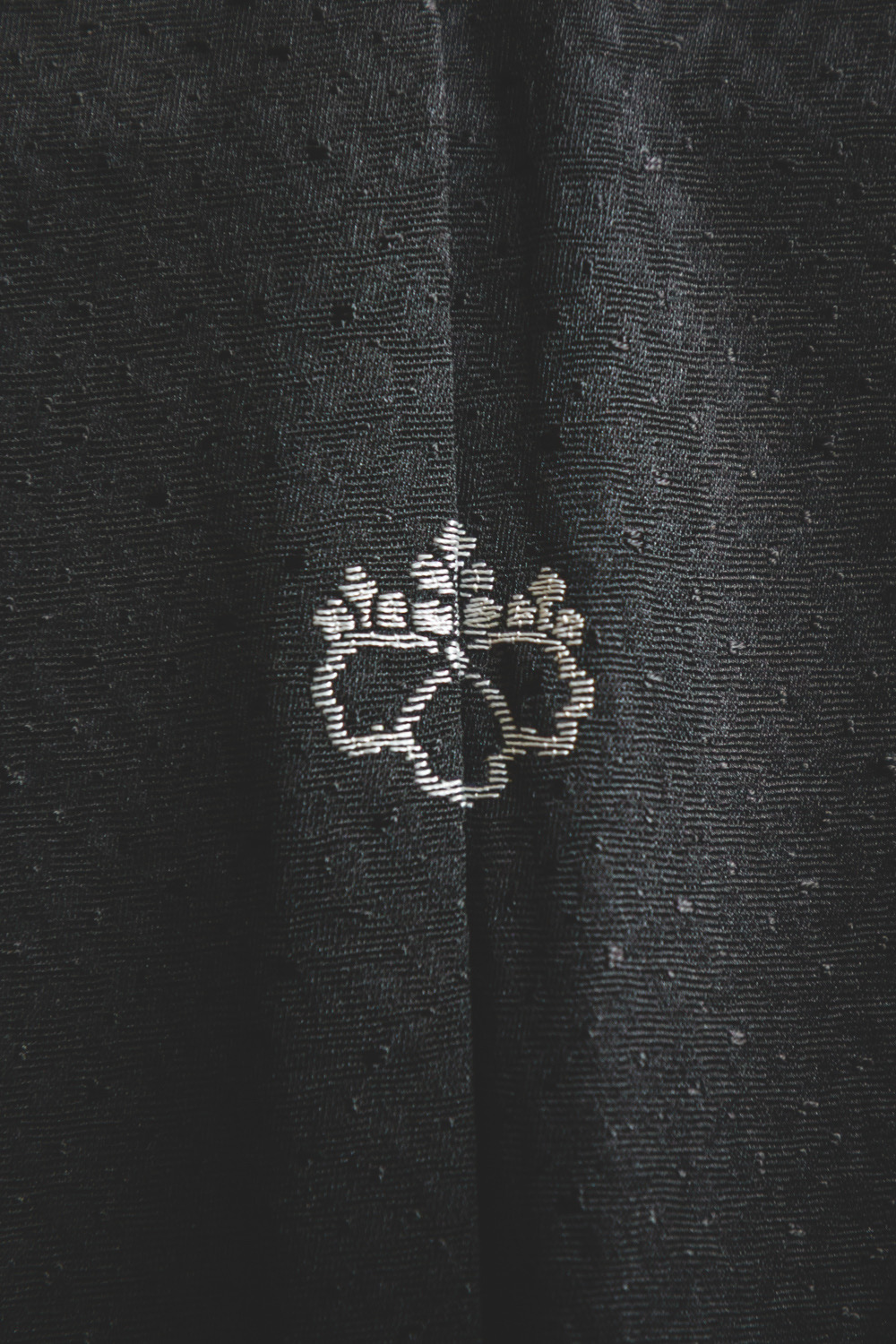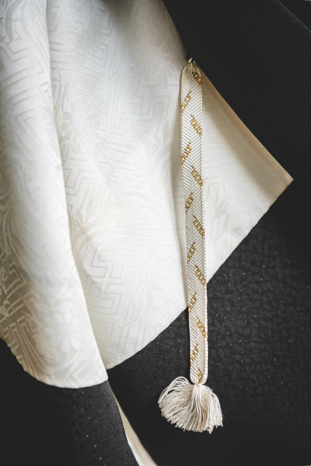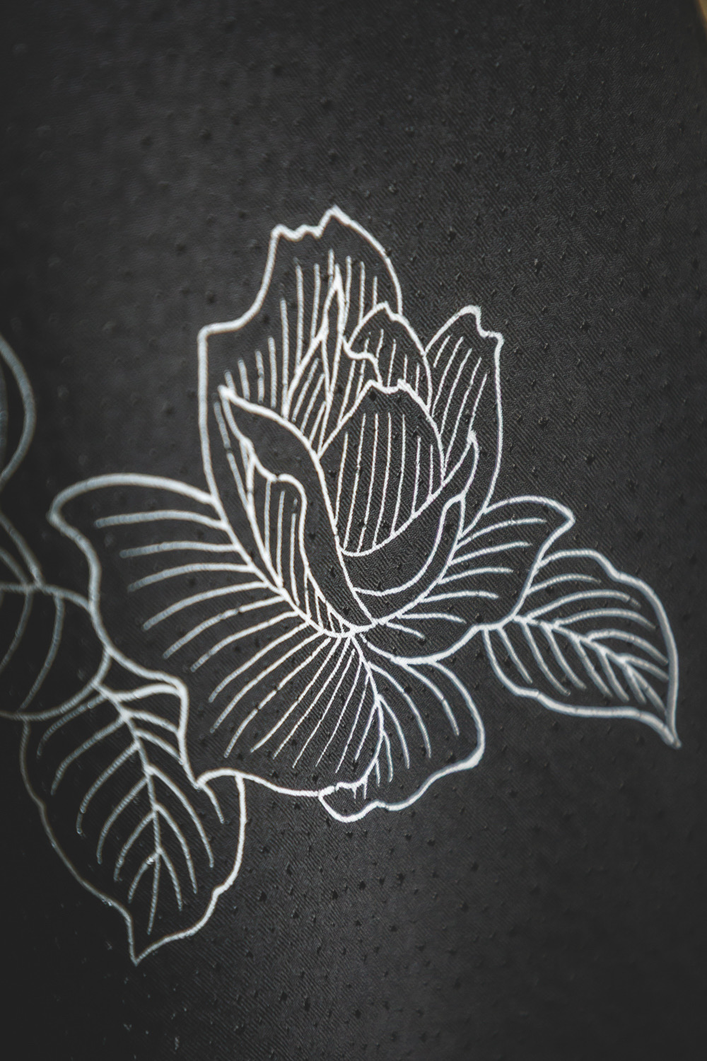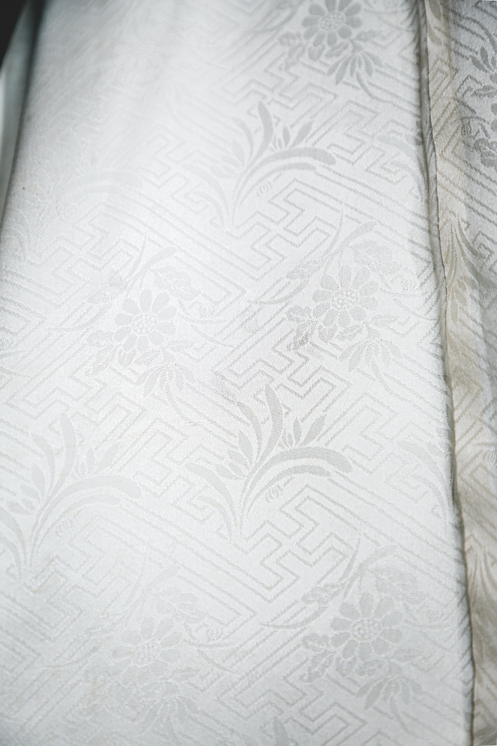 Musta haori, johon on kuvattu ruusuja valkoisilla ääriviivoilla. Osa kuviosta on kirjailtu käsin hopealangalla. Kankaaseen on kudottu täplämäinen pohjakuvio. Kangas on ihanan pehmeää. Haorissa on valkoinen vuorikangas, johon on kudottu geometrinen kuvio (sayagata).