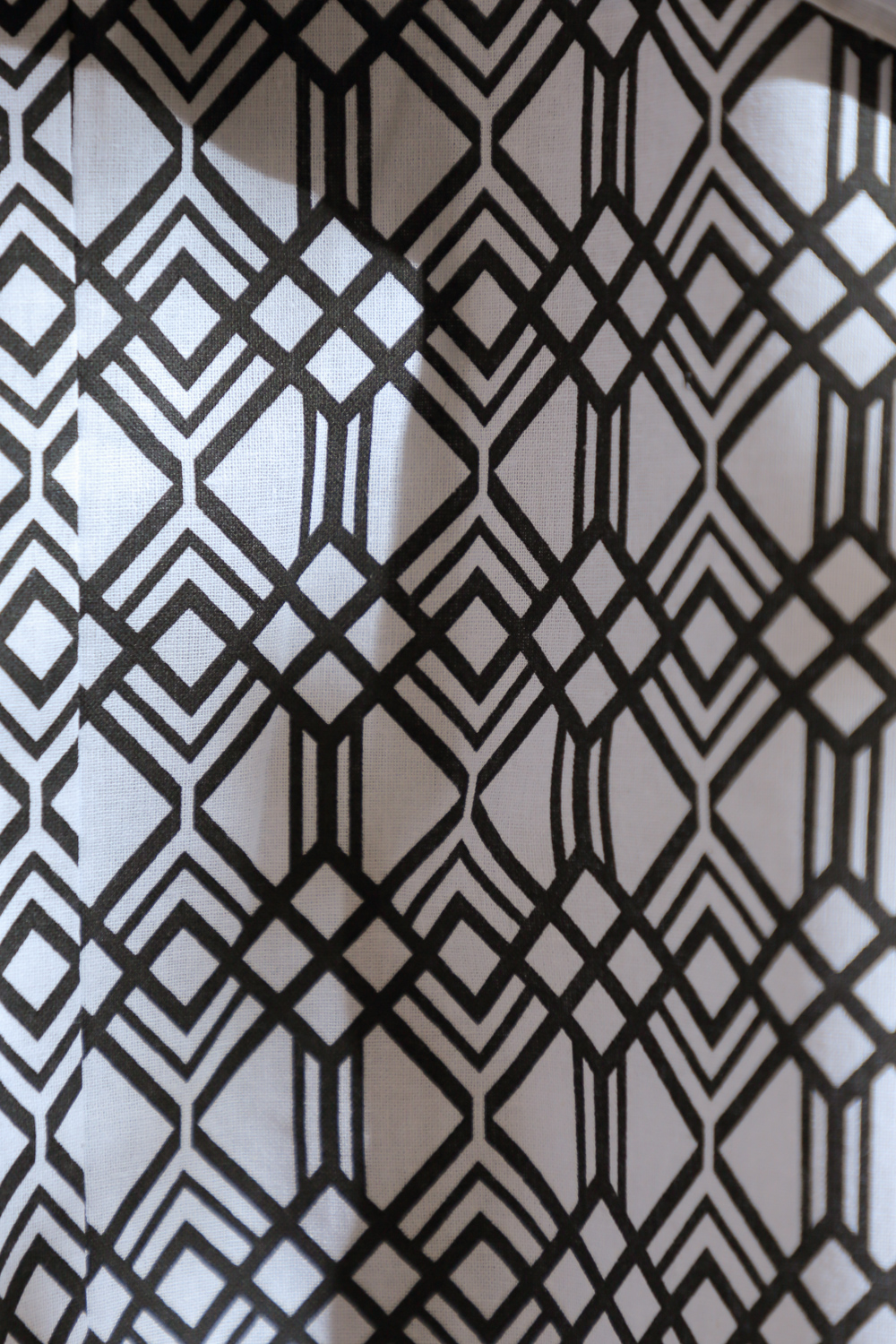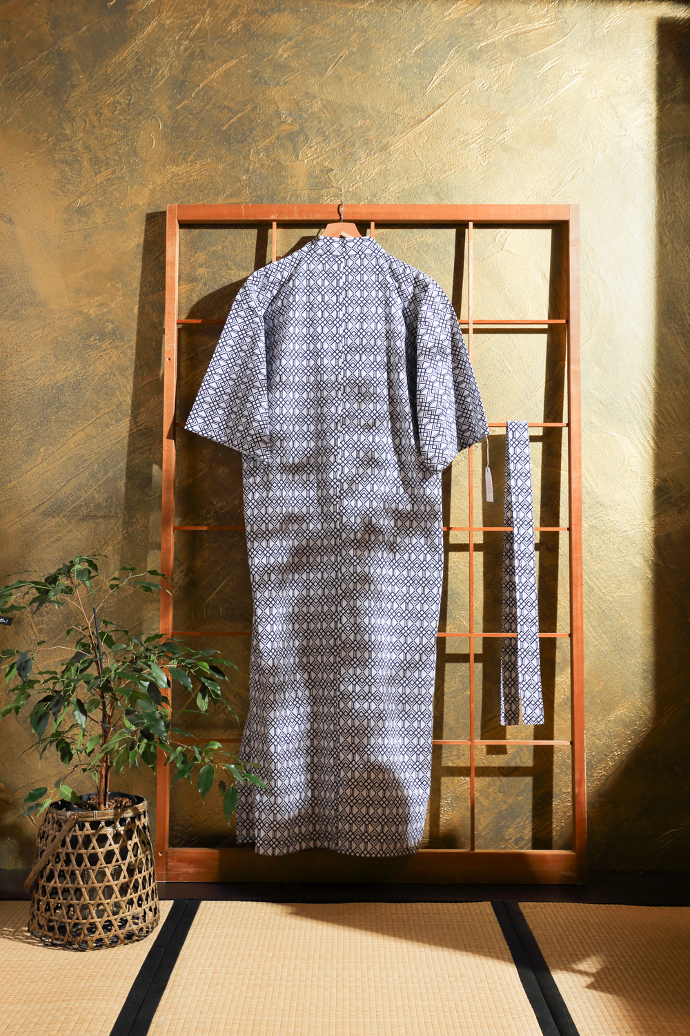 Mustavalkoinen nemaki eli kotikimono, jossa on vinoneliökuviointi. Kangas on erittäin pehmeää ja miellyttävän tuntuista. Vuorauksena käytetty harsokangas pitää puuvillan kevyesti irti iholta, mikä tekee vaatteesta hengittävän ja kevyen tuntuisen. Kimonossa on putkimaiset, umpinaiset hihat, eli se on alunperin miesten malli. Kimonon mukana tulee oma kapea vyö.