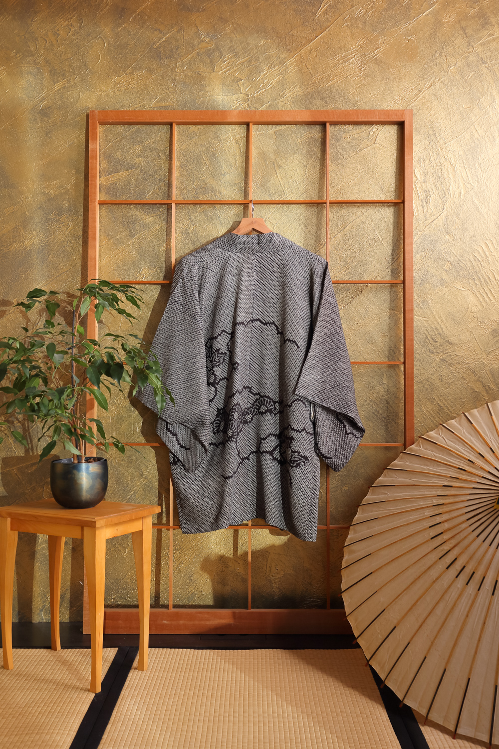 Mustavalkoinen solmuvärjätty haori kukilla ja pilvillä #225