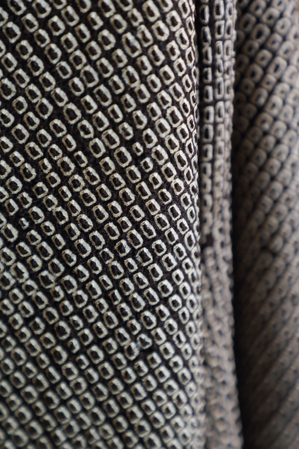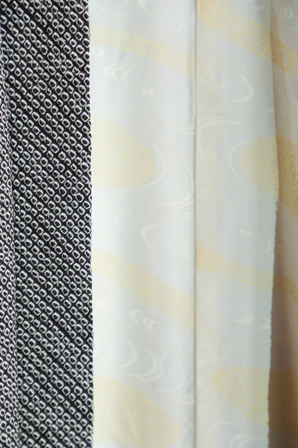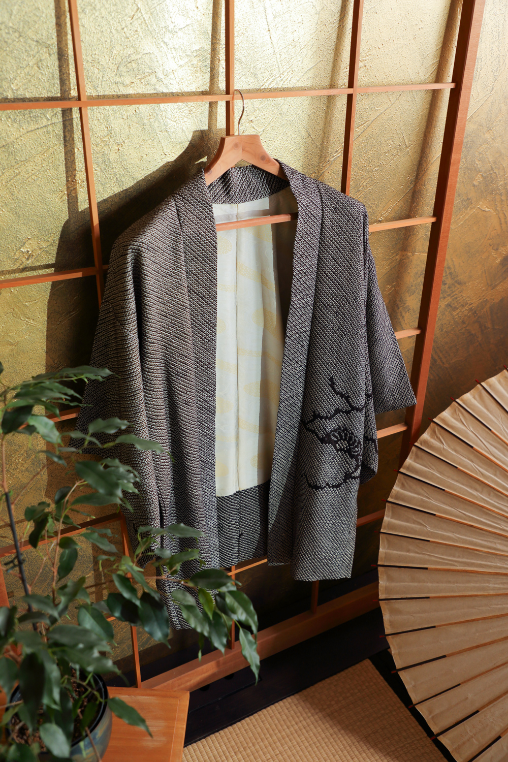 Mustavalkoinen solmuvärjätty haori, johon on kuvattu kukkia ja lehtiä pilvien lomaan. Kangas tuntuu pehmeältä ja kuohkealta. Valkoisessa vuorikankaassa on kermanvaalea virtaavaa vettä esittävä kuvio.