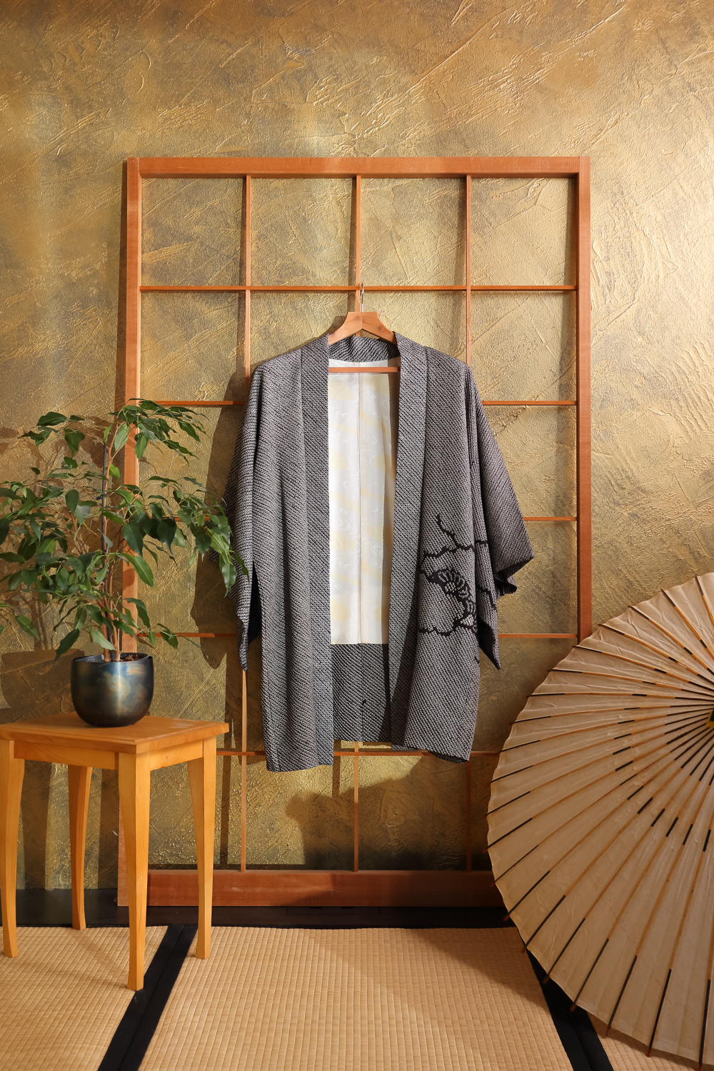 Huomaathan, että haori on tarkoitettu jäämään edestä hieman auki. Tässä haorissa on valmiina suloiset solmimisnauhat, joiden avulla haorin saa sidottua edestä väljästi kiinni.