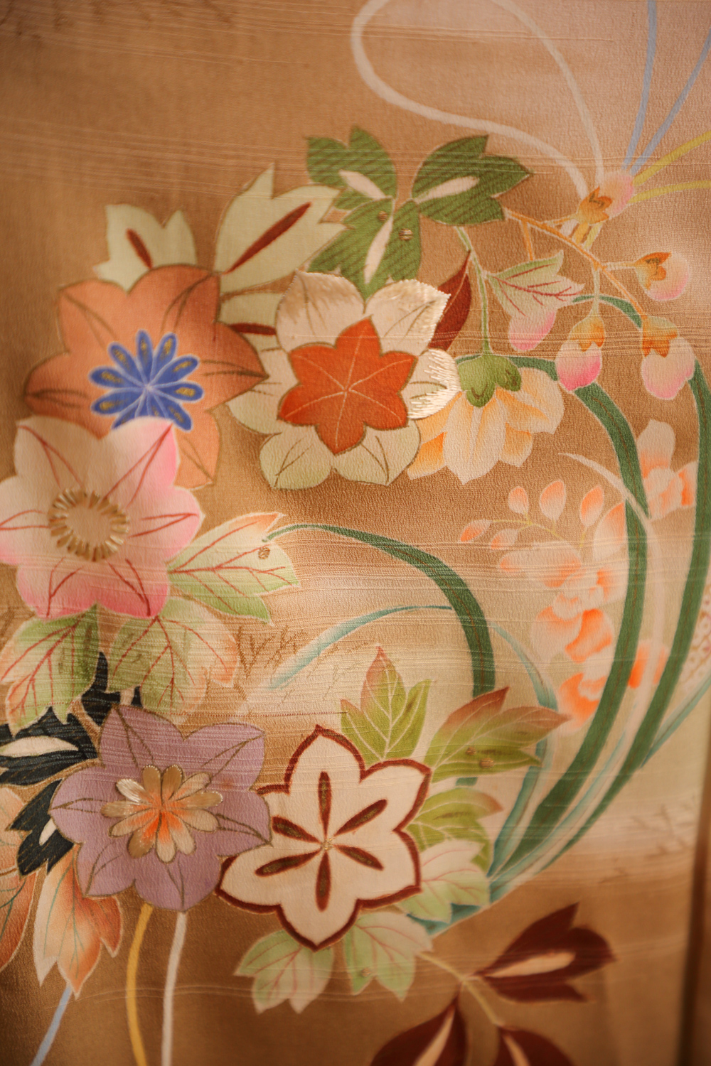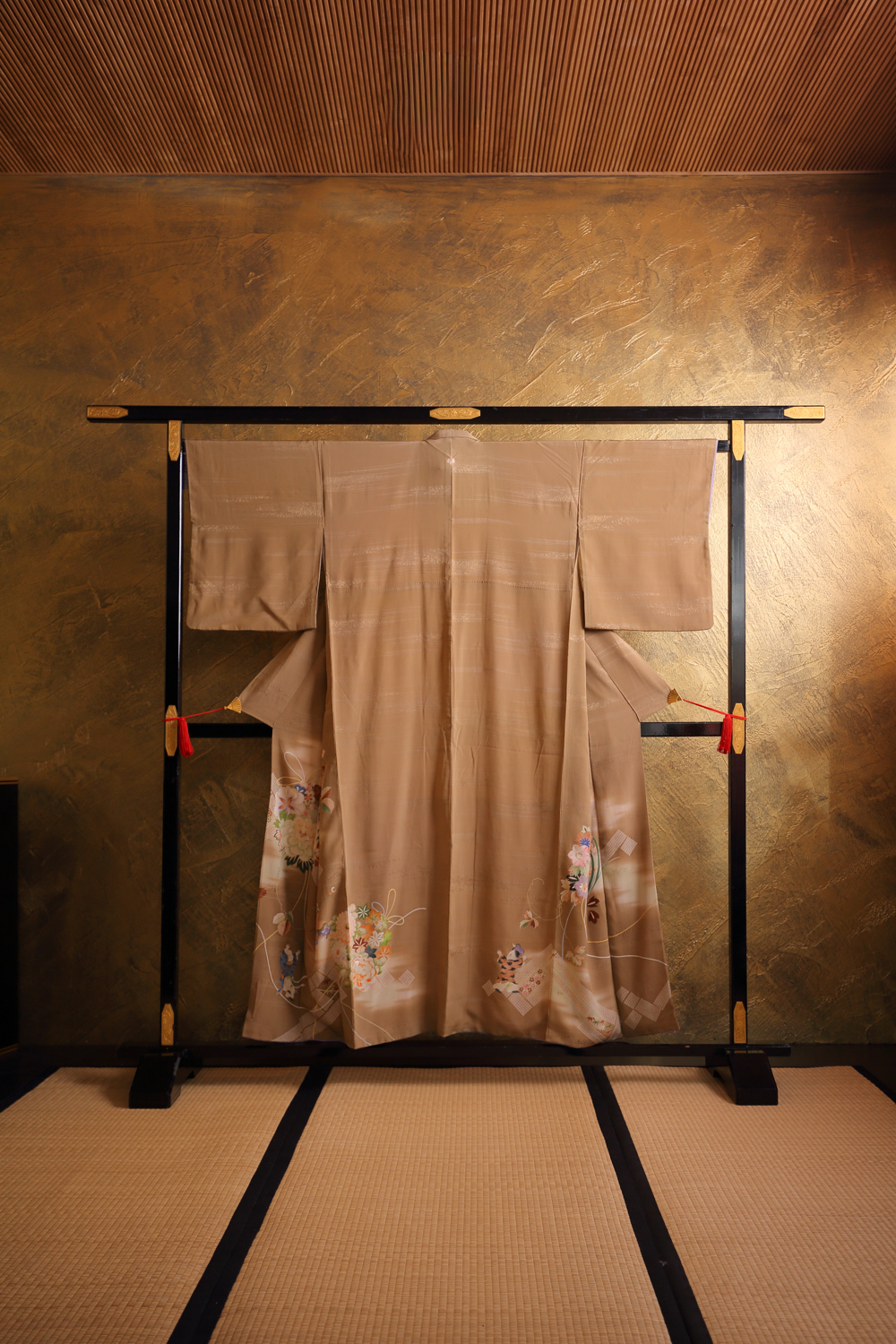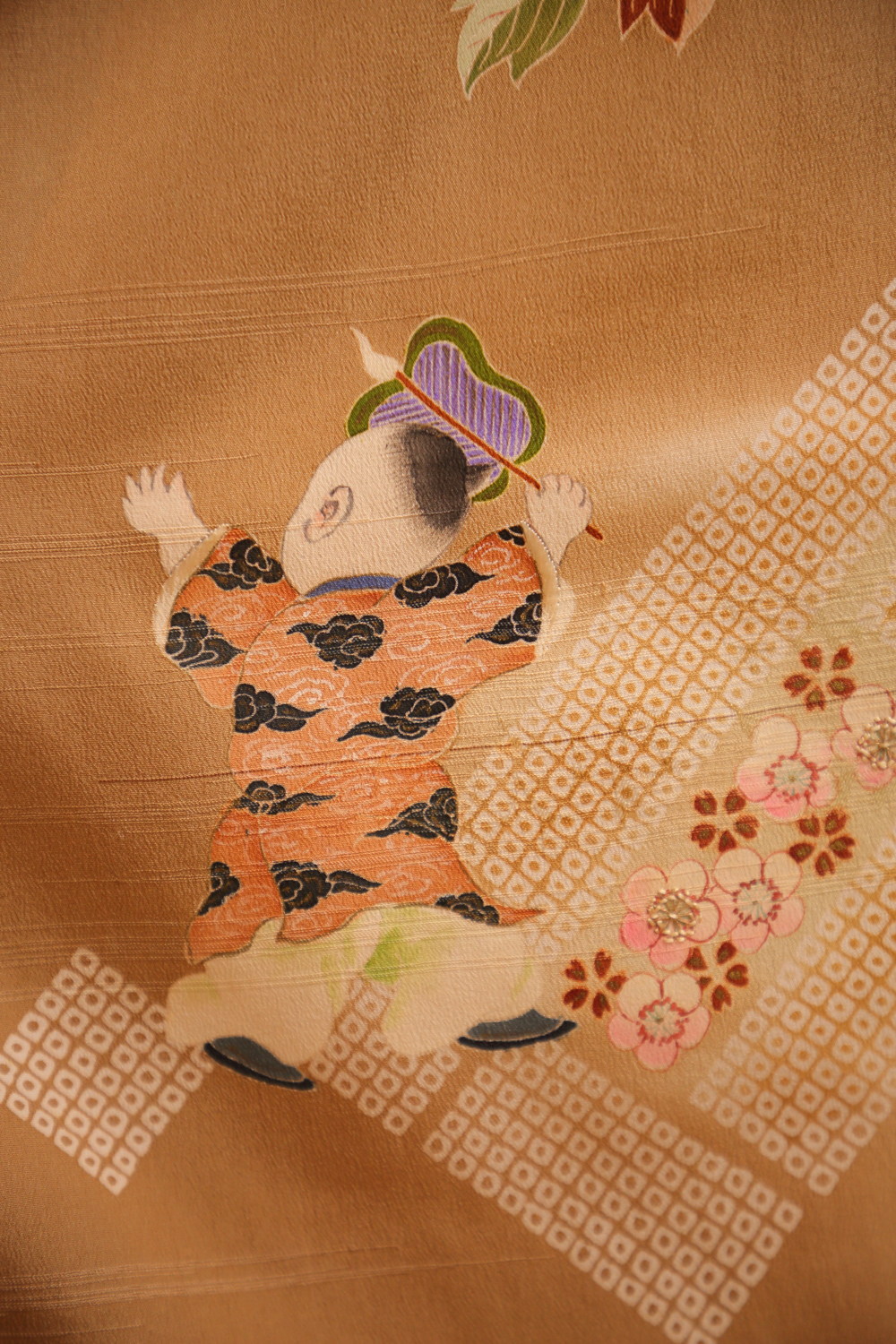 Oliivinvihreä irotomesode-kimono, johon on kuvattu leikkiviä lapsia kukkien seassa. Kukkien joukosta erottuu ainakin kirsikankukkia, luumunkukkia, krysanteemeja ja yksi hämähäkkililja. Kangas on erittäin pehmeää, kevyttä ja sileää. Kankaaseen on kudottu raitamainen pohjakuvio, josta erottuu paikoitellen kasvin varpuja. Kimonossa on valkoinen vuorikangas, jonka alaosa on violettia silkkiä.