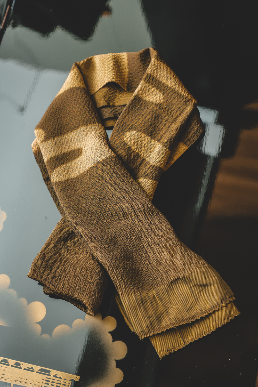 Tummemmalla puolella on joitain pieniä tahroja, jotka eivät erotu kauas. Obiage on lyhennetty puolestavälistä ompelemalla se laskokselle, mutta ommel on tarvittaessa purettavissa, mikäli huiviin haluaa lisää pituutta.