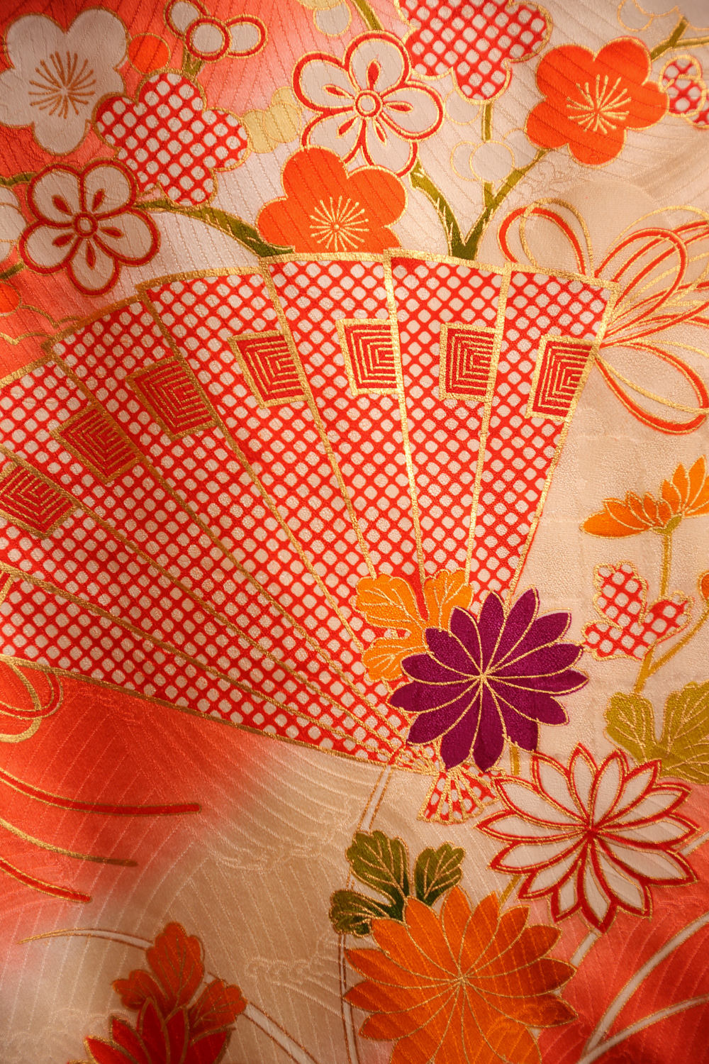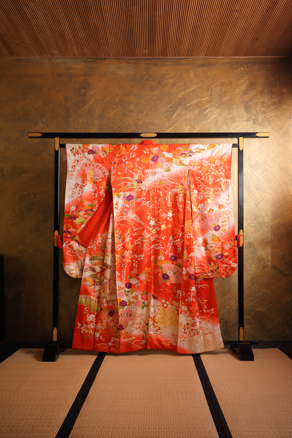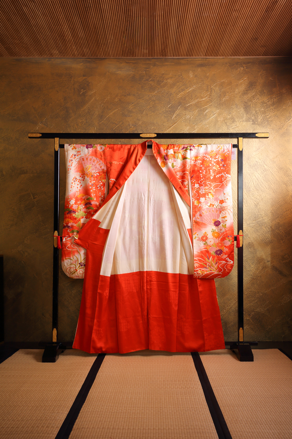 Oranssin ja luonnonvalkoisen sävyinen furisode-kimono, johon on kuvattu puutarhanäkymä terassien ja viuhkojen lomassa. Puutarhassa näkyy muun muassa luumunkukkaa, pioneita, wisteriaa ja mäntyjä. Osa kuviosta on kirjailtu kultalangalla. Kangas on sileää, pehmeää ja painavaa. Kimonossa on valkoinen vuorikangas, jonka alaosa on oranssia silkkiä.