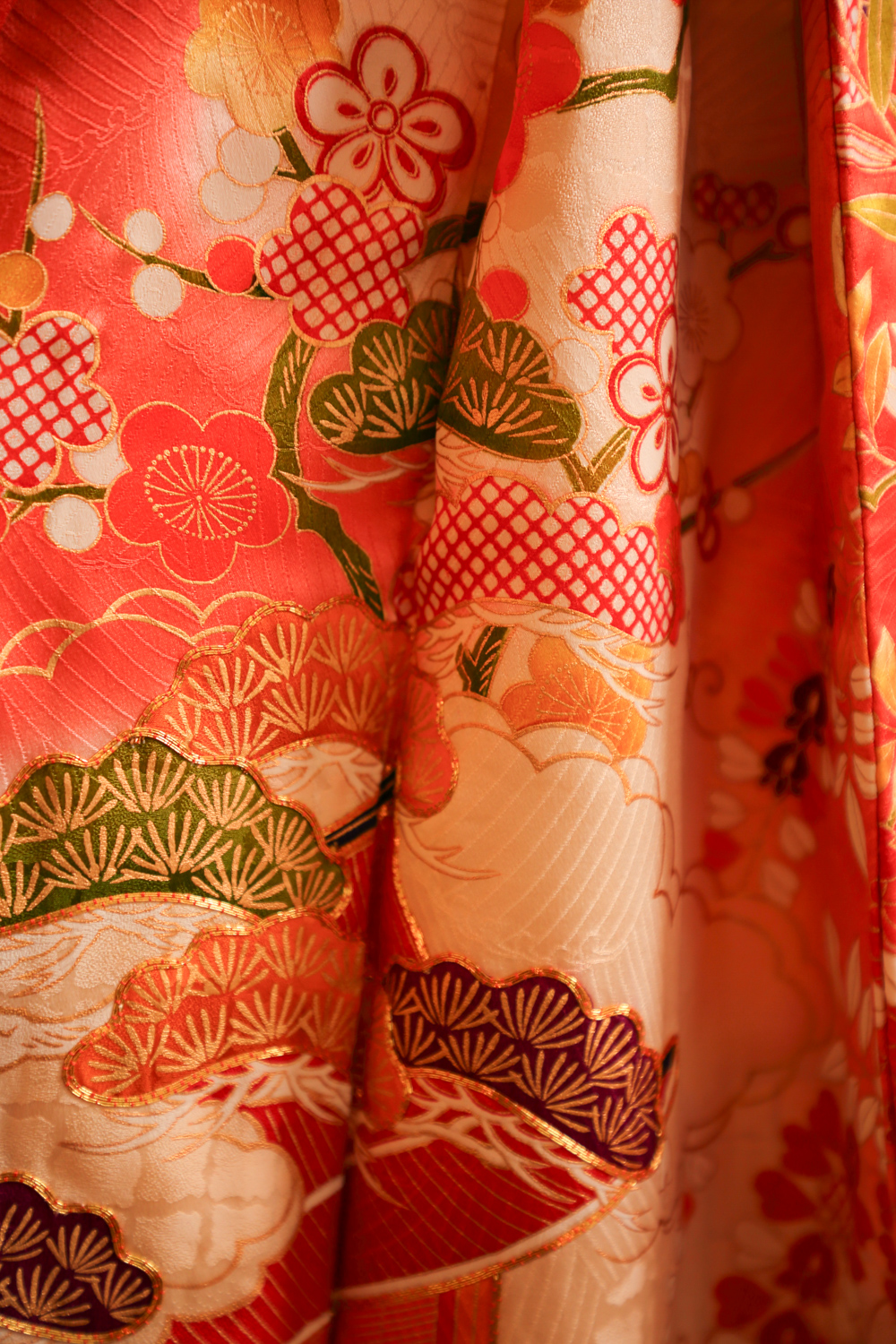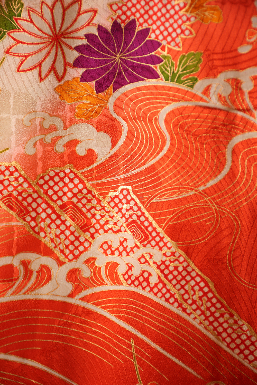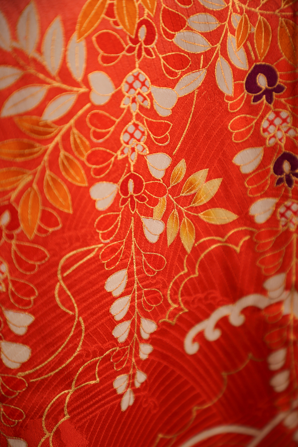 Oranssin ja luonnonvalkoisen sävyinen furisode-kimono, johon on kuvattu puutarhanäkymä terassien ja viuhkojen lomassa. Puutarhassa näkyy muun muassa luumunkukkaa, pioneita, wisteriaa ja mäntyjä. Osa kuviosta on kirjailtu kultalangalla. Kangas on sileää, pehmeää ja painavaa. Kimonossa on valkoinen vuorikangas, jonka alaosa on oranssia silkkiä.