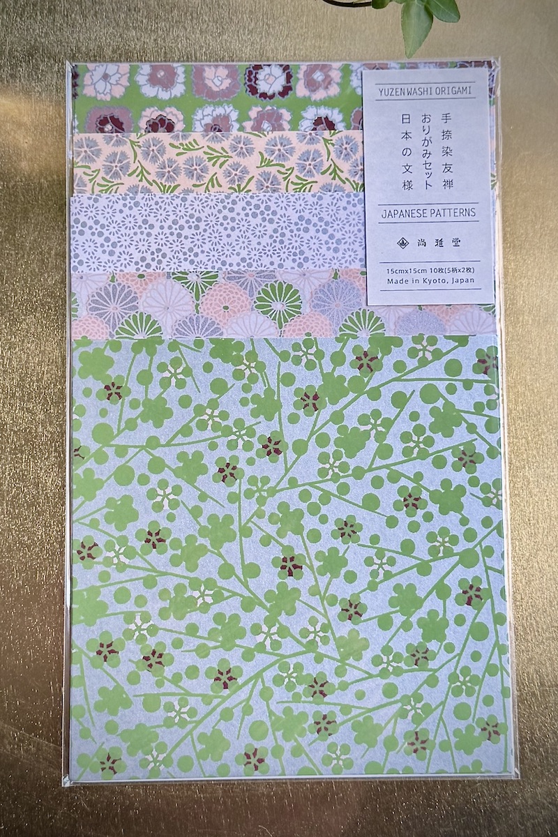 Kauniita 15x15cm papereita, 10 arkkia. Nämä Kiotossa valmistetut vihreän ja vaaleanpunaisen sävyiset paperit ovat peräisin Ozuwashin paperikaupasta, joka on toiminut Nihonbashissa Tokiossa 1600-luvulta lähtien.