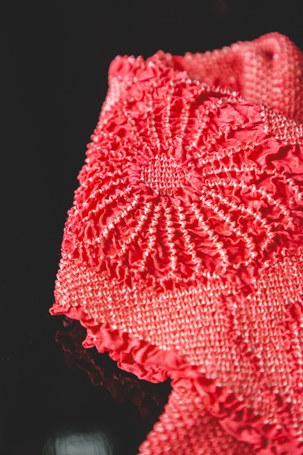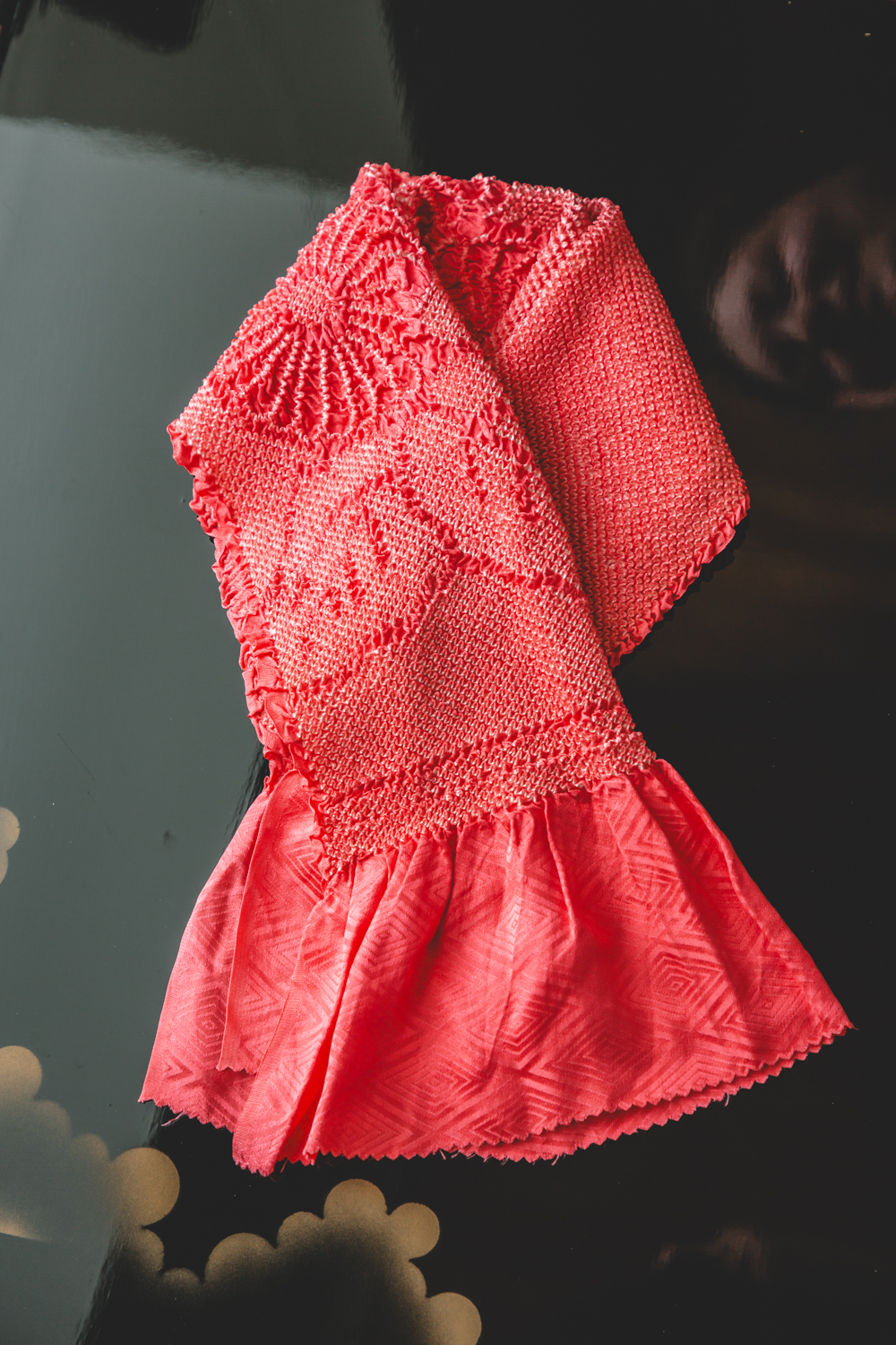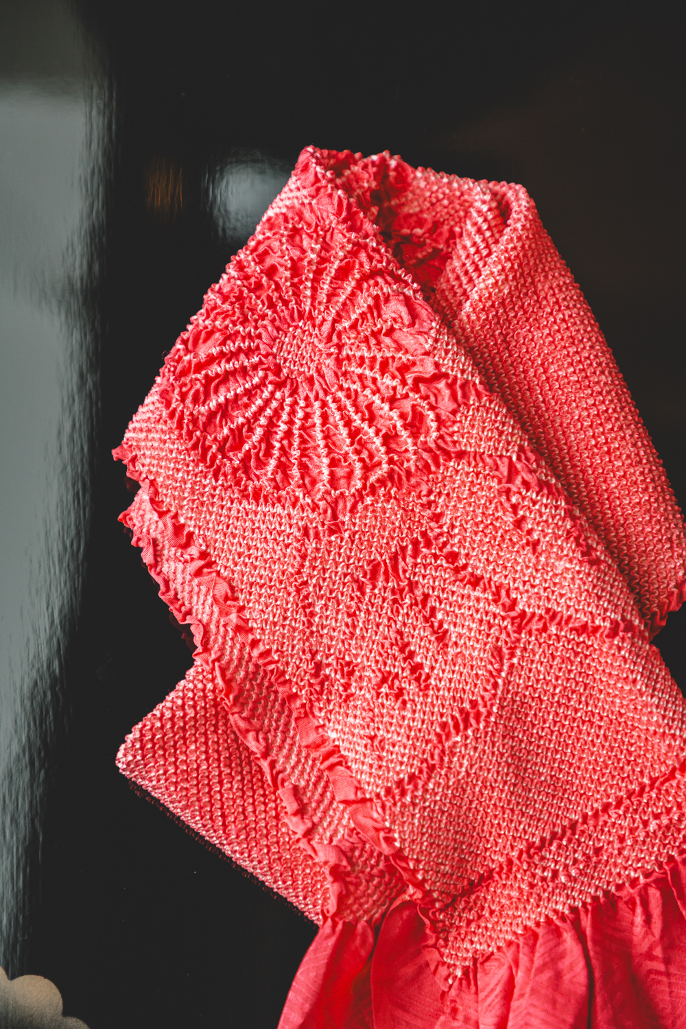 Pinkki solmuvärjätty obiage, johon on kuvattu suuria kukkia, ehkä krysanteemeja. Solmuvärjätty kangas joustaa hieman käytössä. Obiage on arviomme mukaan laadukasta silkkiä. Mitat venyttäen / venyttämättä: leveys 40 / 20 cm, pituus 170 / 140 cm.