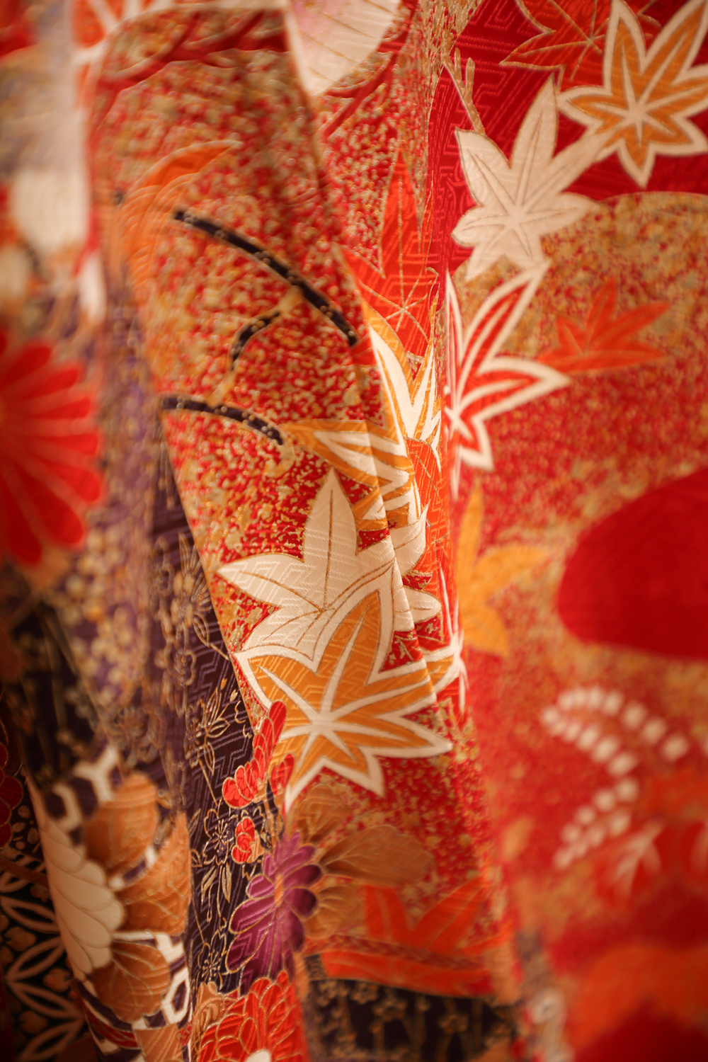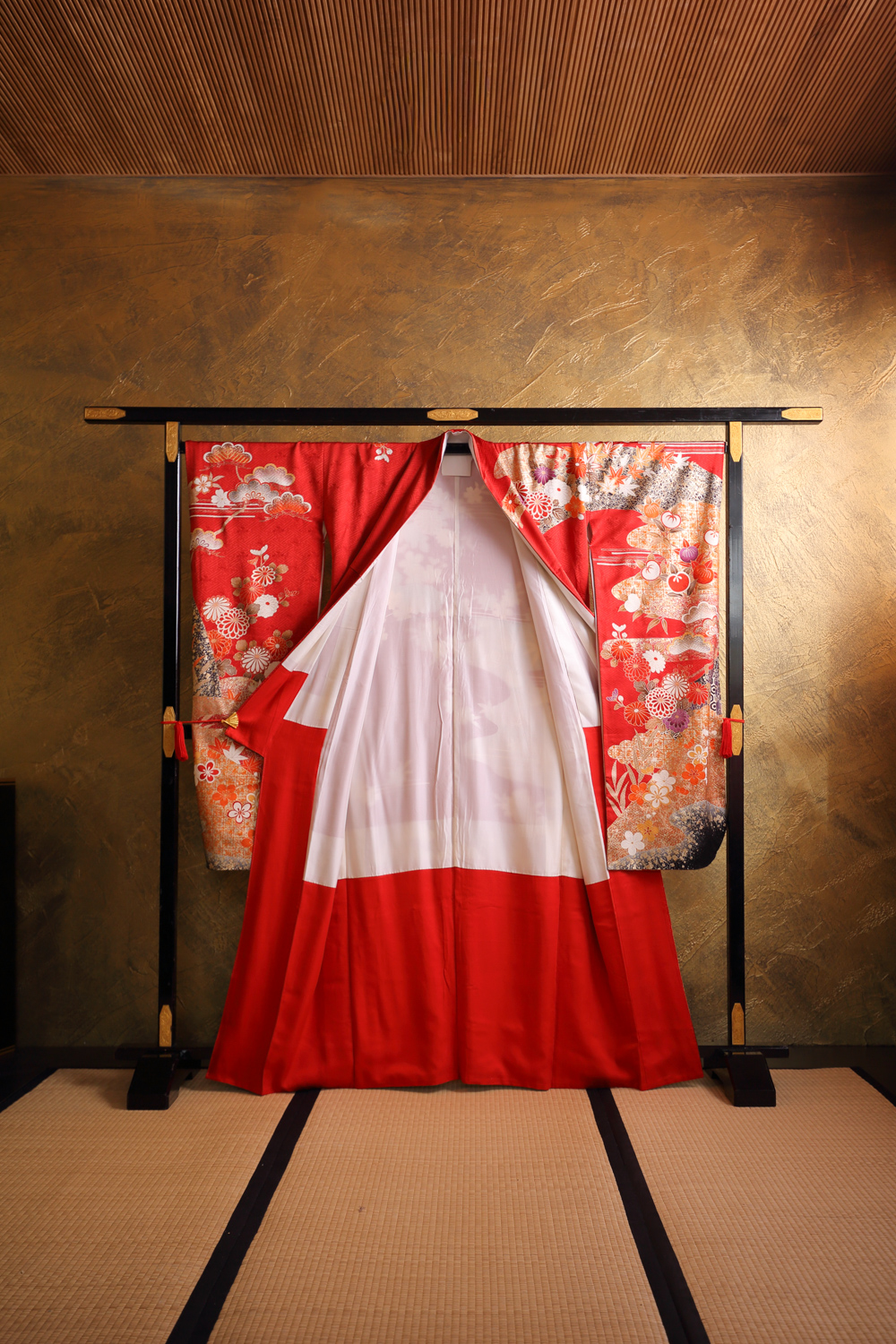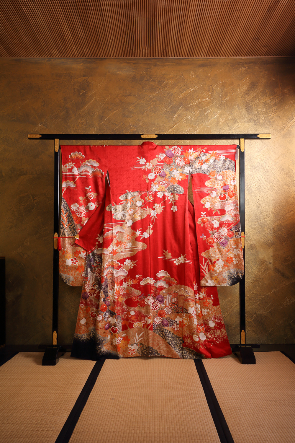 Punaisen ja mustan sävyinen furisode-kimono, johon on kuvattu hovivaunut kukkien seassa. Kimonoon on kuvattu muun muassa kirsikankukkia, krysanteemeja, mandariinikukkia, mäntyjä ja vaahteranoksia. Osa kuviosta on kirjailtu kultalangalla. Kangas on sileää, pehmeää ja painavaa. Kimonossa on valkoinen vuorikangas, jonka alaosa on punaista silkkiä.
