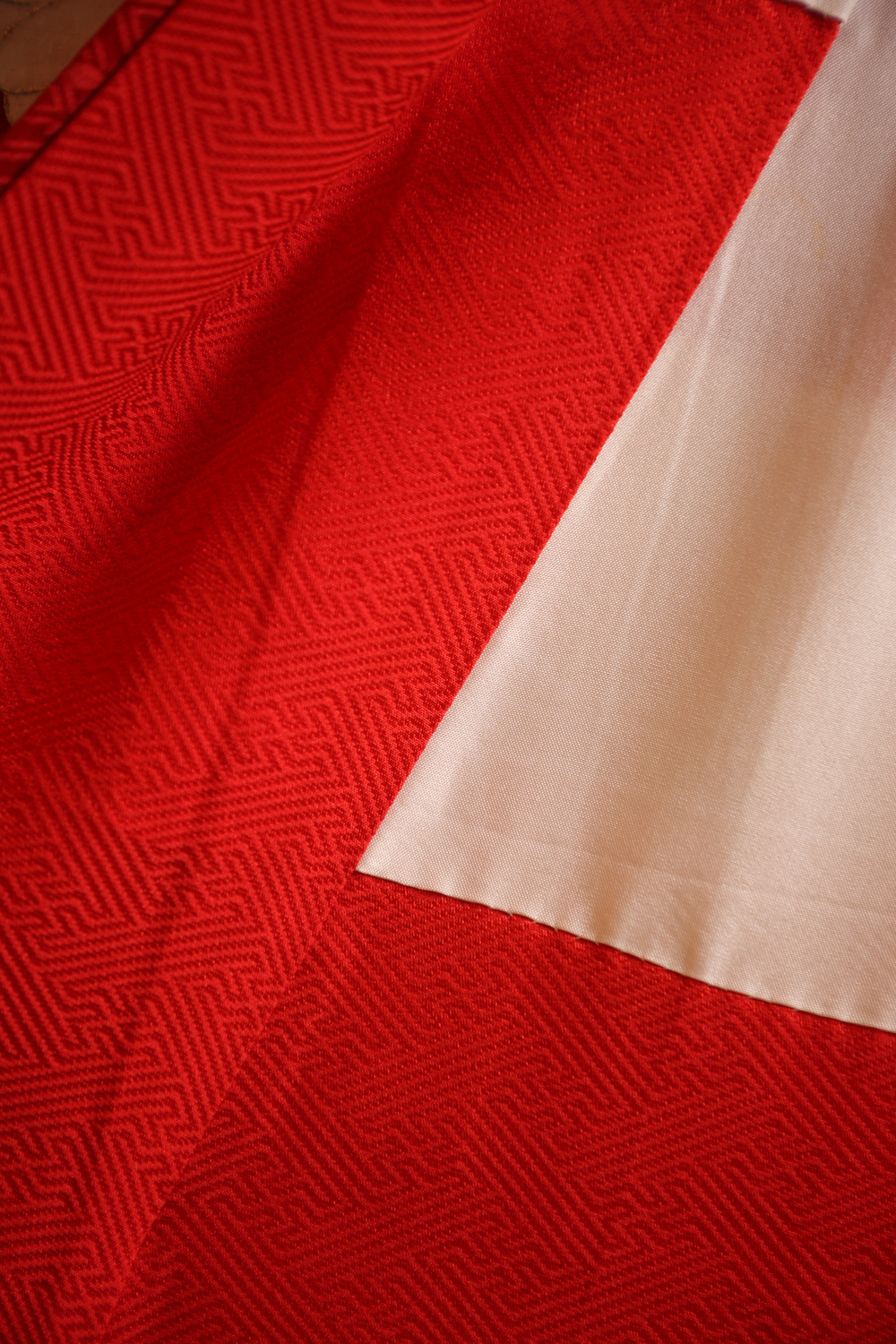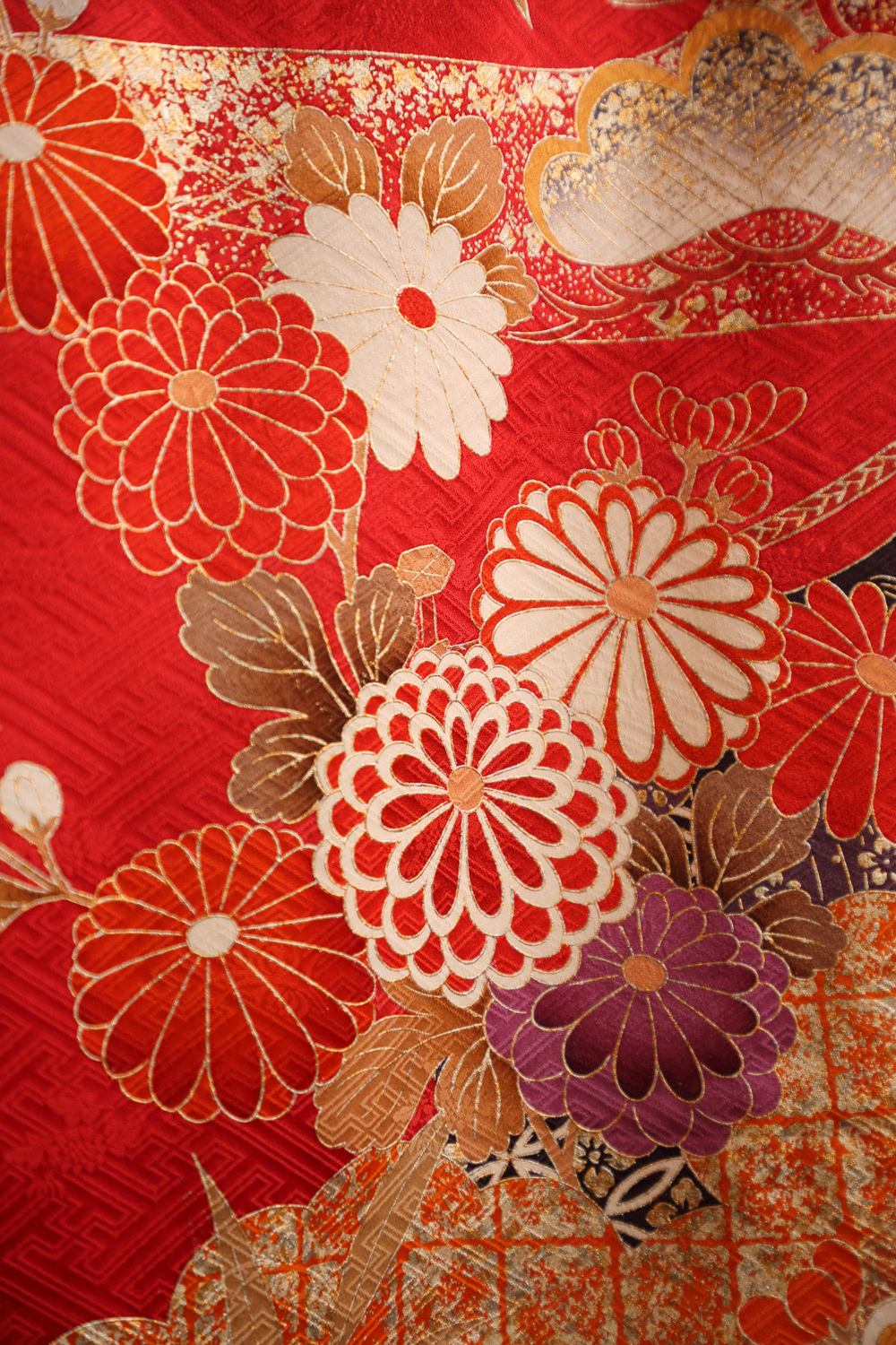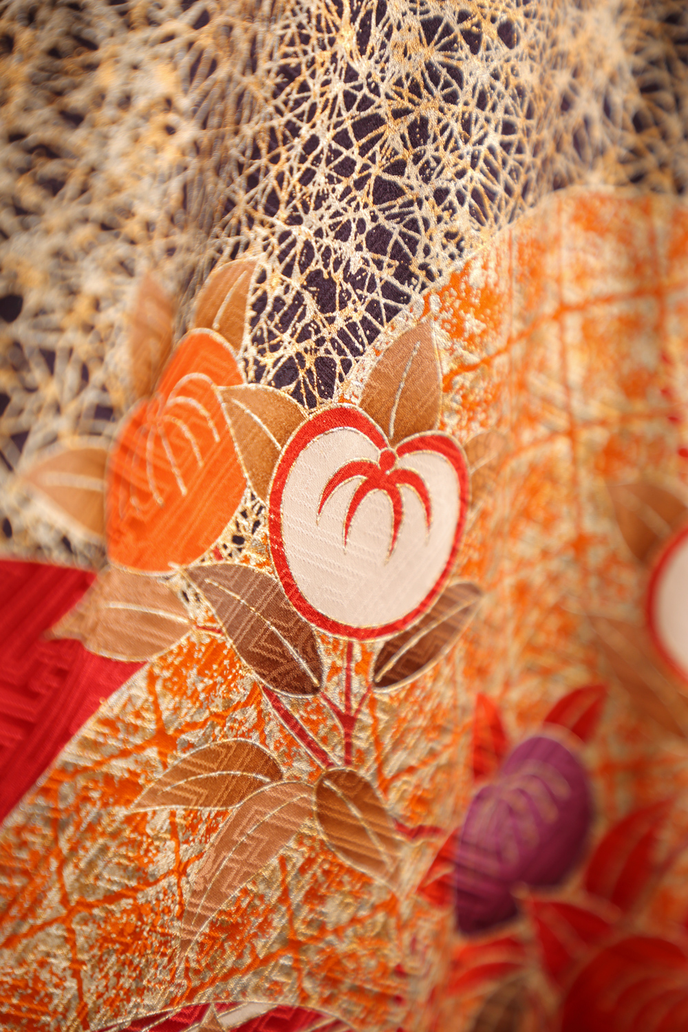 Punaisen ja mustan sävyinen furisode-kimono, johon on kuvattu hovivaunut kukkien seassa. Kimonoon on kuvattu muun muassa kirsikankukkia, krysanteemeja, mandariinikukkia, mäntyjä ja vaahteranoksia. Osa kuviosta on kirjailtu kultalangalla. Kangas on sileää, pehmeää ja painavaa. Kimonossa on valkoinen vuorikangas, jonka alaosa on punaista silkkiä.