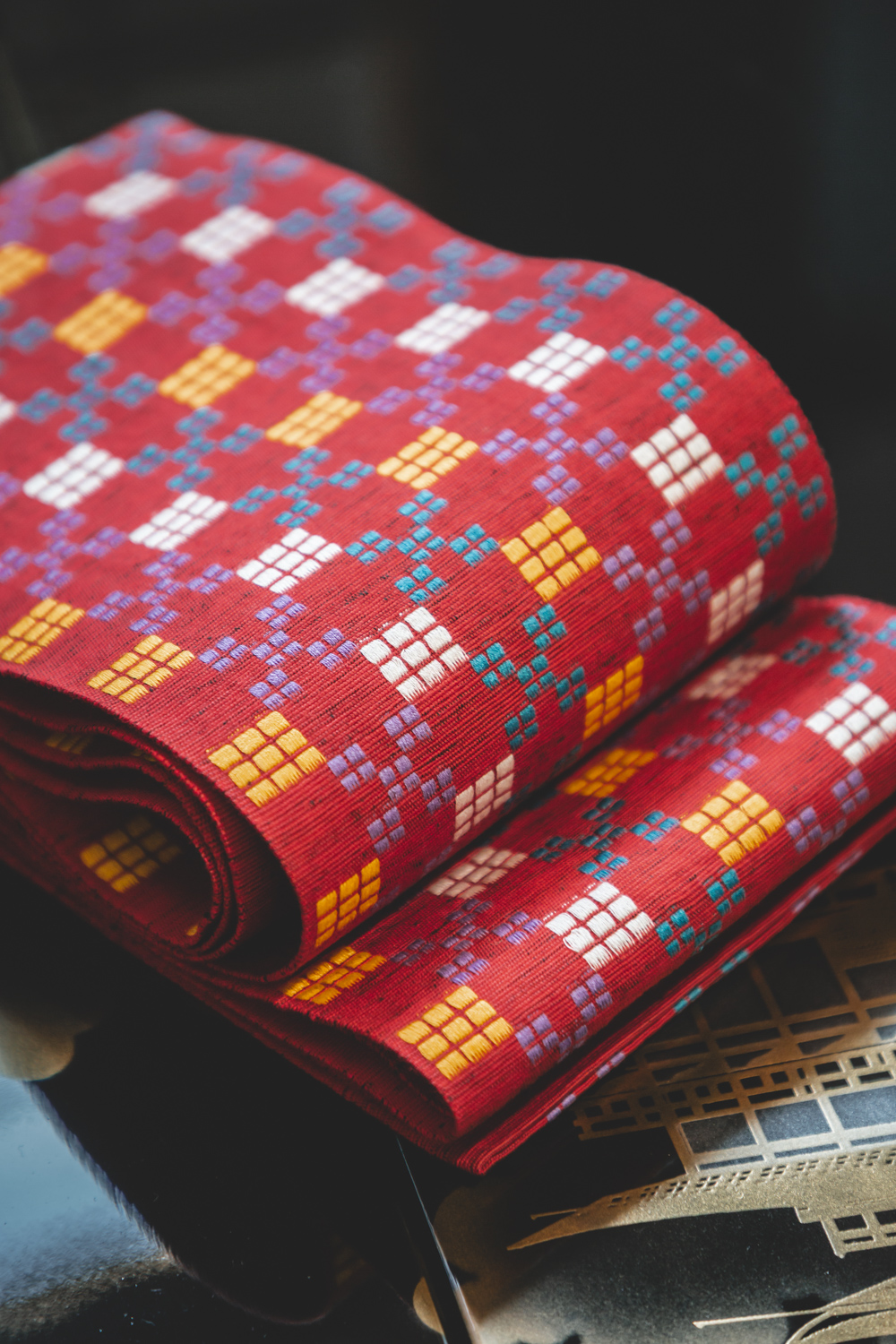 Punainen hanhaba-obi, jossa on ruutukuvio valkoisen, keltaisen, sinisen ja violetin sävyissä. Obin kääntöpuoli on yksivärinen punainen. Materiaaliarvio silkkiä. Leveys 15,5 cm, pituus 350 cm.