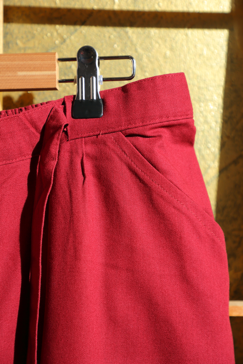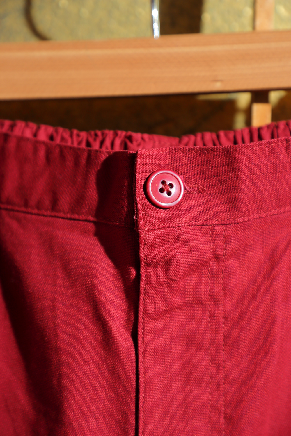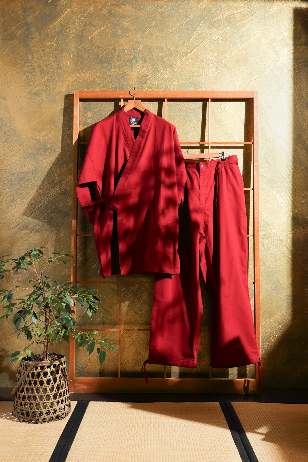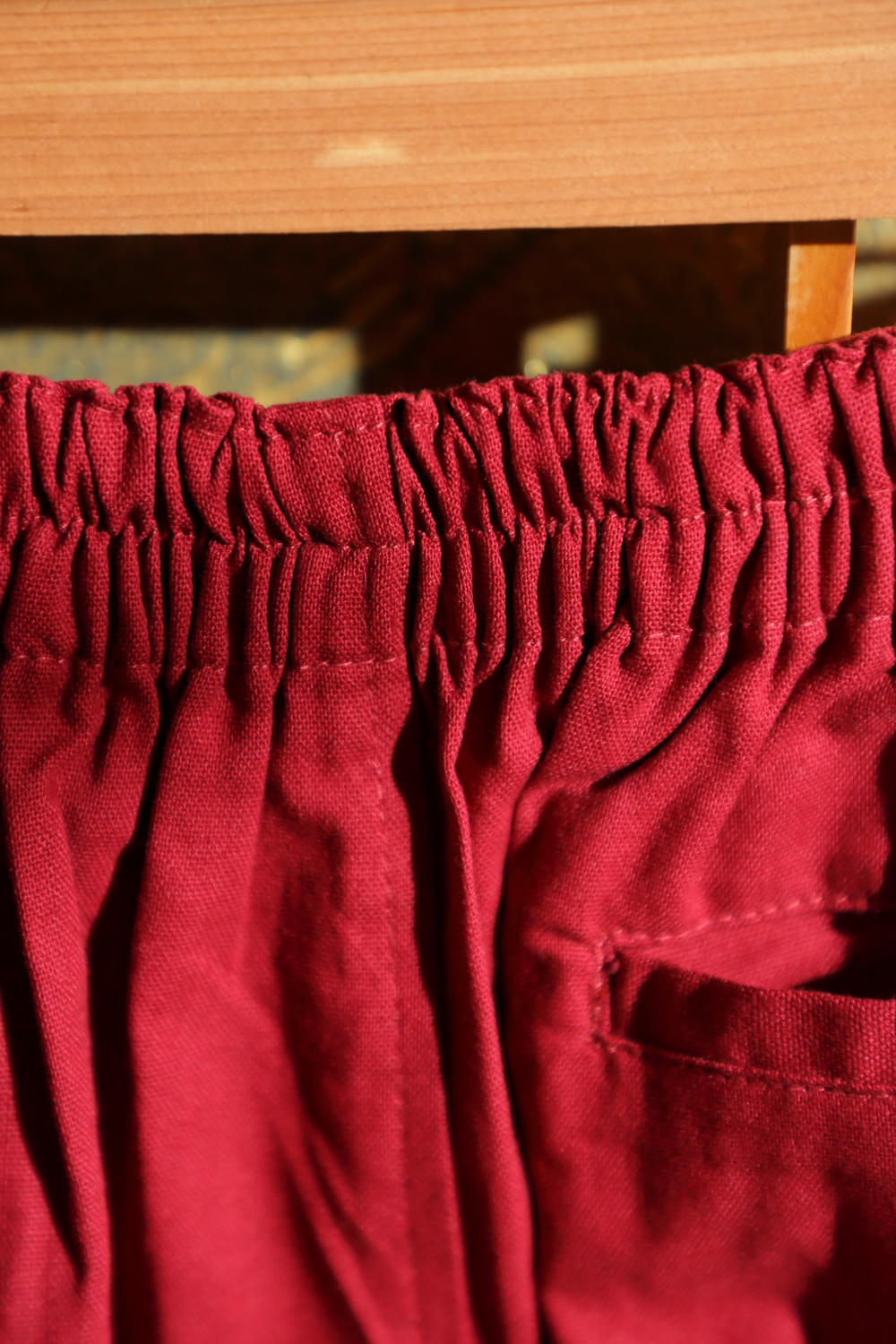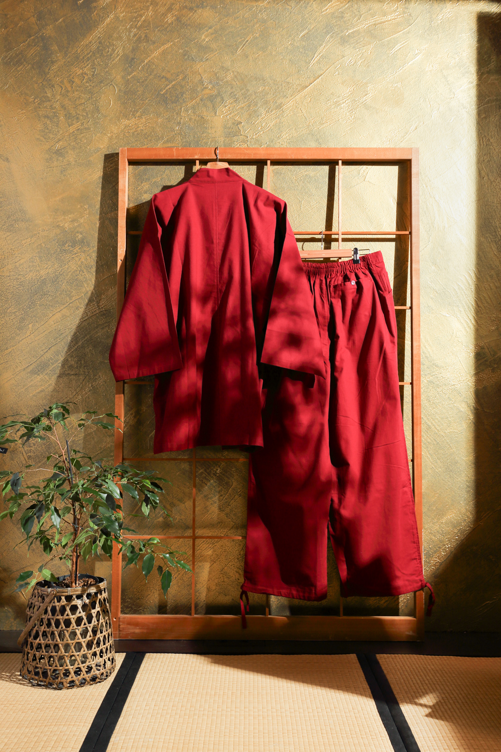 Punainen samue eli työskentelyasu, joka soveltuu hyvin esimerkiksi puutarhatöihin ja kotona oleskeluun. Kangas on pehmeää ja paksuhkoa. Housuissa on kuminauhavyötärö, nappi, vetoketju ja kiristysnauhat. Lahkeensuissa on myös nauhat kiristämistä varten. Takissa on kietaisunauhat, joiden avulla liepeet solmitaan paikoilleen. Takin molemmissa liepeissä on taskut.