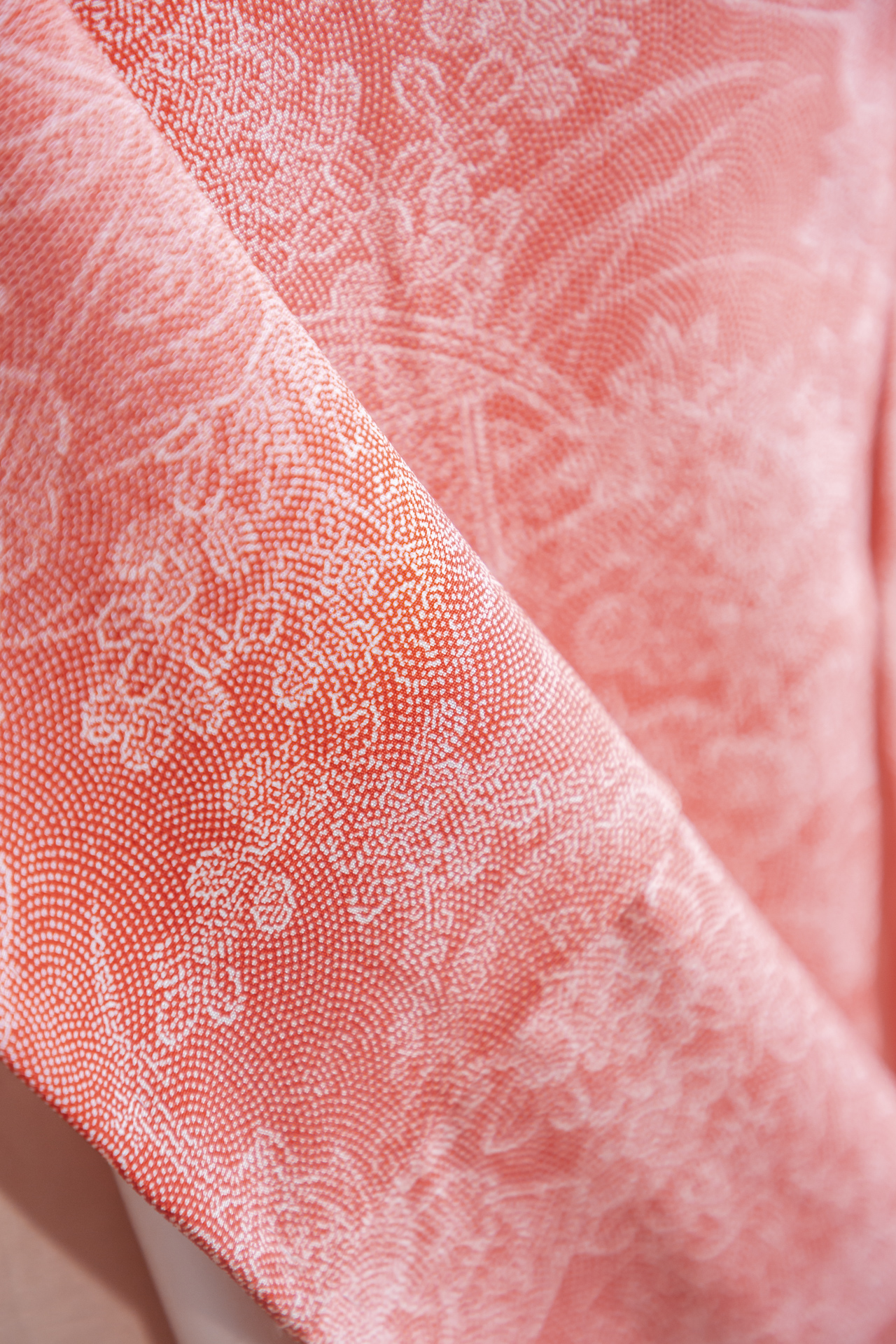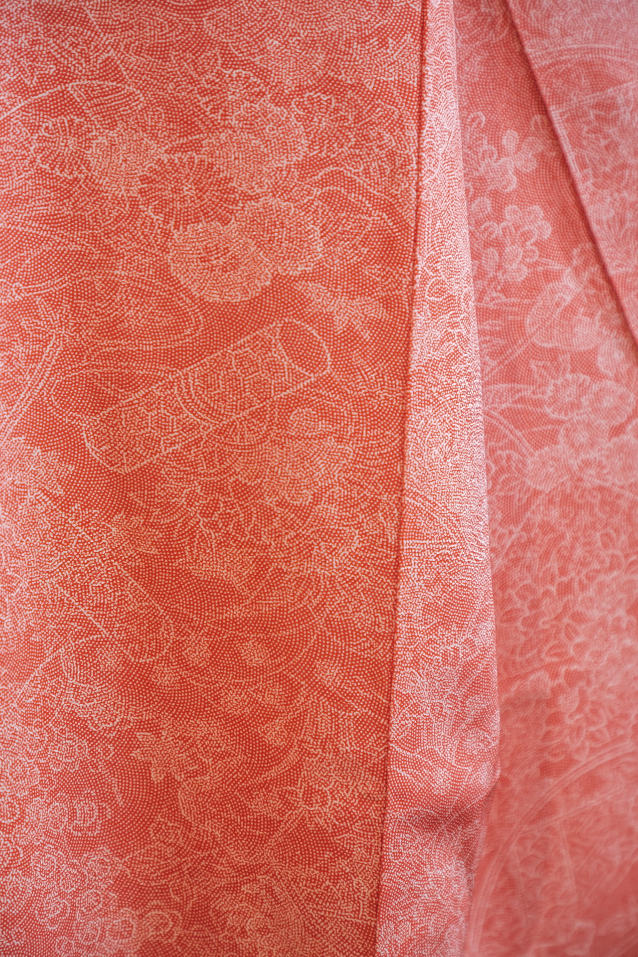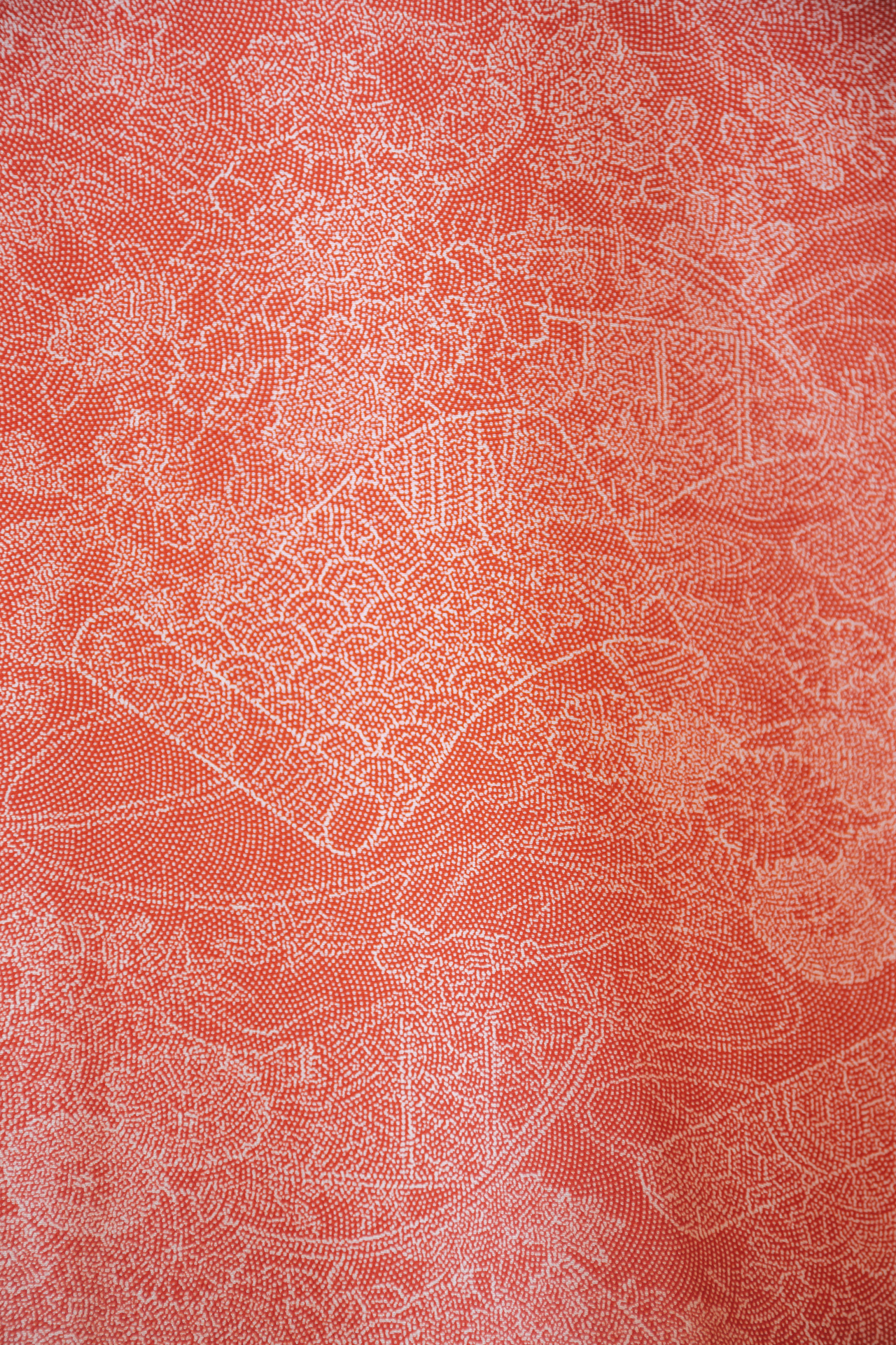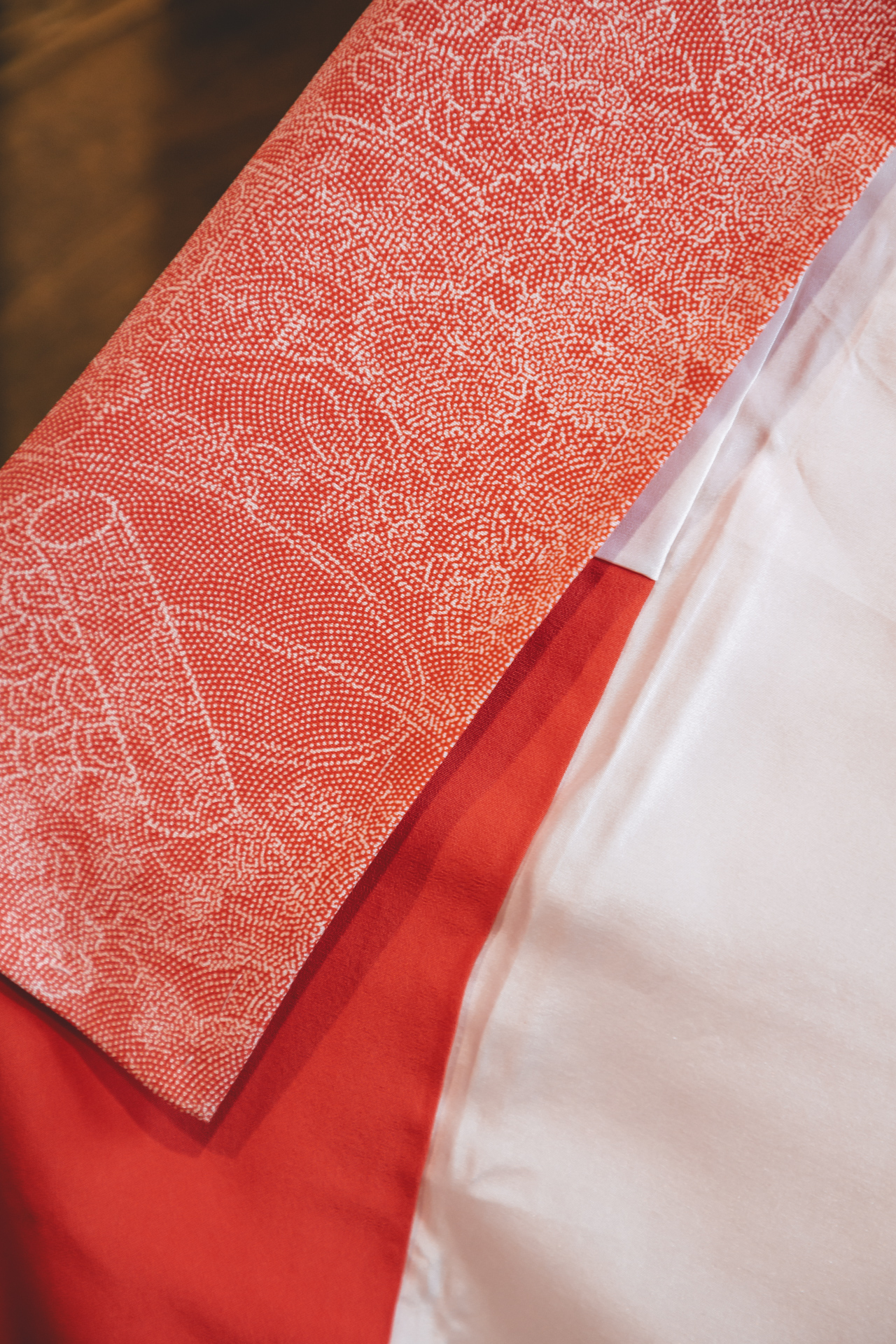Punavalkoinen edokomon-kimono, johon on kuvattu muun muassa pieniä kukkia ja muita onnea tuovia aiheita. Edokomon on kuviointitapa, jossa kuviointi muodostuu pienistä pisteistä, jotka jatkuvat samanlaisena koko kimonossa. Kangas on sileää ja viileän tuntuista. Kimonossa on valkoinen ja punainen vuorikangas.