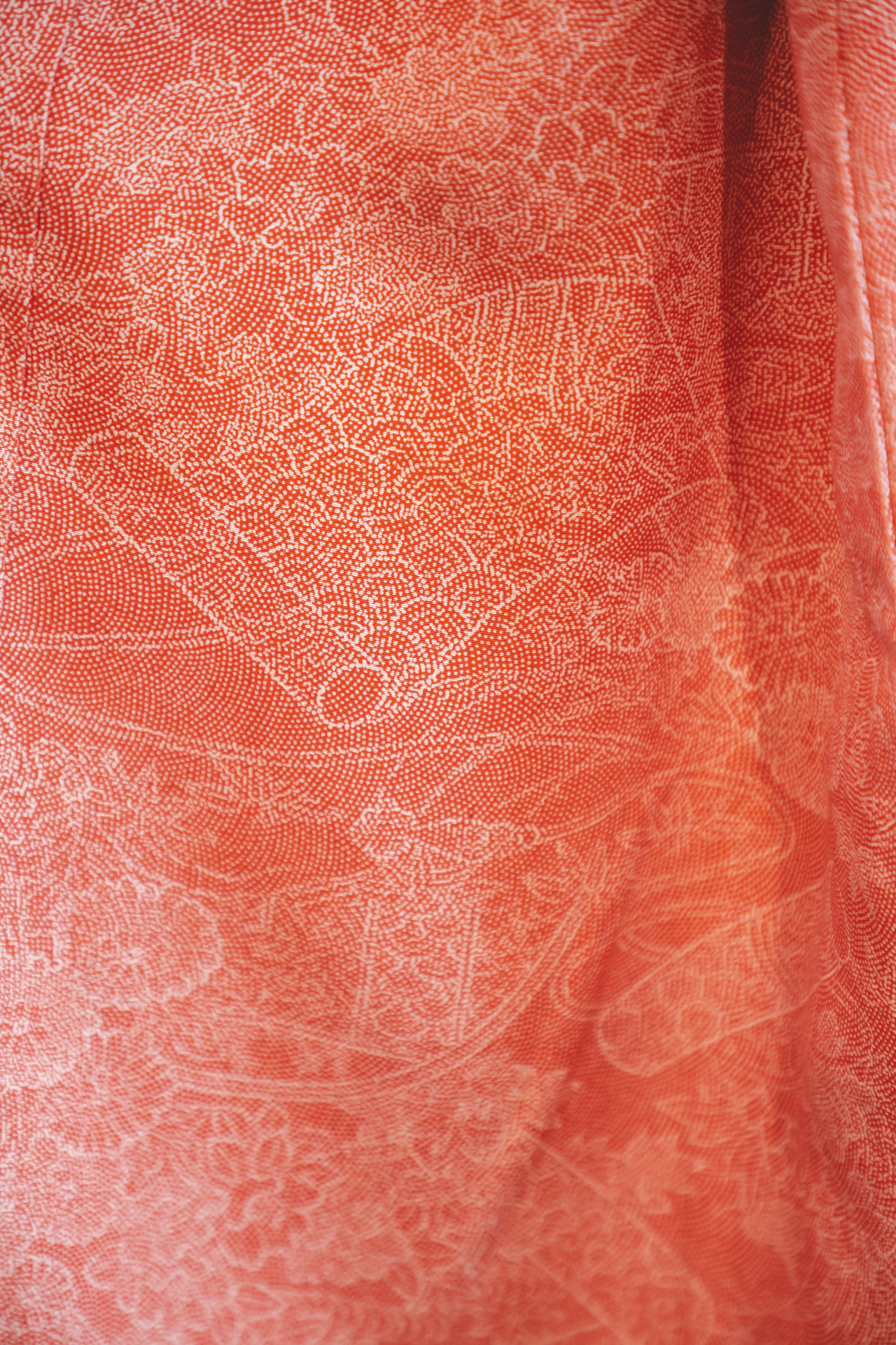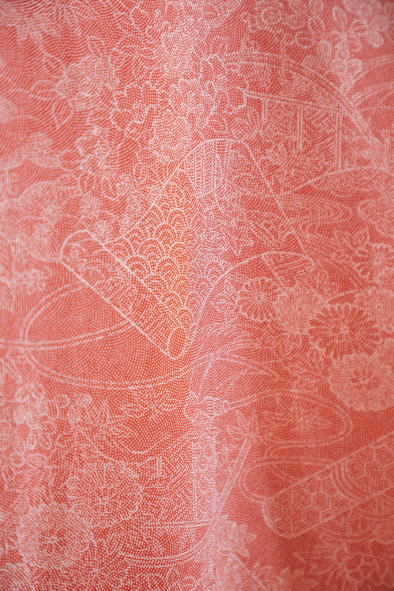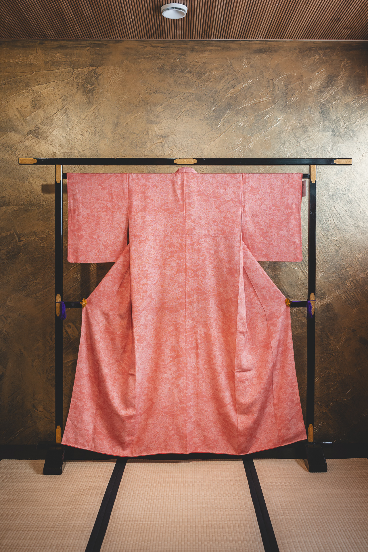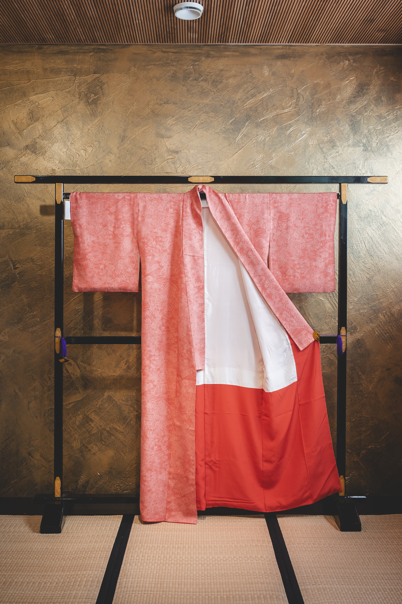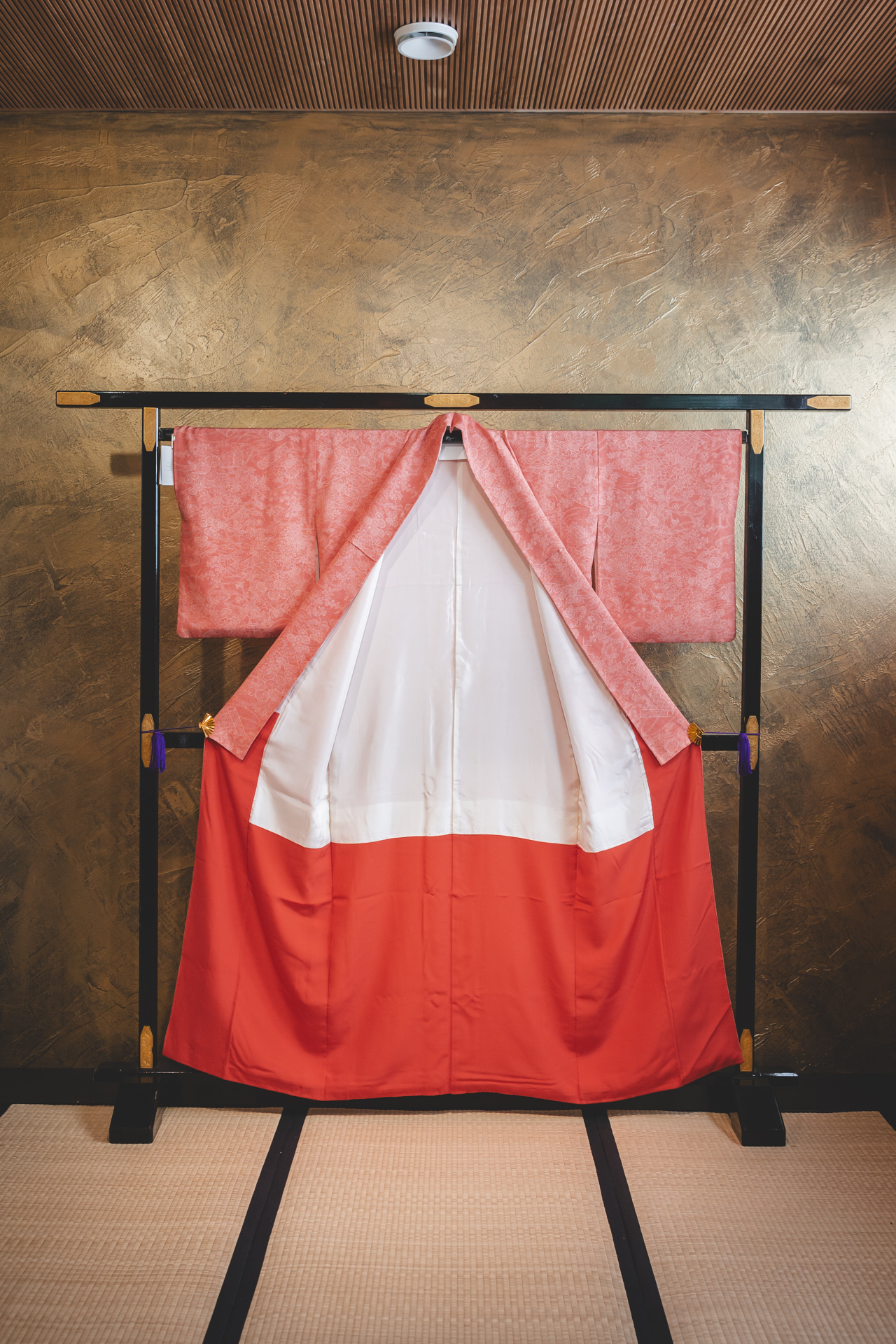 Punavalkoinen edokomon-kimono, johon on kuvattu muun muassa pieniä kukkia ja muita onnea tuovia aiheita. Edokomon on kuviointitapa, jossa kuviointi muodostuu pienistä pisteistä, jotka jatkuvat samanlaisena koko kimonossa. Kangas on sileää ja viileän tuntuista. Kimonossa on valkoinen ja punainen vuorikangas.