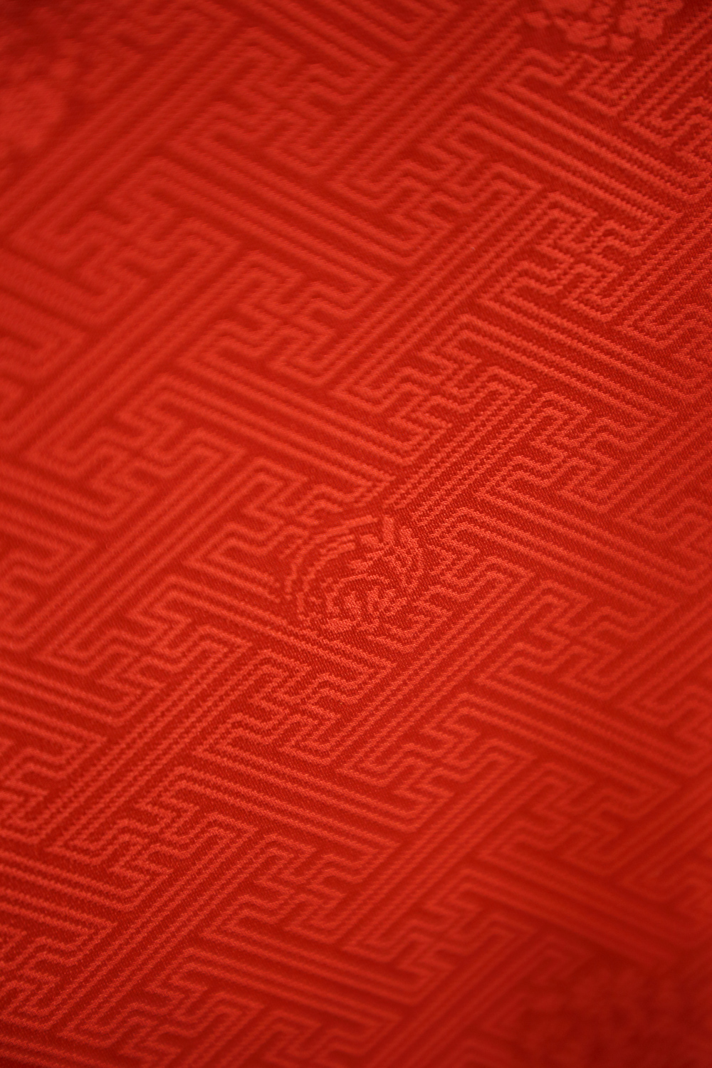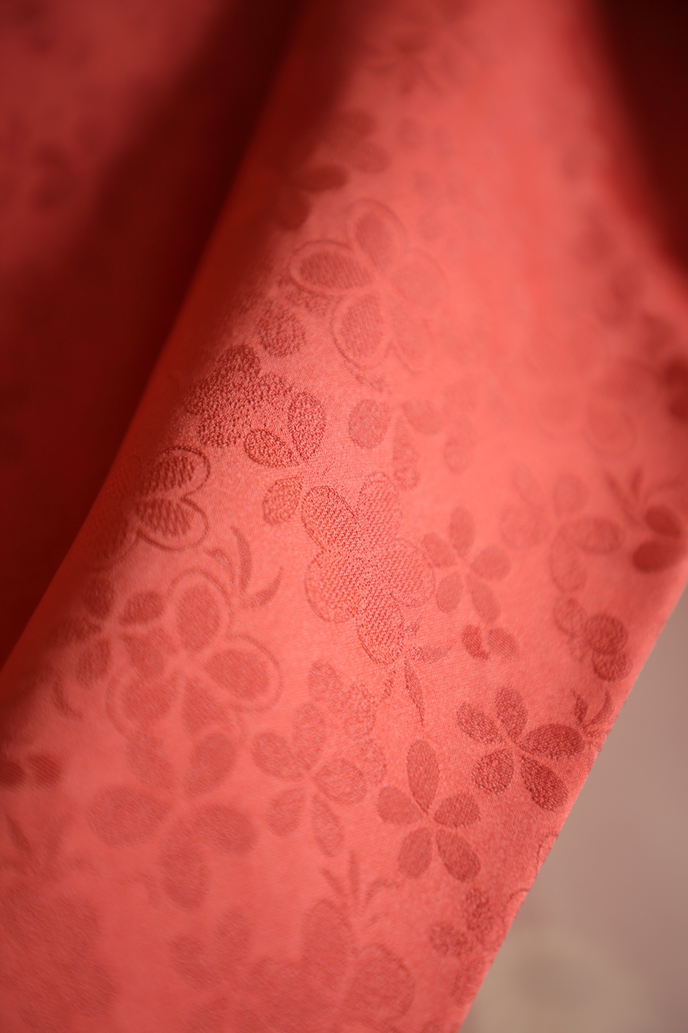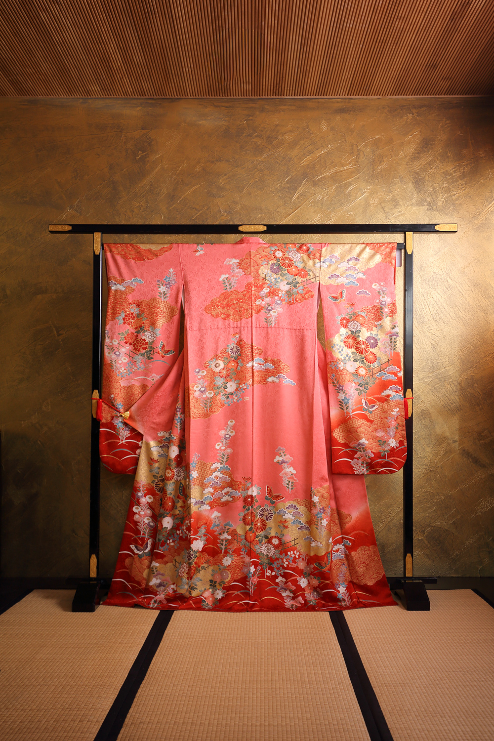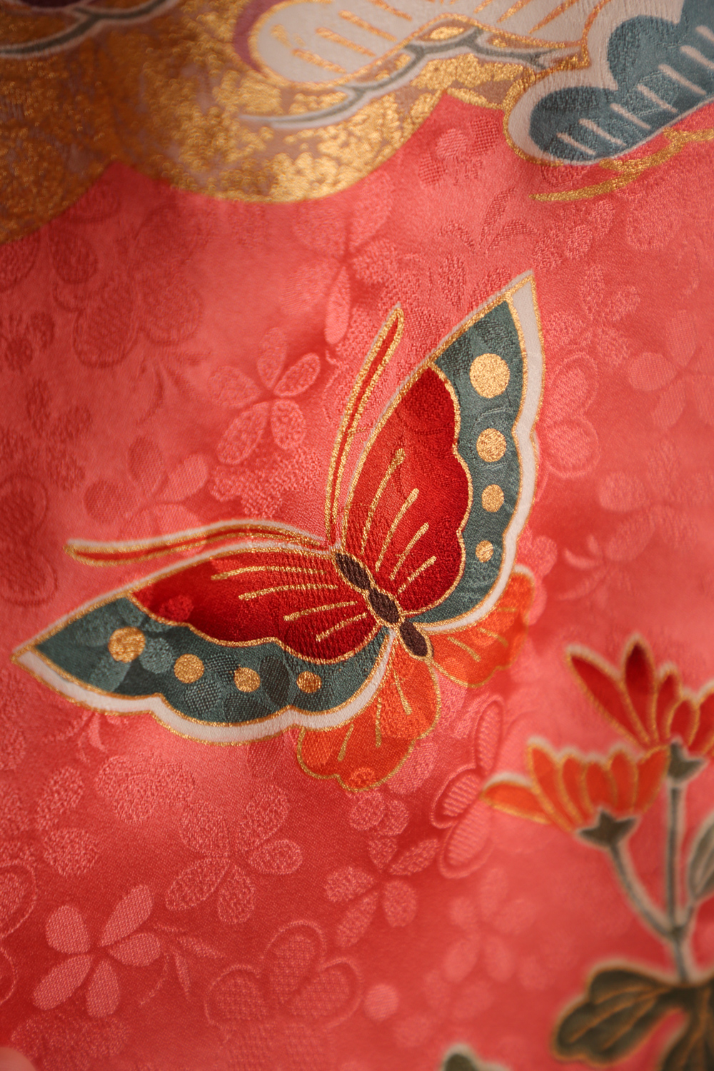 Roosan ja tumman punaisen sävyinen furisode-kimono, johon on kuvattu kultaisia pilviä, perhosia ja erilaisia kasveja, kuten krysanteemeja, pioneja, iiriksiä ja mäntyjä. Osa kuviosta on kirjailtu kultalangalla. Kangas on sileää, pehmeää ja painavaa. Kimonossa on valkoinen vuorikangas, jonka alaosa on tiilenpunaista silkkiä.