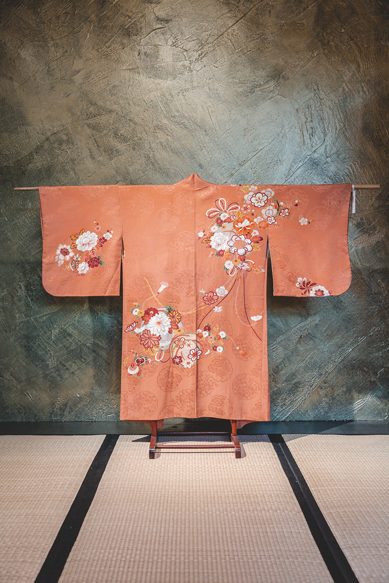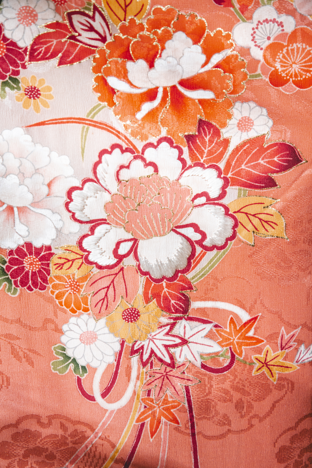 Roosa antiikkihaori, johon on kuvattu muun muassa luumunkukkia, krysanteemeja ja pioneja eri väreissä. Osa kuviosta on myös kirjailtu silkkilangalla. Kangas on sileää, pehmeää ja hieman painavaa. Haorissa on kirjava vuorikangas, jossa on muun muassa virtaavaa vettä, lintuja, kukkivia luumupuun oksia ja putoavia syksyn lehtiä.