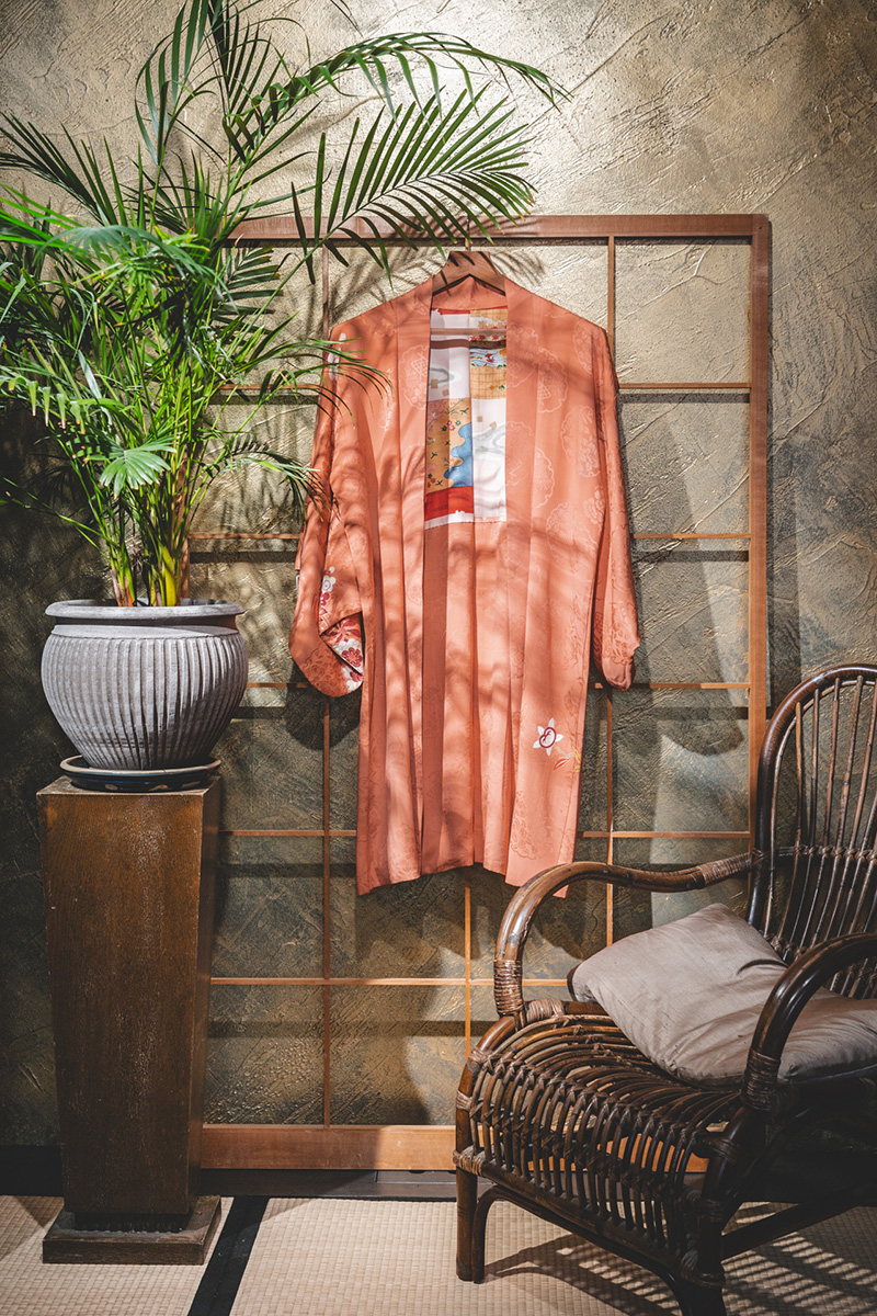 Huomaathan, että haori on tarkoitettu jäämään edestä hieman auki. Haoria voi käyttää myös kääntötakkina, jolloin sisävuorin kuvioitu kangas tulee näkyviin. Tässä haorissa on valmiina suloiset solmimisnauhat, joilla haorin saa sidottua edestä väljästi.