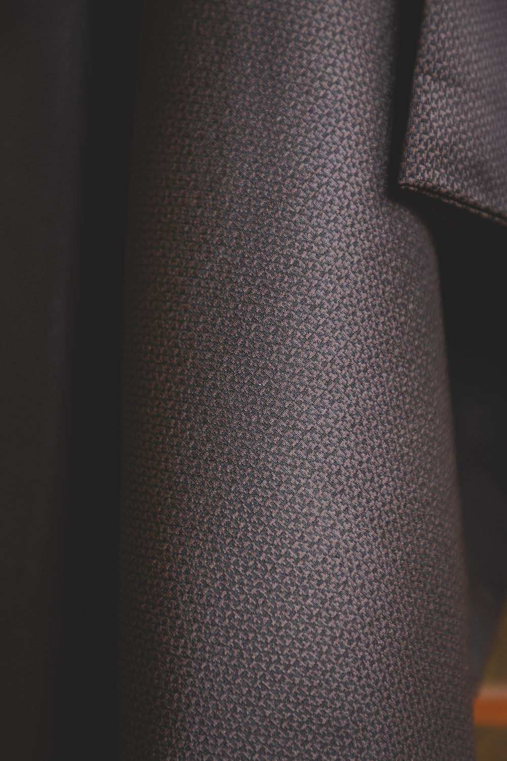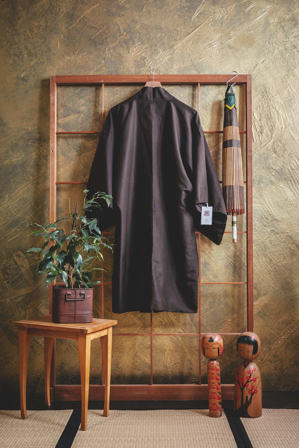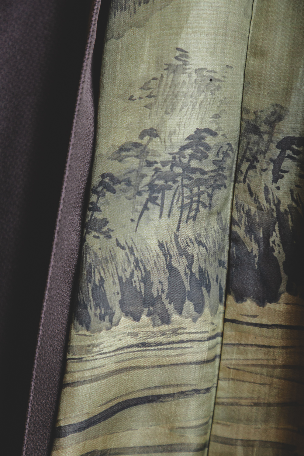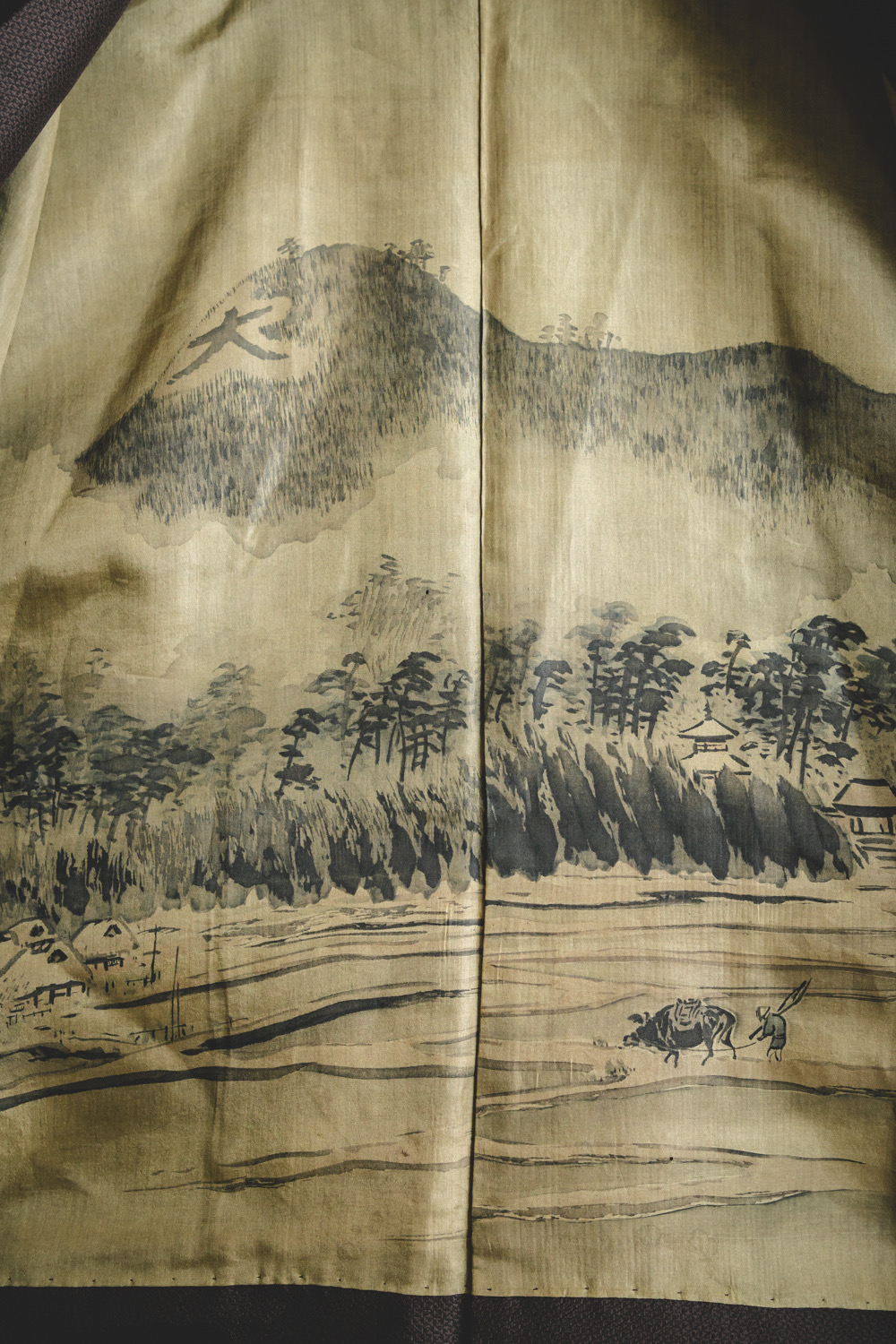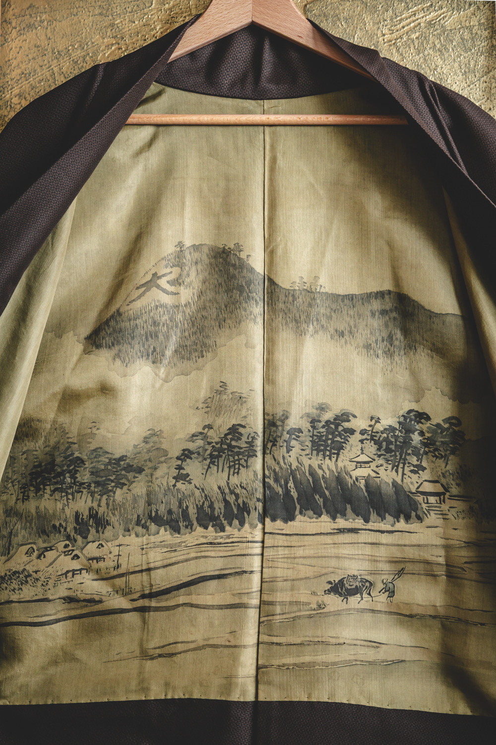 Tummanruskea miesten haori, jonka vuorikankaassa on maisemakuvio. Kuviossa näkyy Kioton maalaismaisemaa ja tunnettu Daimonji-kokko (tai sen jäänteet). Päällikangas on pehmeää, sileää ja ryhdikästä.