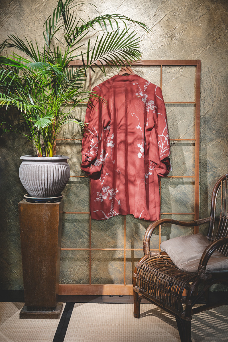 Huomaathan, että haori on tarkoitettu jäämään edestä hieman auki. Haoria voi käyttää myös kääntötakkina, jolloin sisävuorin kuvioitu kangas tulee näkyviin. Voimme lisätä haoriin suloiset solmimisnauhat (8€), joilla haorin saa sidottua edestä väljästi.